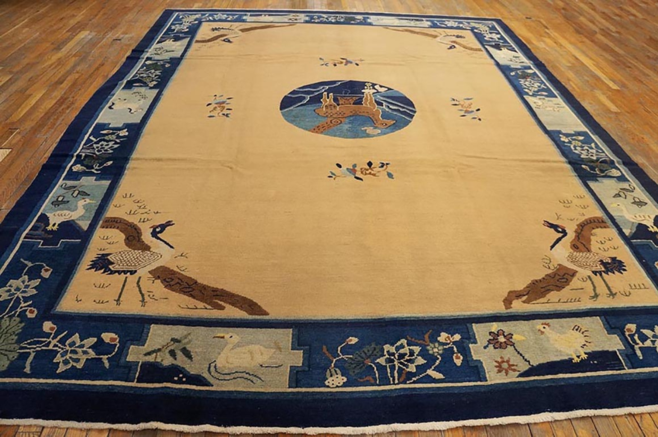 Knotted Antique Ivory 1920s Wool Room Size Chinese – Peking Rectangle Rug, Circa Date: 1920s. This exceptional example of early 20th-century Chinese weaving represents the pinnacle of the Peking style, characterized by its open field and restrained color palette. It stands as a superb addition to any collection of antique rugs.