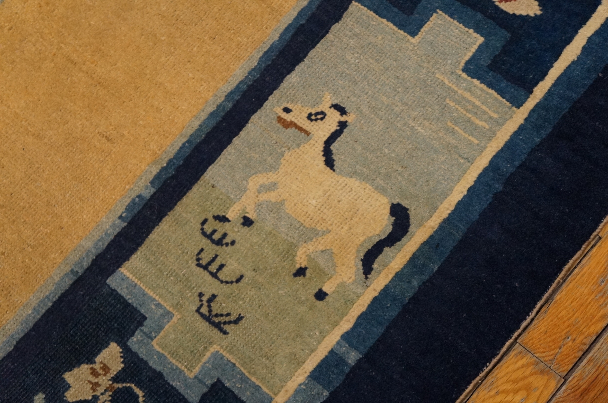 The expansive central field is rendered in a soft, luminous ivory color, providing a sophisticated backdrop for the sparse, symbolic decoration. This deliberate use of negative space is a hallmark of the period, allowing the rich texture of the wool to be fully appreciated while emphasizing the deep contrast provided by the navy and teal border.