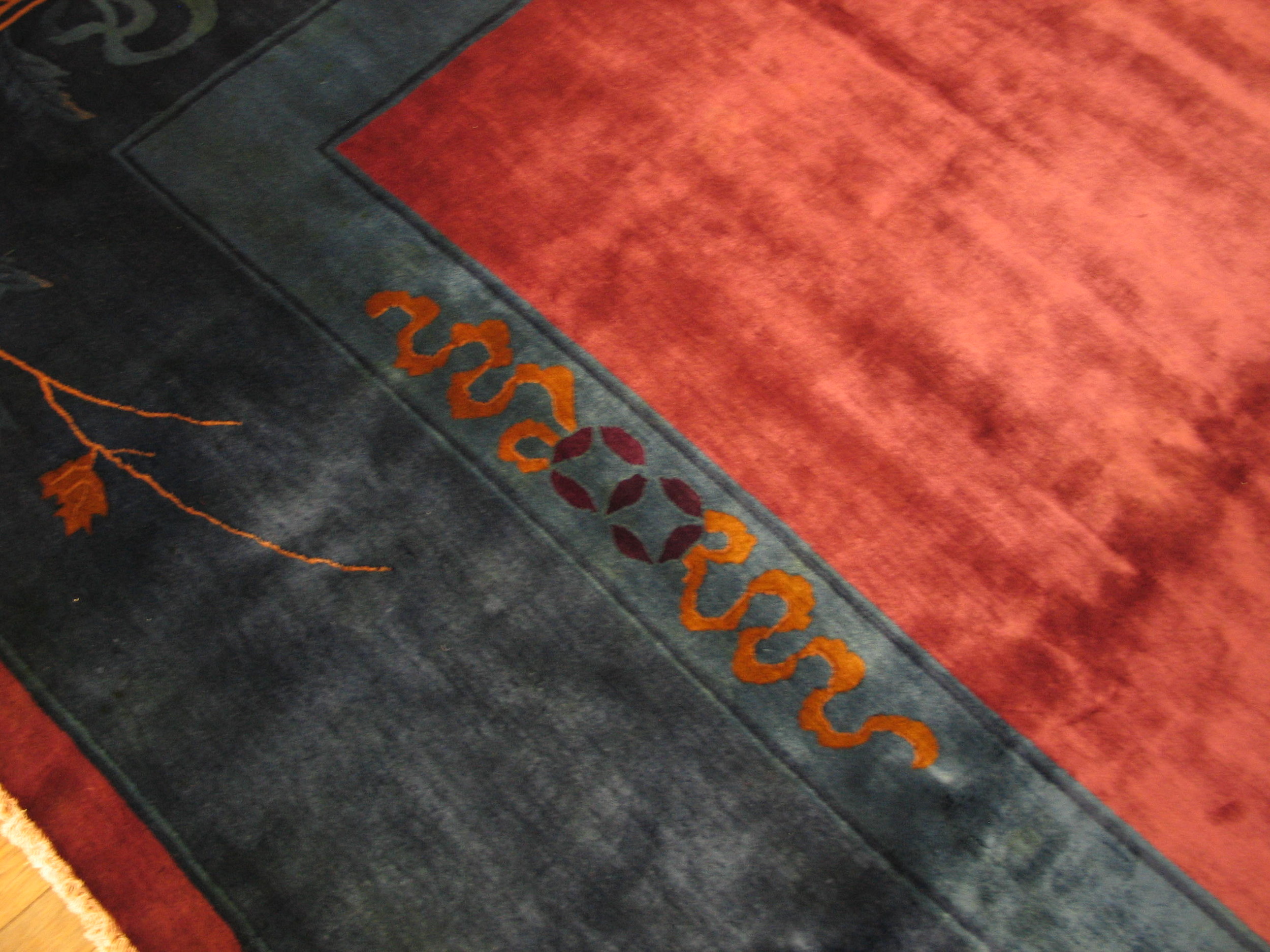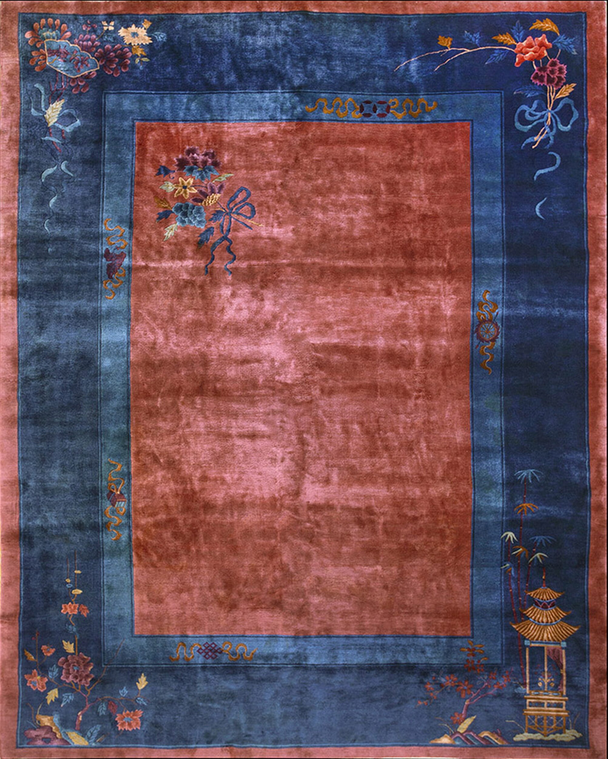 Knotted Chinese – Art Deco Antique Room Size Wool Rectangle 1920s Coral Rug, Circa Date: 1920s. This exceptional example of early 20th-century weaving embodies the fusion of traditional Chinese craftsmanship with the bold, simplified aesthetic of the Art Deco movement. Its generous scale qualifies it as a true room size rug, ideal for anchoring a sophisticated interior space with historical depth.