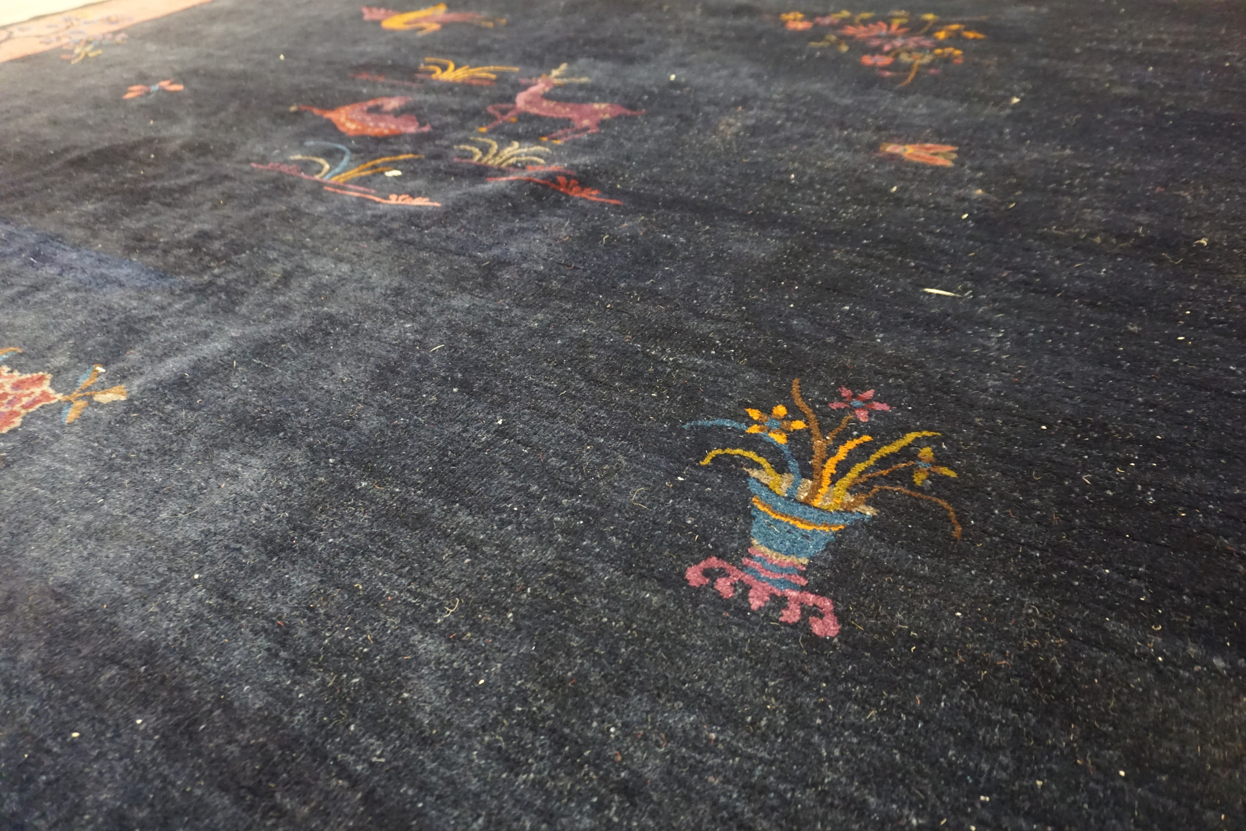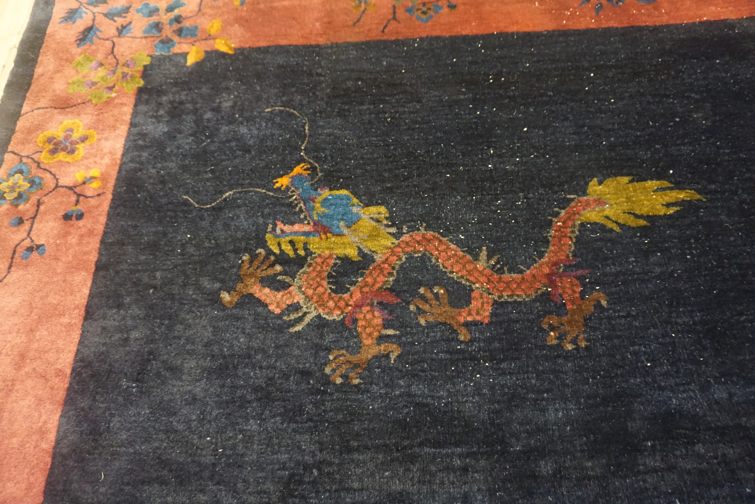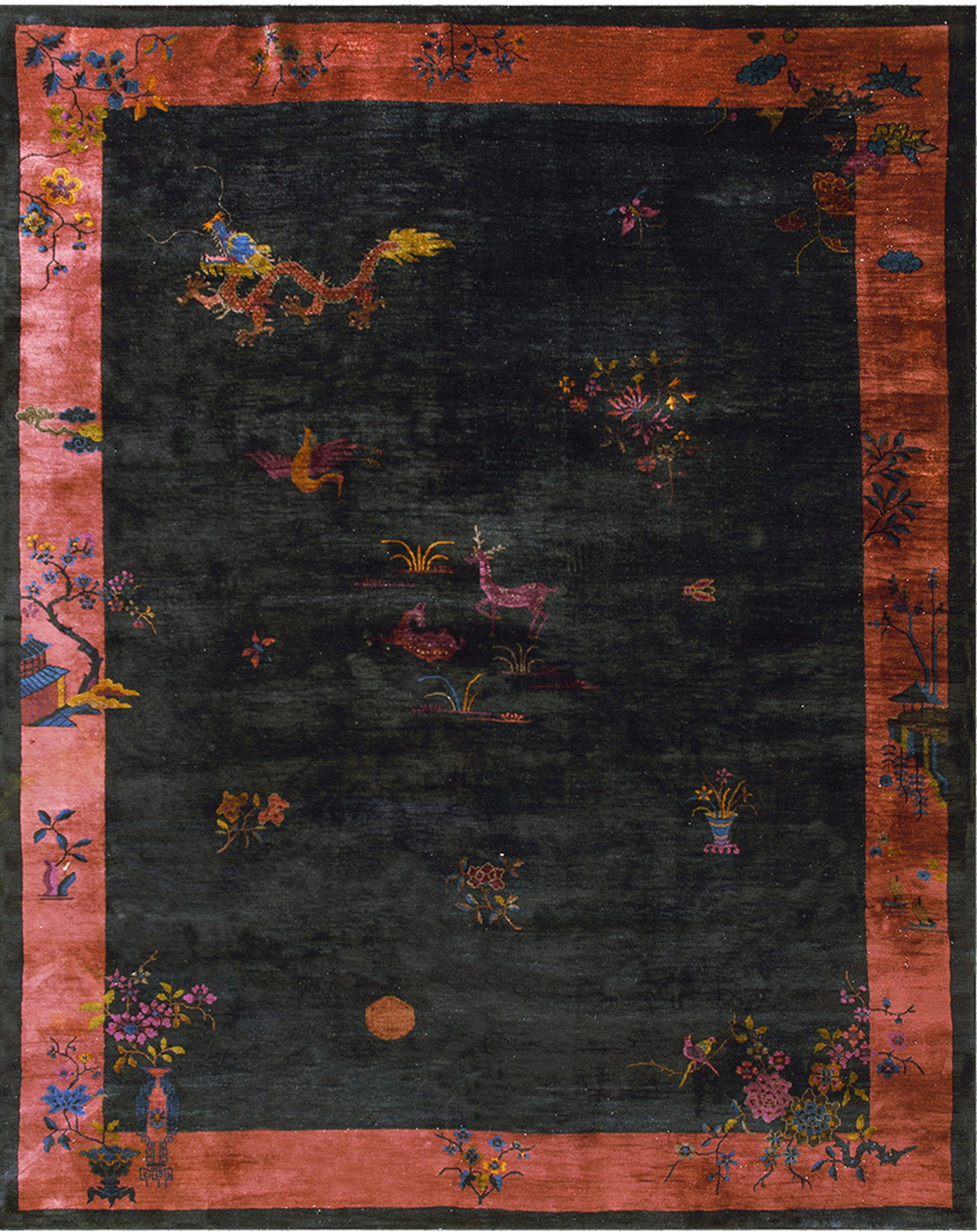 The primary field is executed in a deep, near-black indigo, characteristic of many refined blue color rugs from this period. This saturated ground dramatically contrasts with the broad, luminous salmon-pink border. Within the field, traditional Chinese symbols—including a striking dragon, mythical phoenix, and serene deer—are rendered in vibrant, jewel-toned hues, lending the composition a dynamic and pictorial quality.