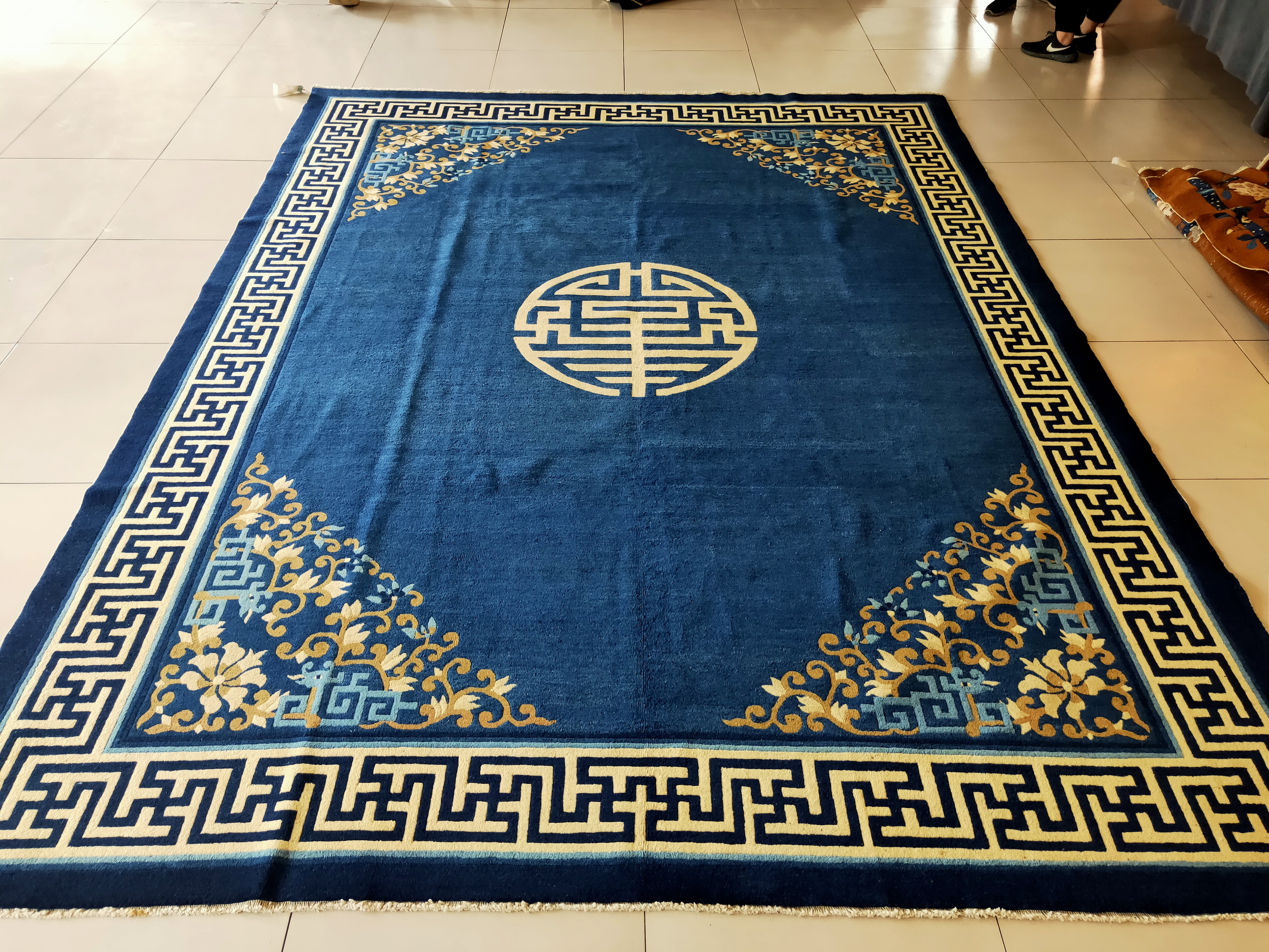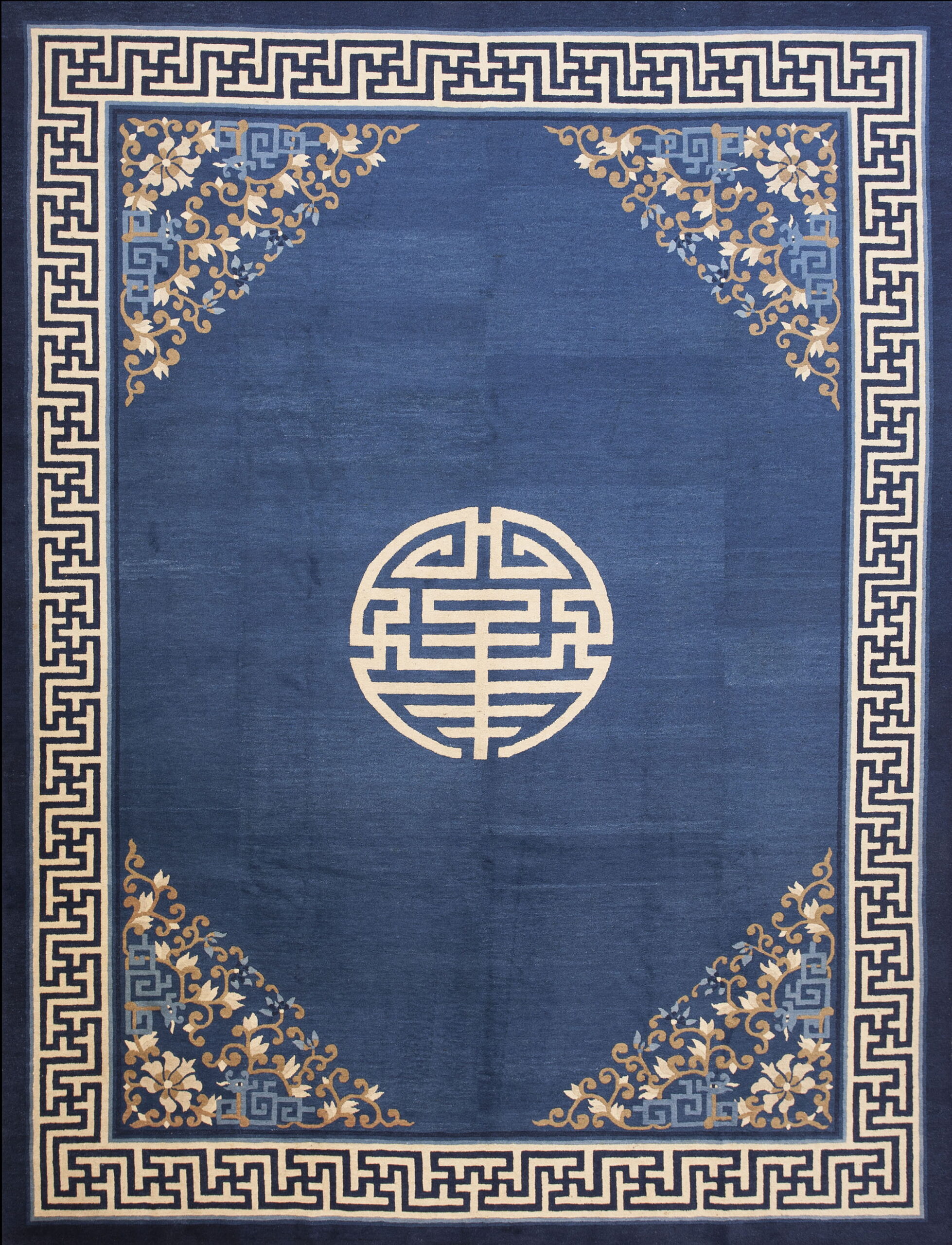 The expansive field is saturated in a magnificent indigo, contributing to the serene and sophisticated presence of this piece. The use of this deep hue places it among the most desirable blue color rugs of the period, providing a striking contrast to the central circular medallion, which depicts the traditional Shou symbol for longevity.
