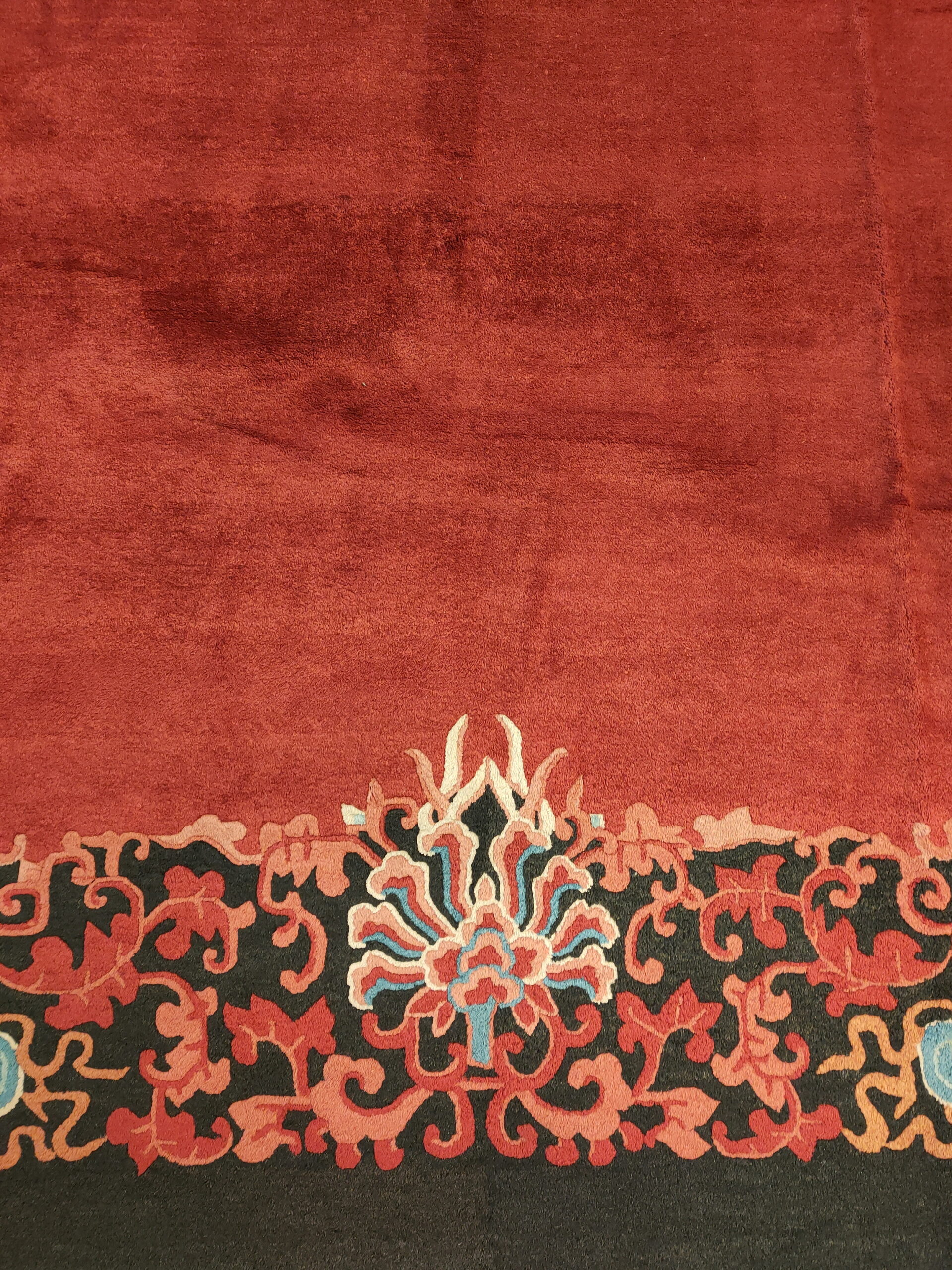 Knotted Wool Antique Coral Chinese Room Size – Art Deco 1920s Rectangle Rug, Circa Date: 1920s. This exceptional Chinese Art Deco piece captures the bold aesthetic of the roaring twenties, presented in a generous room size format ideal for anchoring a major living space.