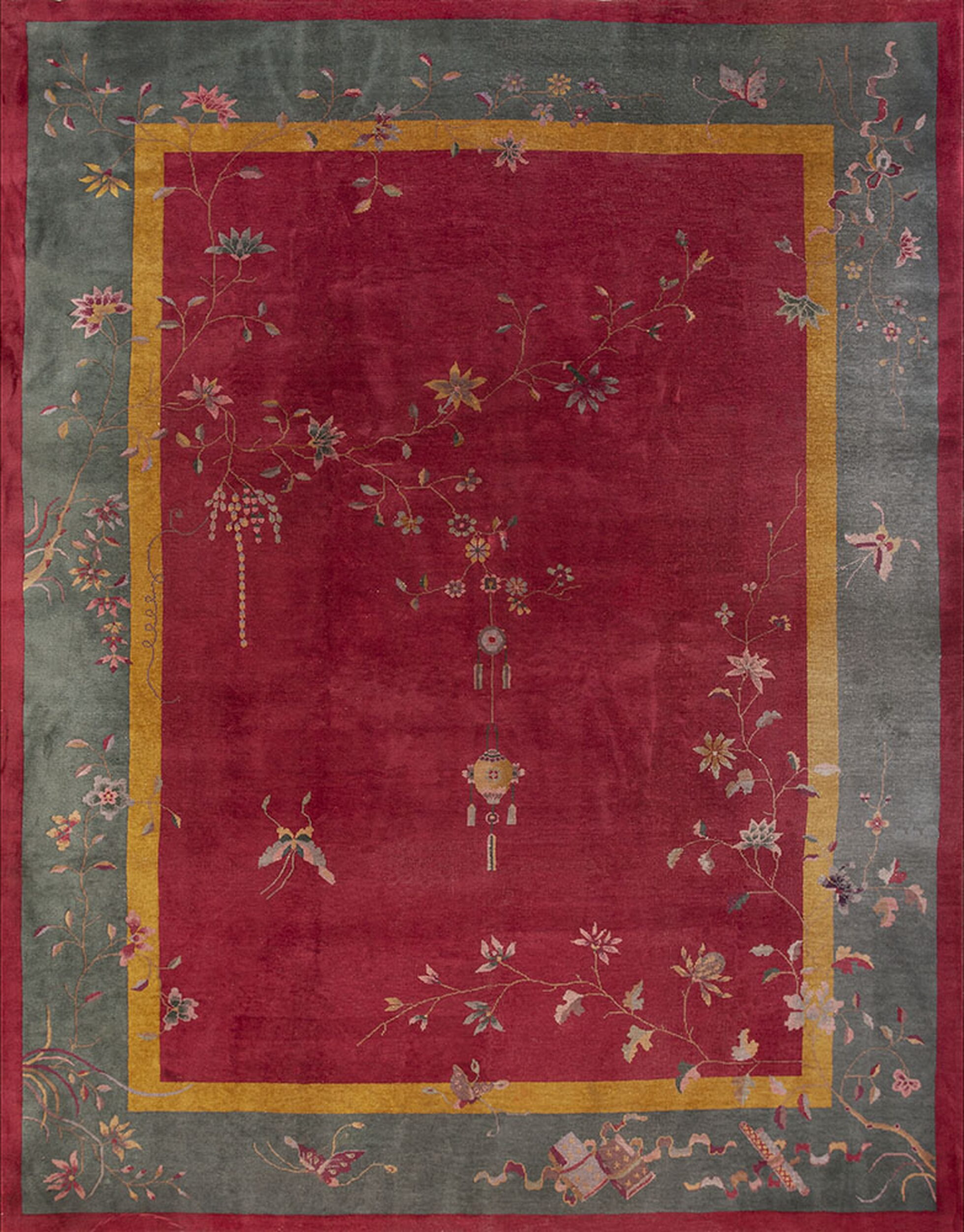 A finely rendered, asymmetrical design of trailing vines and butterflies defines the composition. This use of naturalistic imagery, combined with the high-quality knotting, is characteristic of the finest Chinese rugs of the period. The sparse placement of the imagery ensures that the overall effect remains elegant and uncluttered, a hallmark of sophisticated design.