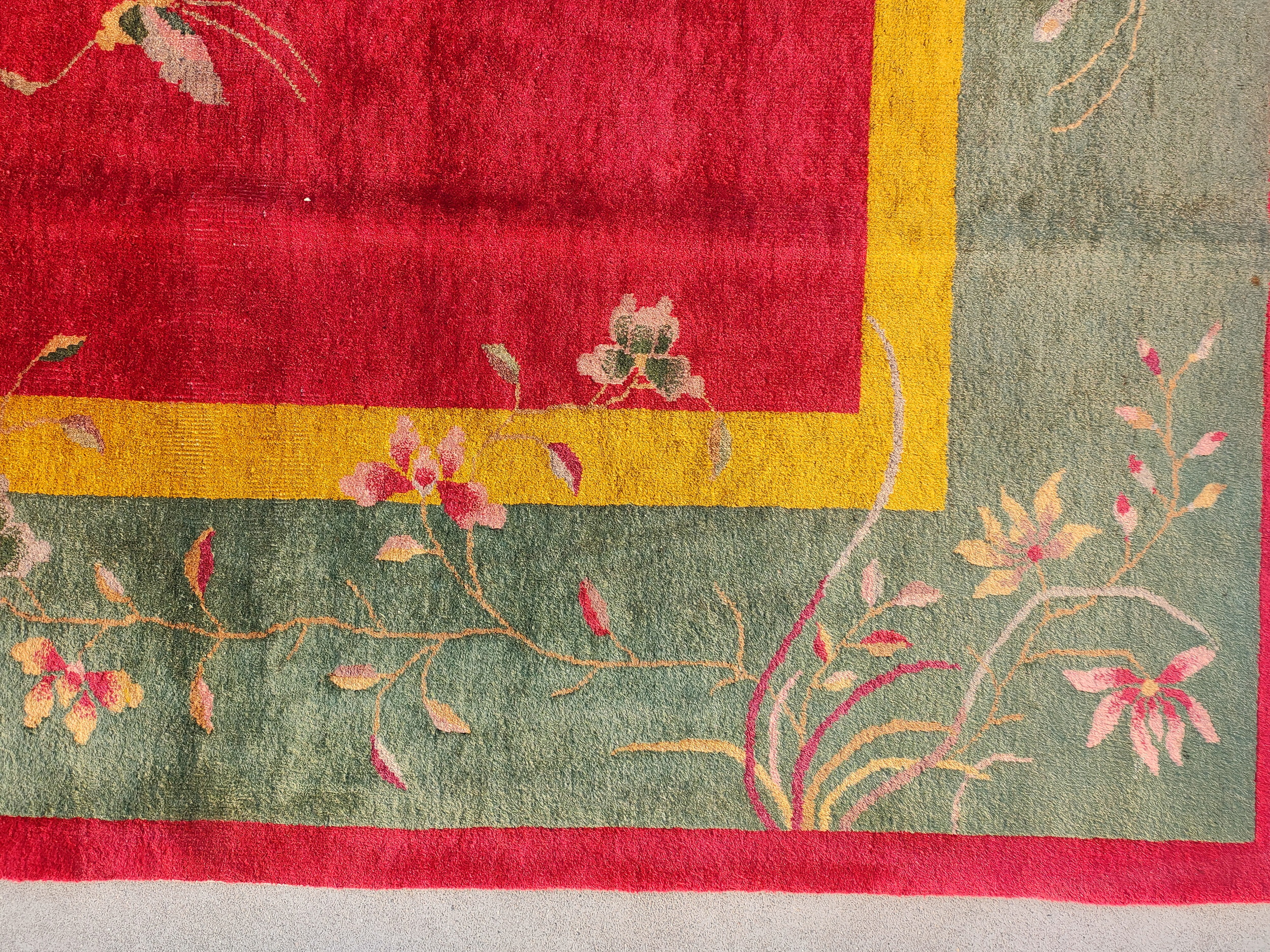 Knotted Wool Chinese Rectangle Antique Room Size – Art Deco 1920s Rug, Country of Origin: China, Circa Date: 1920s. This magnificent example of early 20th-century weaving presents a striking visual contrast, utilizing a deep, saturated magenta field framed by a sophisticated sage-grey border. Its impressive scale qualifies it as a true room size piece, designed to anchor a major living space or formal dining area.