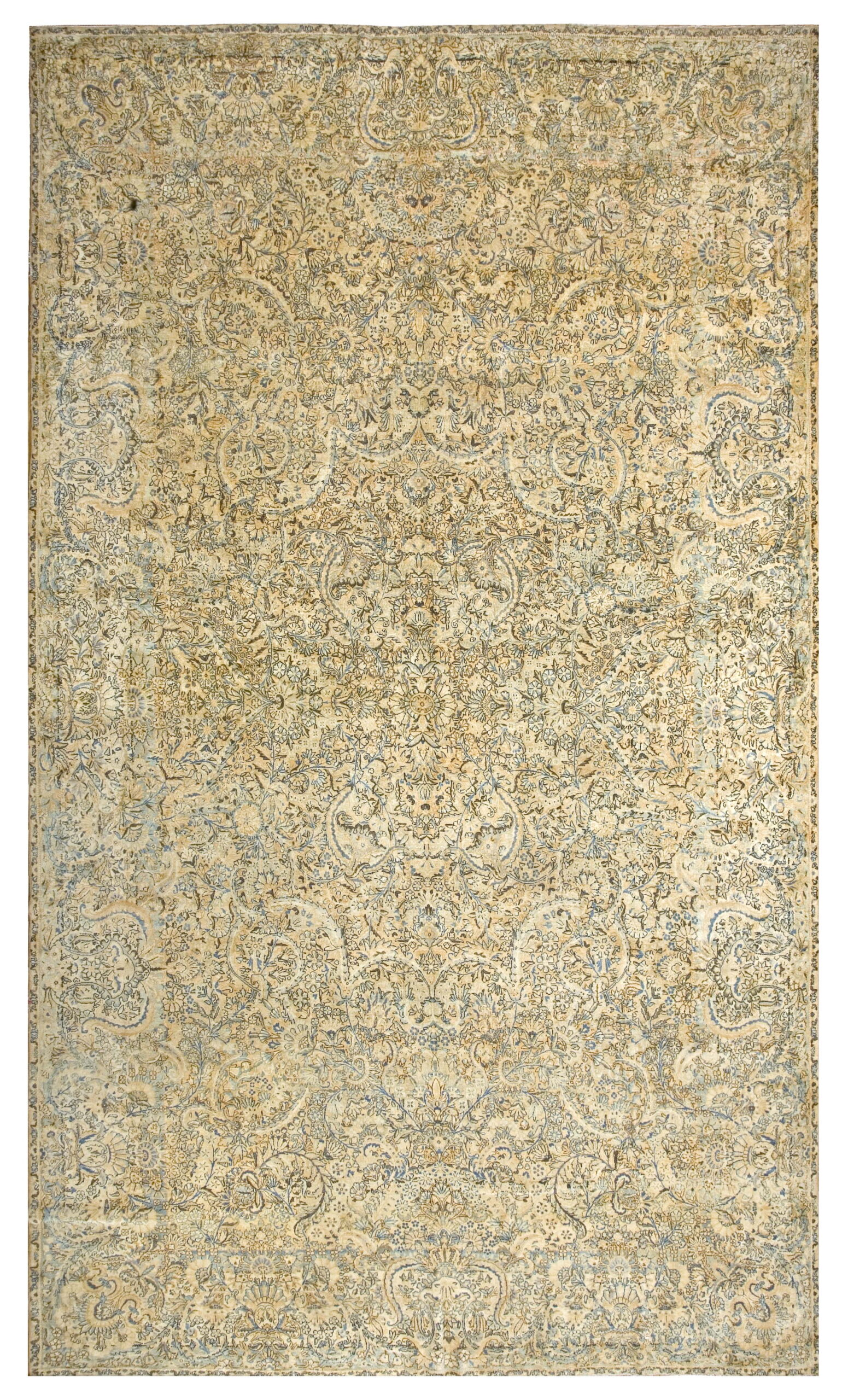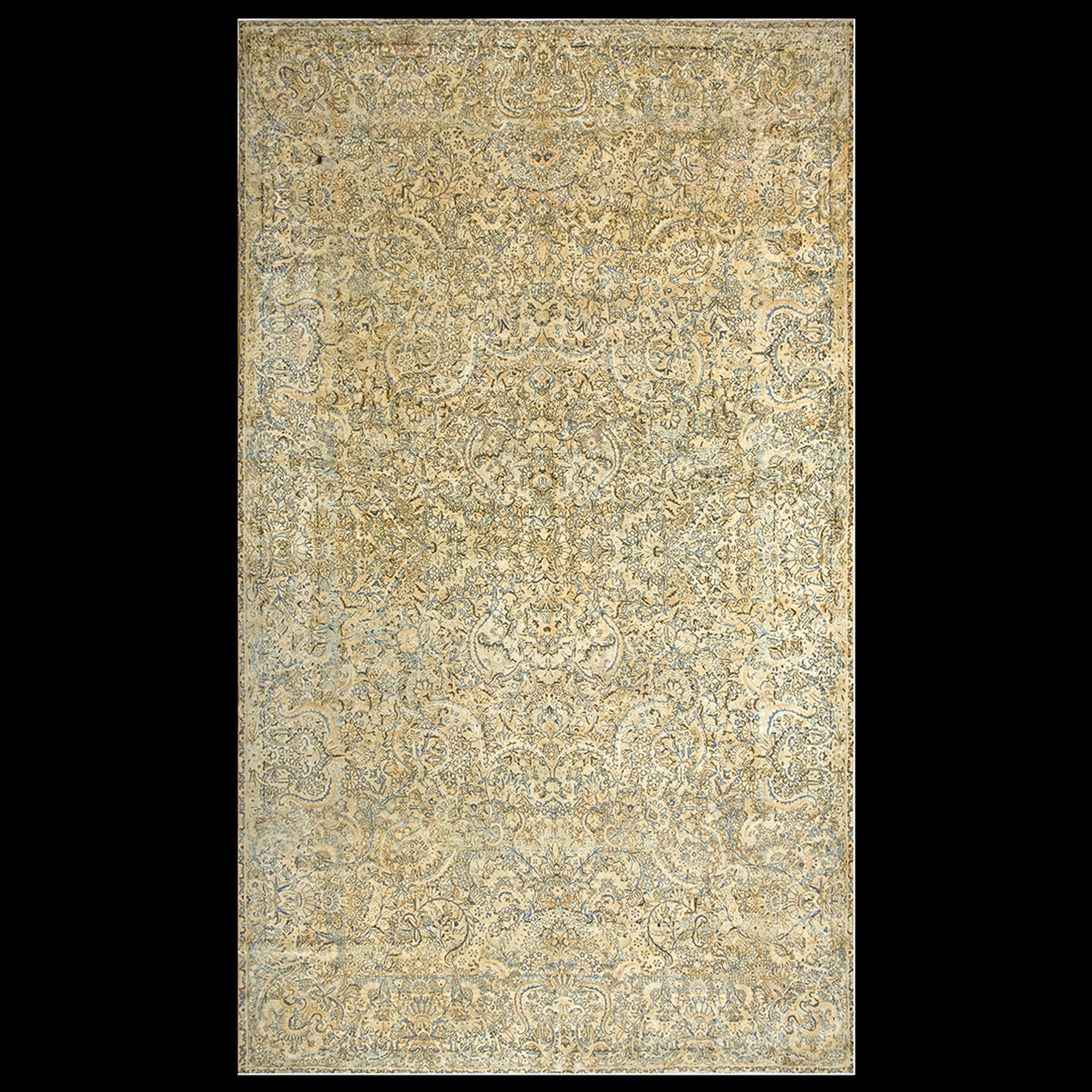 The field presents a magnificent display of intricate boteh and scrolling vine motifs, characteristic of the best Kerman rugs. The subtle palette is dominated by a gentle, aged ivory color ground, softened by delicate traces of pale blue and olive tones, achieving a sophisticated, almost monochromatic effect.