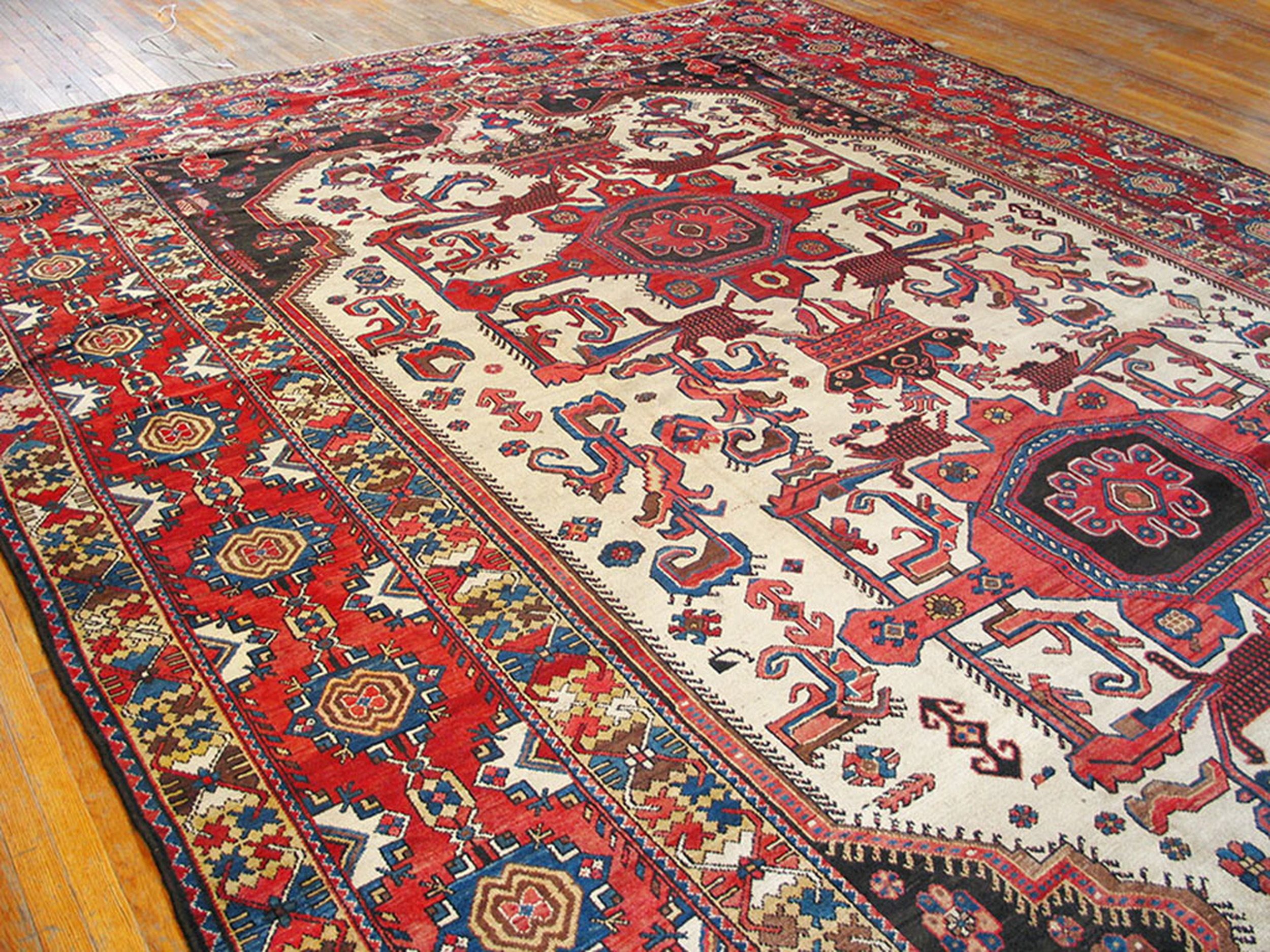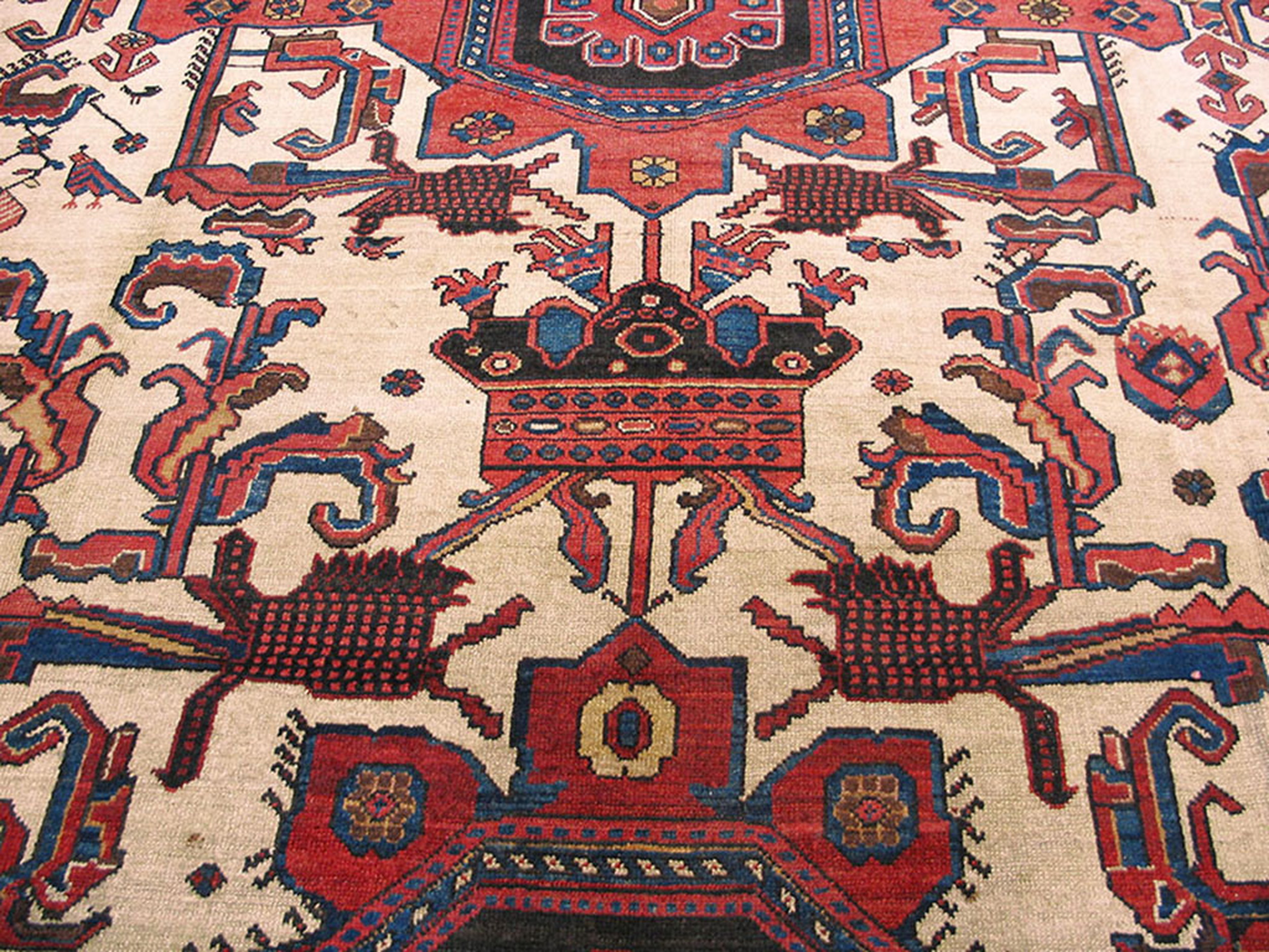 The field is dominated by a bold, central medallion and corresponding spandrels, executed with a highly stylized and captivating geometric rugs pattern. The use of deep madder red and midnight blue provides a dramatic contrast against the expansive, luminous ivory color rugs ground, highlighting the intricate zoomorphic and abstract motifs within the design’s structure.