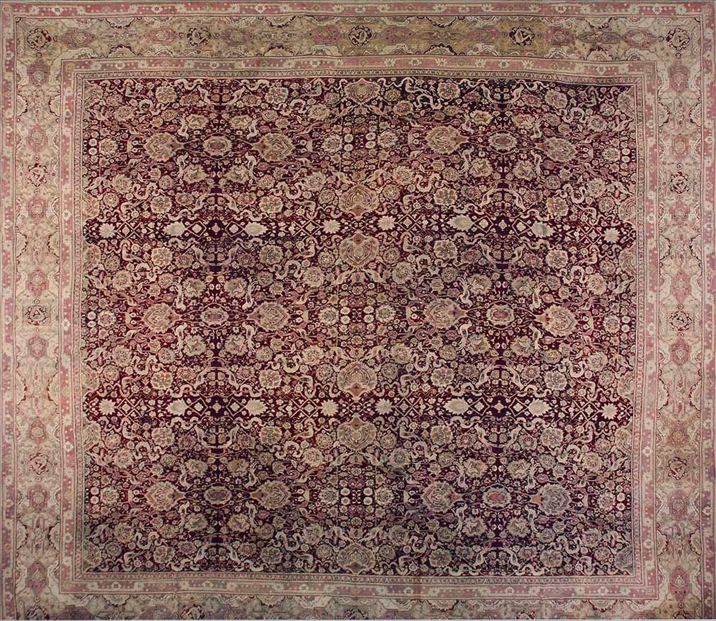 This large classic burgundy background antique mid-19th century Indian Agra carpet exemplifies the refined artistry and enduring appeal of 19th-century rugs from India. Crafted during a period when Indian workshops were interpreting and elevating classical design traditions, this big oversized carpet brings together timeless pattern language, finely detailed composition, and a rich, inviting color palette.
