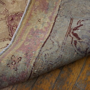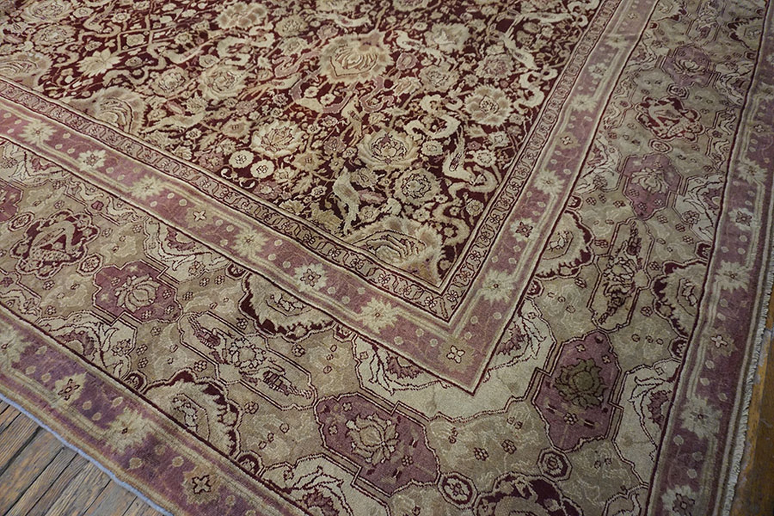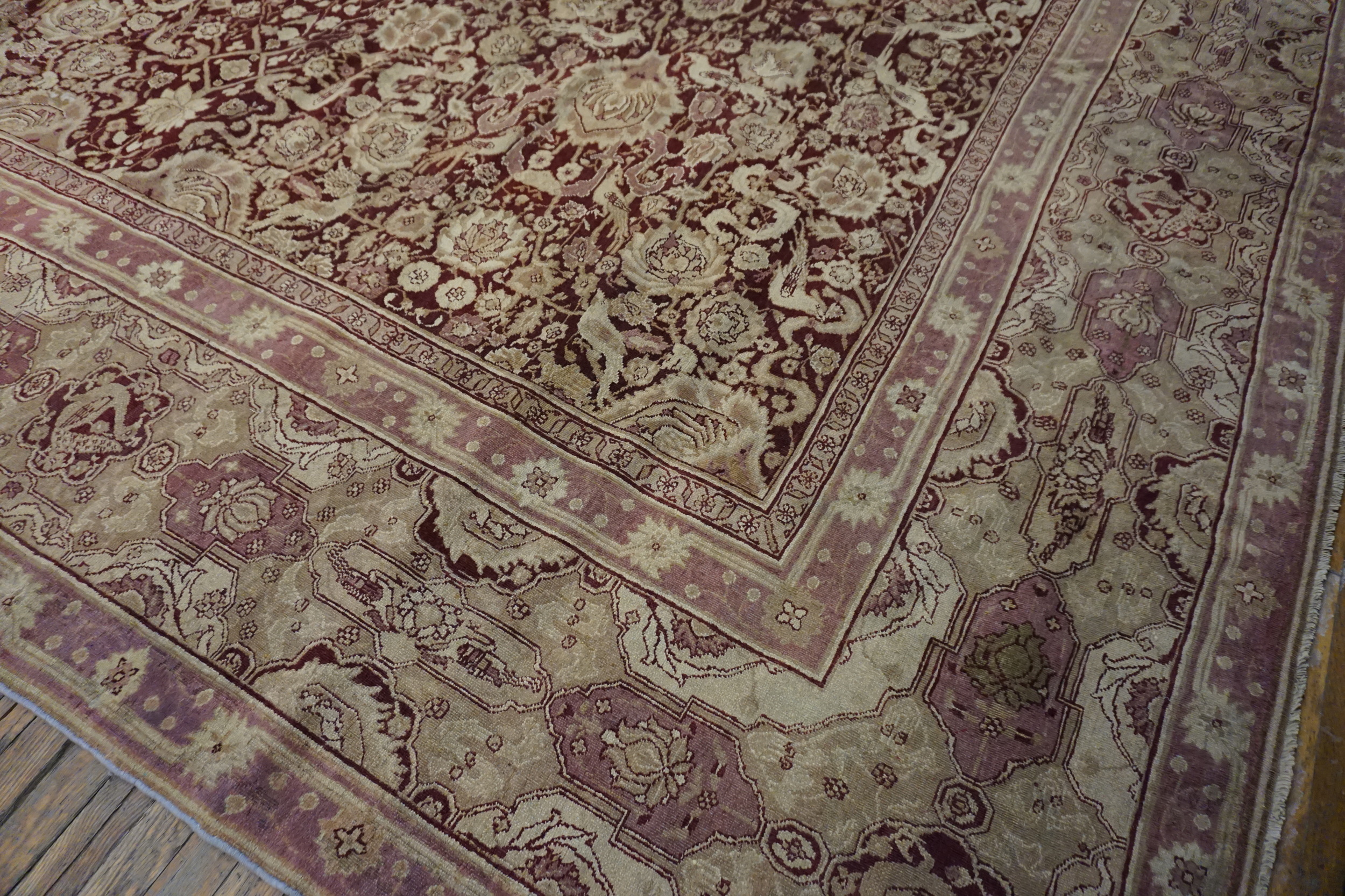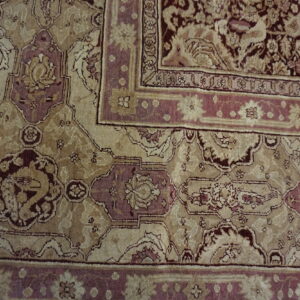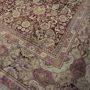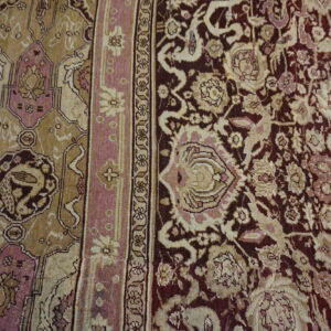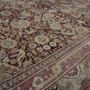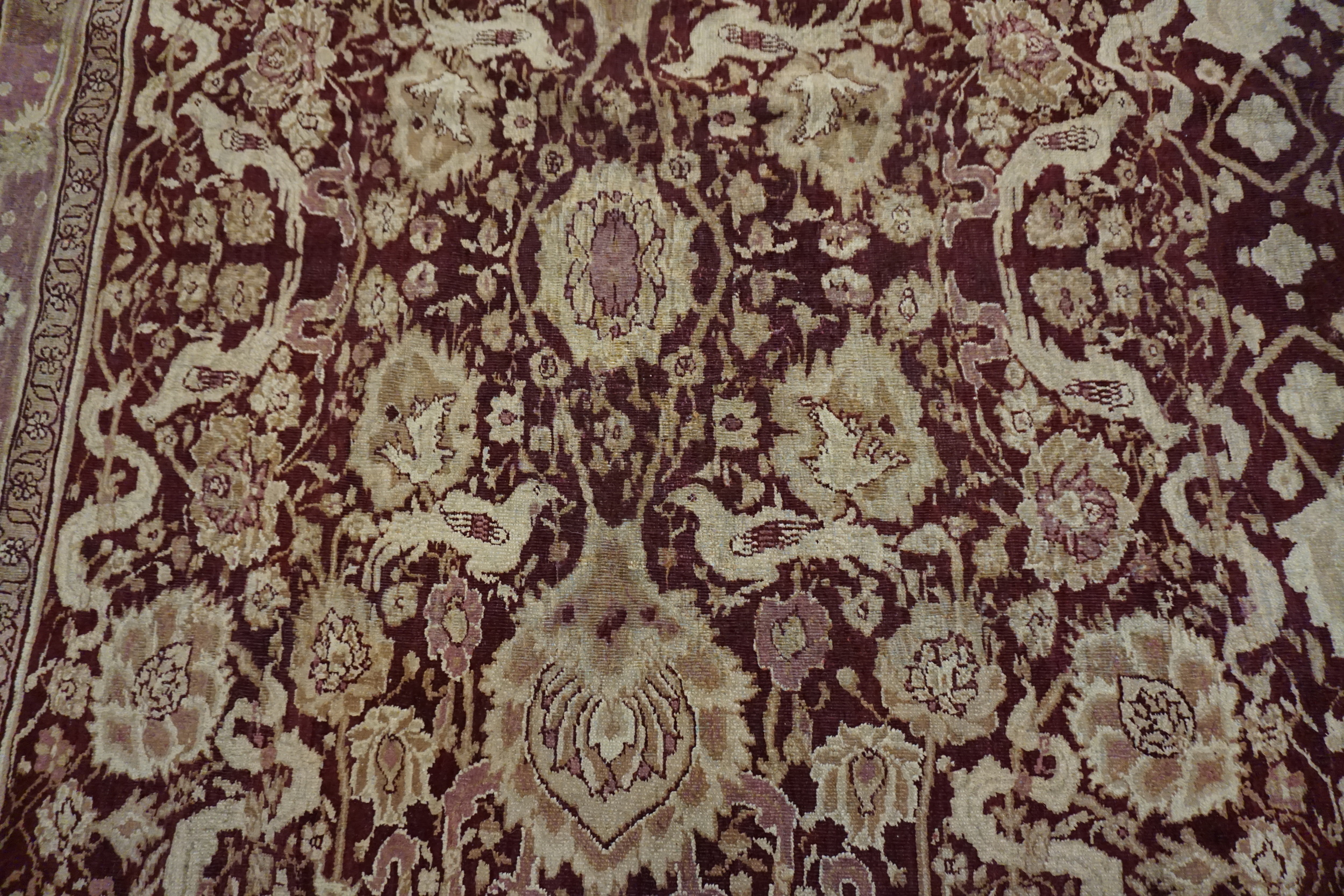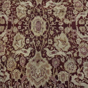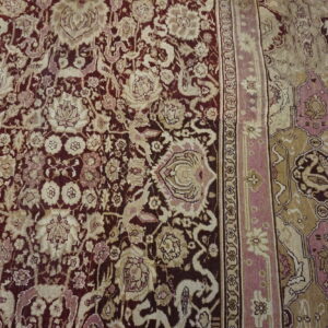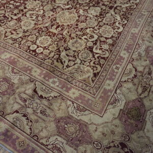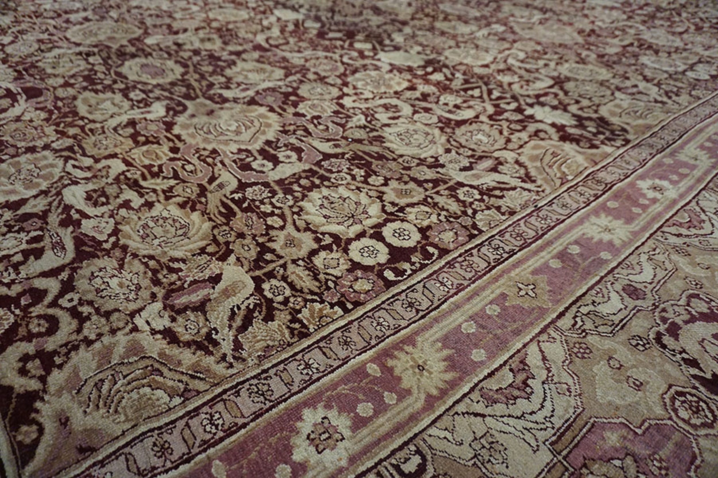 Anchored by a deep burgundy ground, the rug’s field presents an elegant interplay of floral and vine motifs that flow with rhythmic precision. The composition of this stately rug from India evokes a sense of balance and harmony, with finely rendered botanical forms that speak to the influence of classical antique Persian rug design — while retaining the distinctive character and skilled execution characteristic of Indian production from this era.