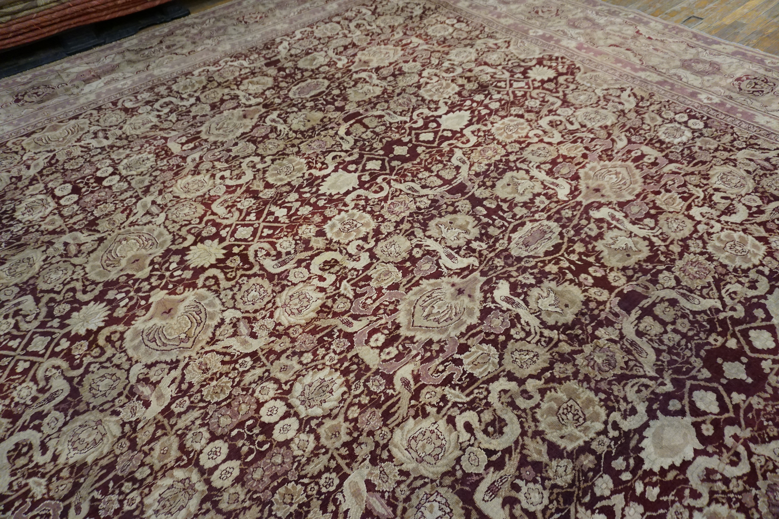 Perfect for living rooms, formal seating areas, dining spaces, or grand entryways, antique Indian Agra carpets such as this bring warmth, sophistication, and historical resonance to interiors of many styles — from traditional to transitional. The rich burgundy backdrop and classic design language make magnificent antique area rugs like this one a versatile and striking foundation piece that elevates any room with timeless beauty and enduring craftsmanship.