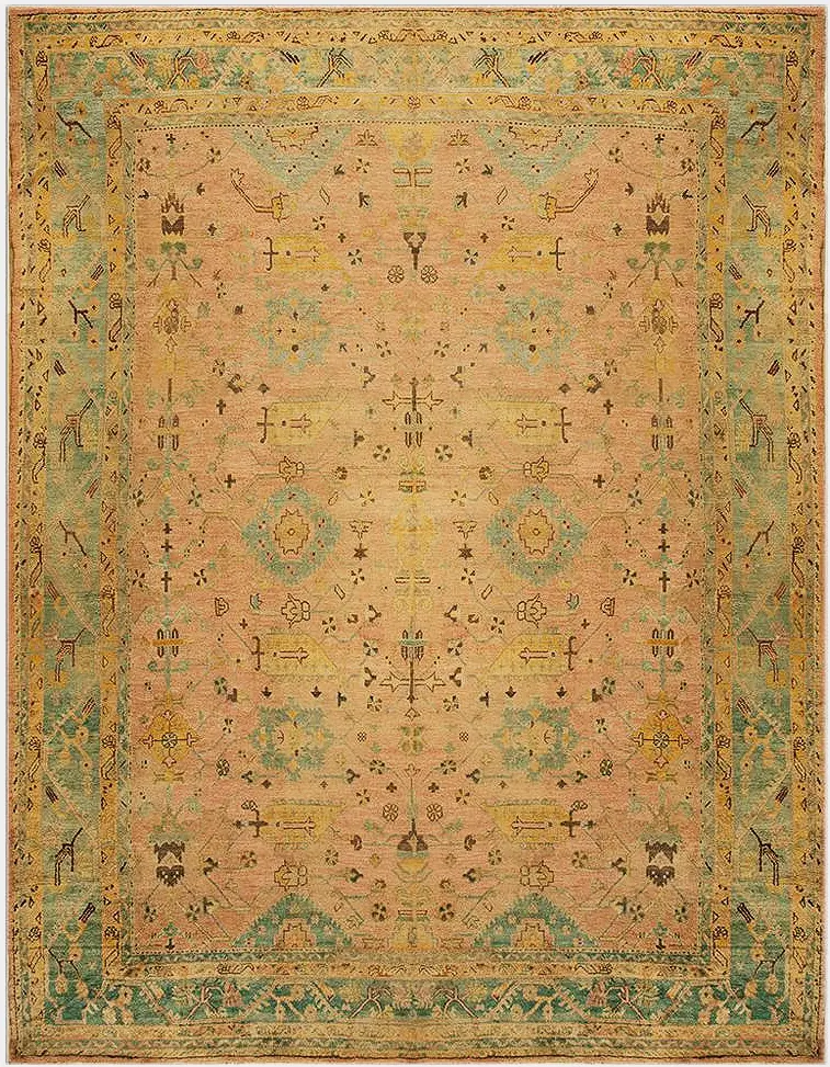 Ideal for great rooms, dining spaces, formal seating areas, or gallery-style interiors, this oversized carpet brings historic depth, decorative richness, and versatile aesthetic appeal to your home. Its soft coral palette pairs beautifully with neutrals, layered textiles, and complementary accent hues — making it a compelling foundation for traditional, transitional, and eclectic décor alike.