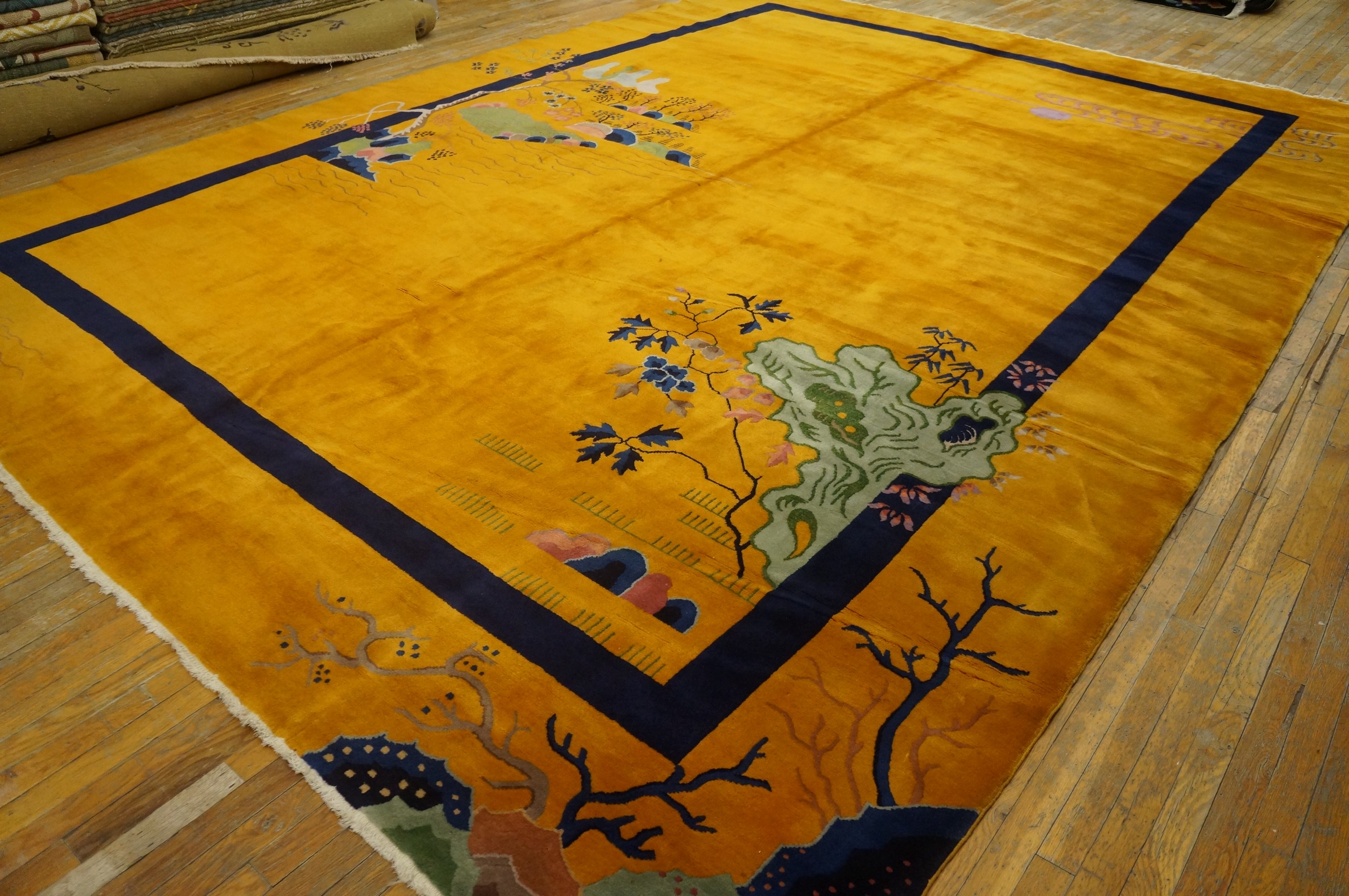 Large Rectangle 1920s Hand Knotted Pile Antique Yellow / Gold Orange Wool Rug, Circa Date: 1920s. This exceptional piece exemplifies the bold aesthetic of Chinese Art Deco, characterized by its dramatic use of negative space and highly saturated color. The hand-knotted wool construction speaks to the enduring quality of antique rugs from this period, offering a plush, velvety texture underfoot.