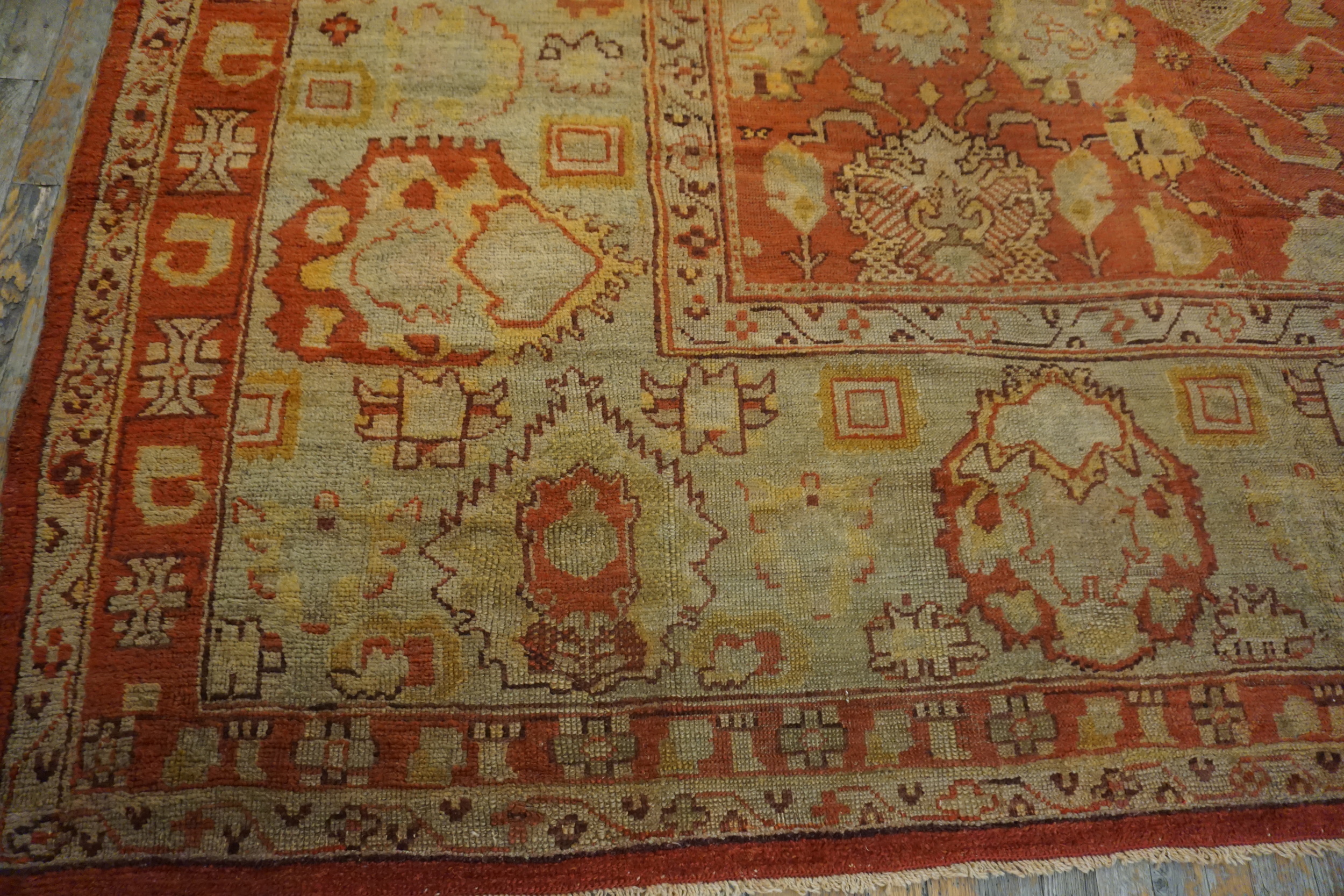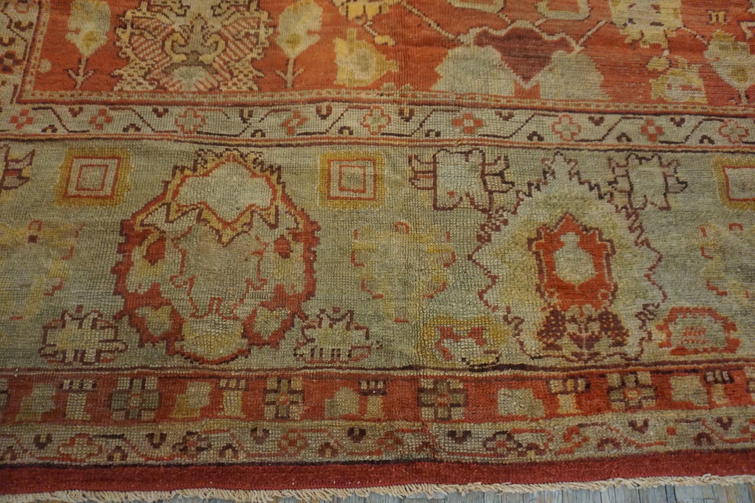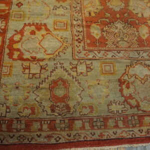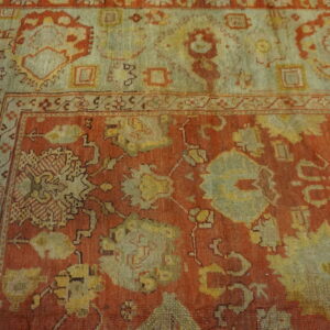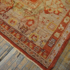 Characteristic of classic antique Turkish Oushak carpets, the design favors spaciousness and rhythmic repetition over strict symmetry, lending the rug a painterly, almost architectural presence. The generous borders—framed with archaic rosettes, angular blossoms, and ancestral symbols—provide a subtle yet grounding counterpoint to the openness of the central field. The wool displays the supple handle and gentle sheen for which antique Oushaks are celebrated, enhanced by decades of natural wear that have softened the colors into a warm, time-worn patina.