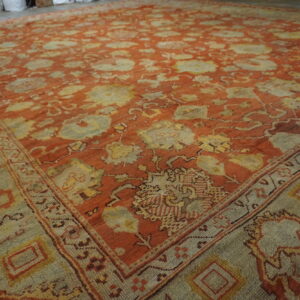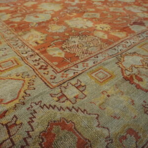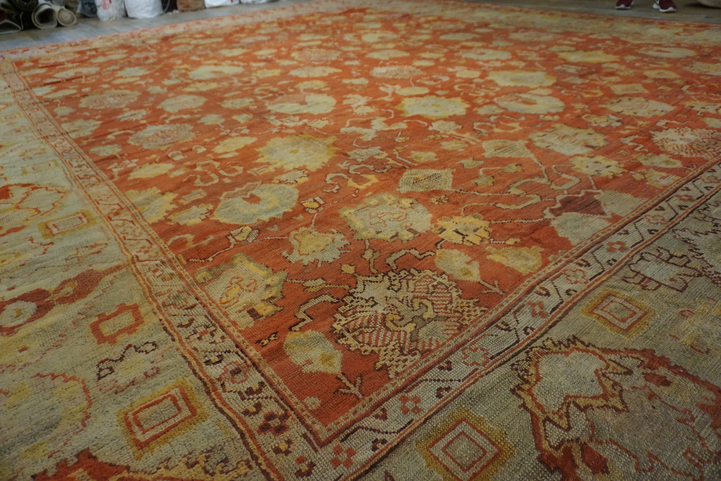 This magnificent antique Turkish Oushak rug exemplifies the enduring grandeur of antique Turkish area rugs and Anatolian weaving traditions, distinguished by its expansive scale, refined tribal geometry, and deeply resonant rustic palette. The field is anchored in a luminous rust and burnished terracotta ground, allowing softly abrash-rich ivory, pale gold, and muted sage motifs to float with effortless elegance across the surface. Large-scale tribal design elements and stylized floral forms are rendered with a confident hand, creating a composition that is both monumental and harmoniously balanced.