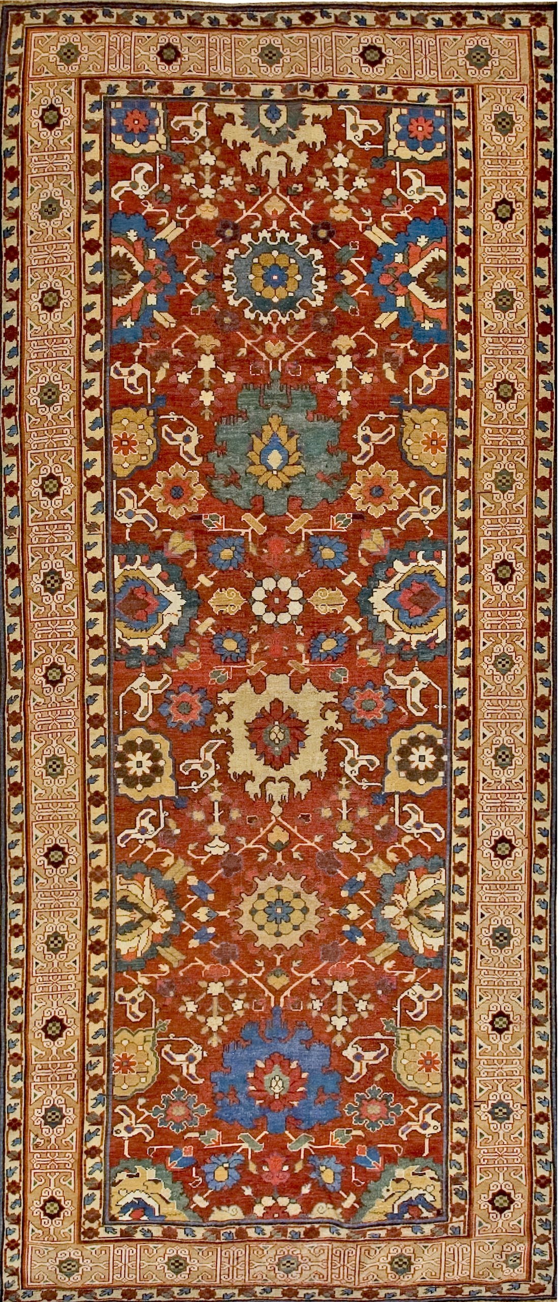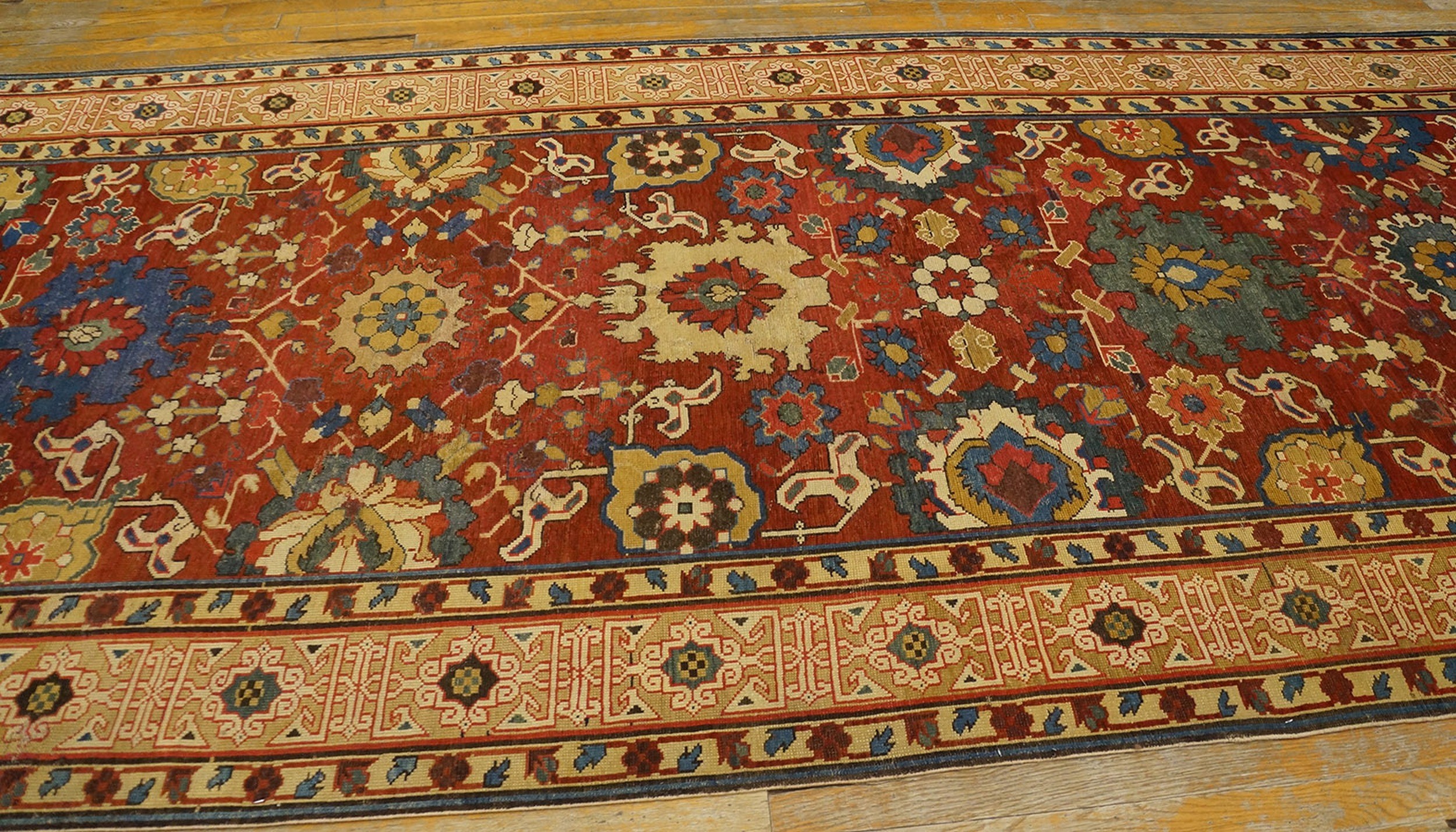 This extraordinary long and narrow antique tribal Caucasian rug, dating from the early nineteenth century, is a museum-quality exemplar of the “Kuba” weaving tradition—one of the most intellectually and artistically revered regions of the Caucasus. Historically, antique tribal Caucasian Kuba rugs were the “scholarly” cousins of the more rustic Caucasian tribal weaves, known for their incredible structural density and their preservation of ancient, high-relief motifs. This specific specimen is defined by its “long and narrow” format (often referred to as a Kenareh), likely intended for the grand corridors of a local khan’s palace or as a prestigious commission for a high-ranking family.