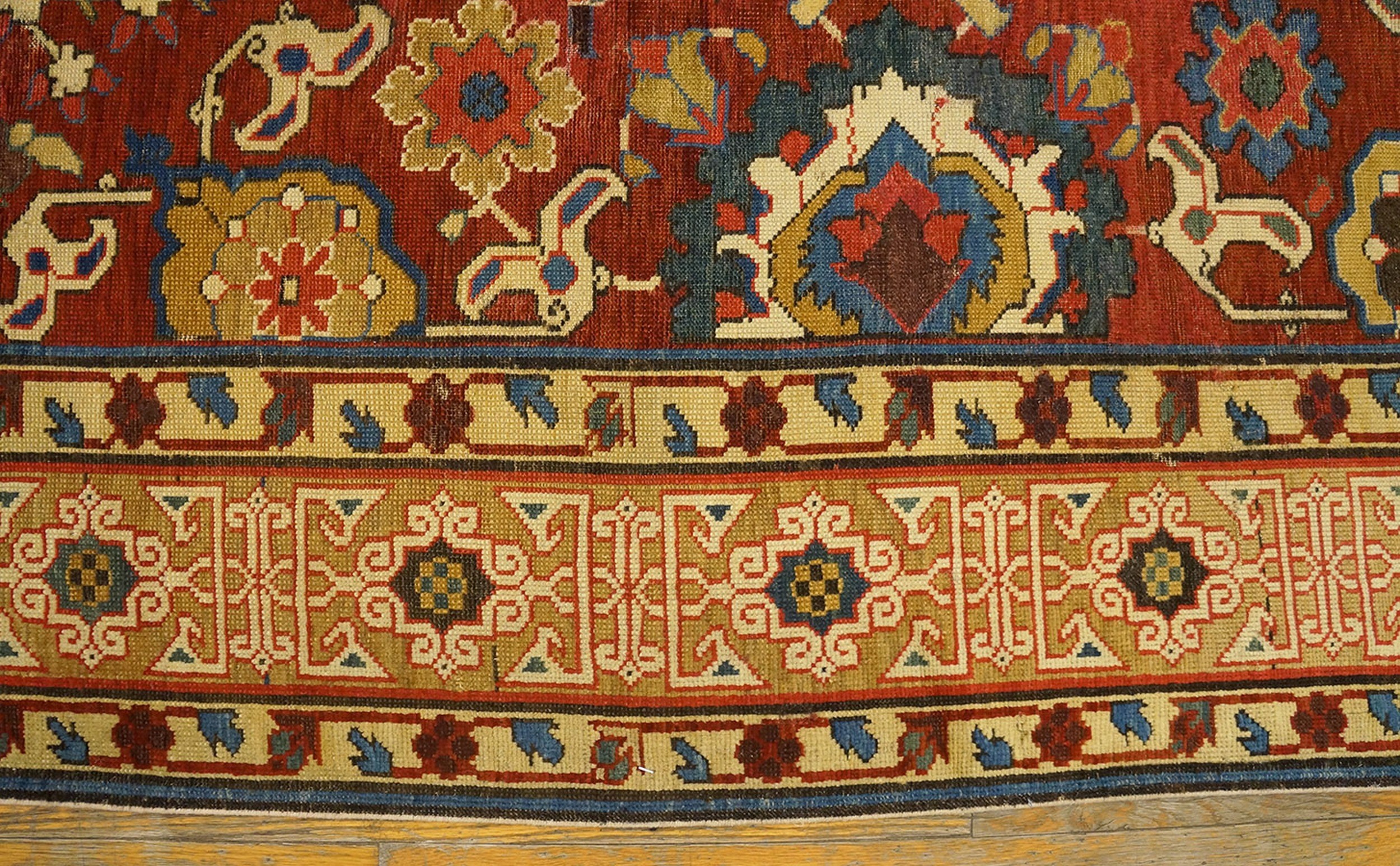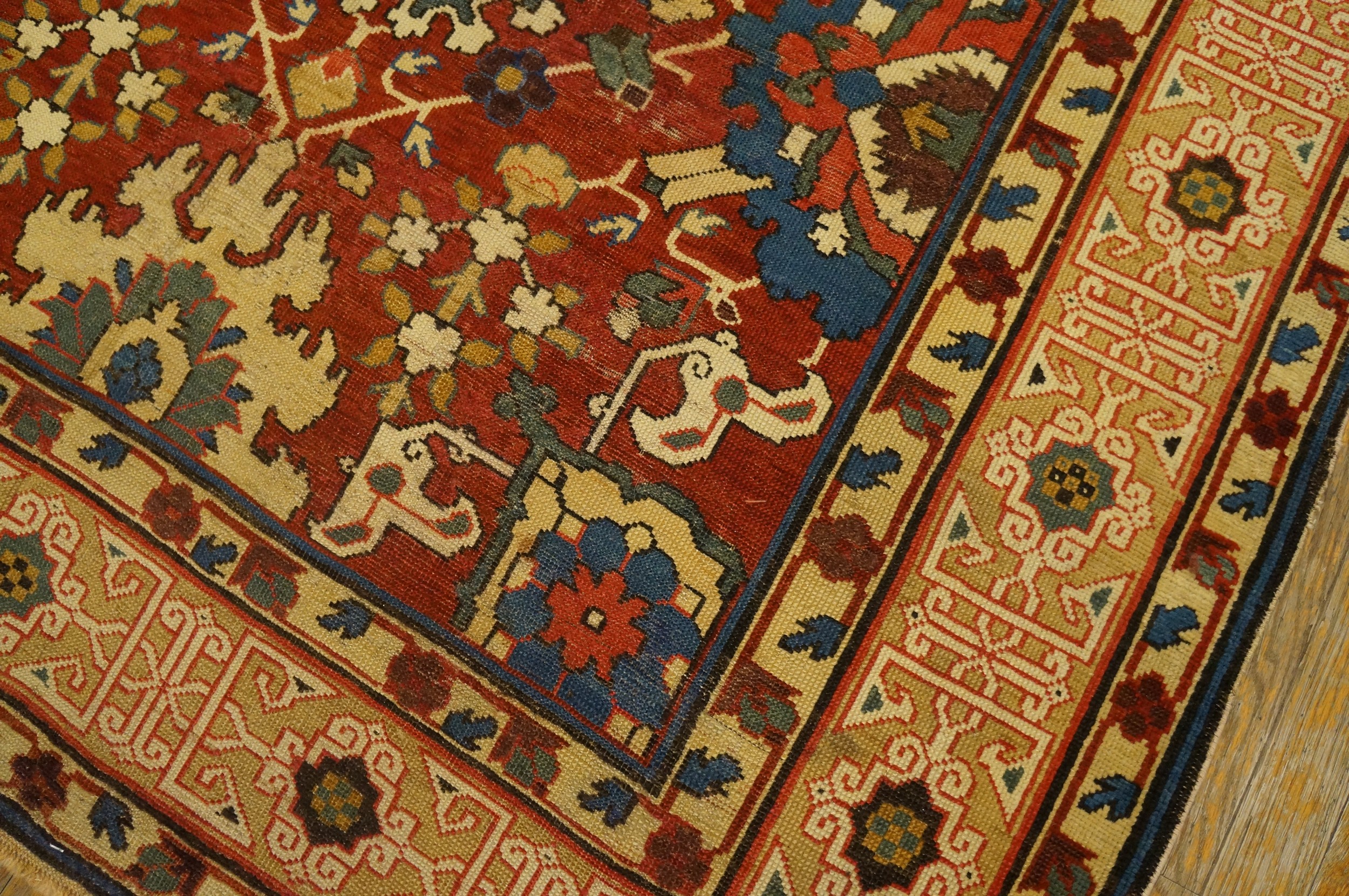 The “rustic” quality of the rug is found in its vibrant, primordial palette. The deep madder reds, luminous indigo blues, and rare saffron yellows are remarkably saturated, a testament to the purity of the mineral and vegetable dyes used in the high-altitude villages of the eastern Caucasus. The wool is hand-spun and exceptionally lustrous, having developed a “leather-like” handle and a shimmering patina over two centuries. Unlike later, more commercialized antique tribal Caucasian rugs, this early piece possesses a “primitive-modernist” graphic power, where every sharp angle and stylized bird or animal motif serves as a silent guardian of tribal history.