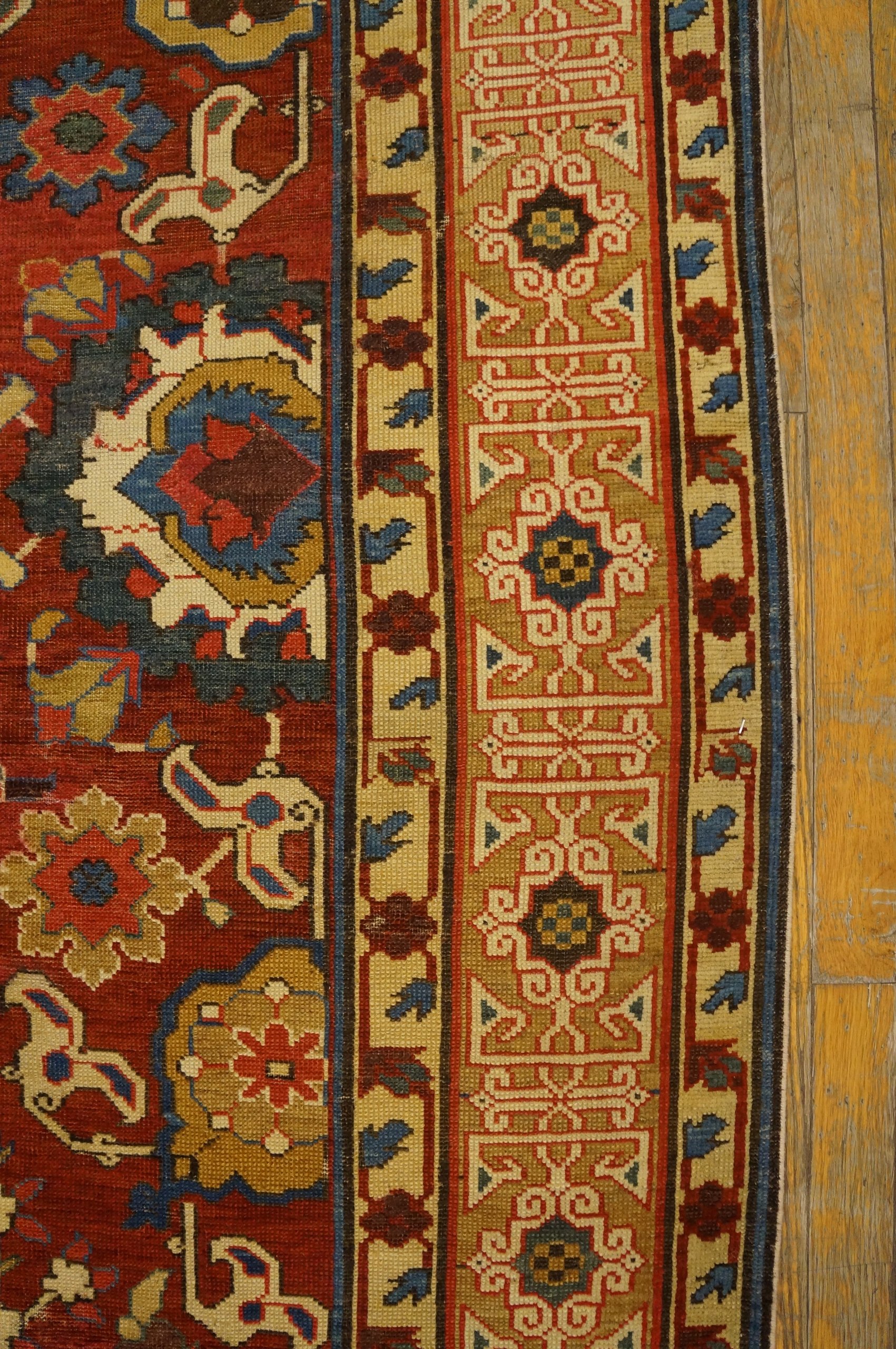 The composition is a virtuoso display of the “Large-Scale Tribal” aesthetic, featuring a rhythmic succession of bold, geometric medallions—each a self-contained universe of ancient symbolism. However, the true hallmark of this early 19th-century masterpiece is the “Kufic” border. This sophisticated geometric pattern is a stylized, textile interpretation of early Arabic calligraphy, a motif that traces its lineage back to the 15th-century “Holbein” and “Lotto” carpets of the Ottoman Empire. In this Kuba, the Kufic border acts as a powerful, protective frame, its interlocking white and colored lines creating a sense of infinite, architectural movement.