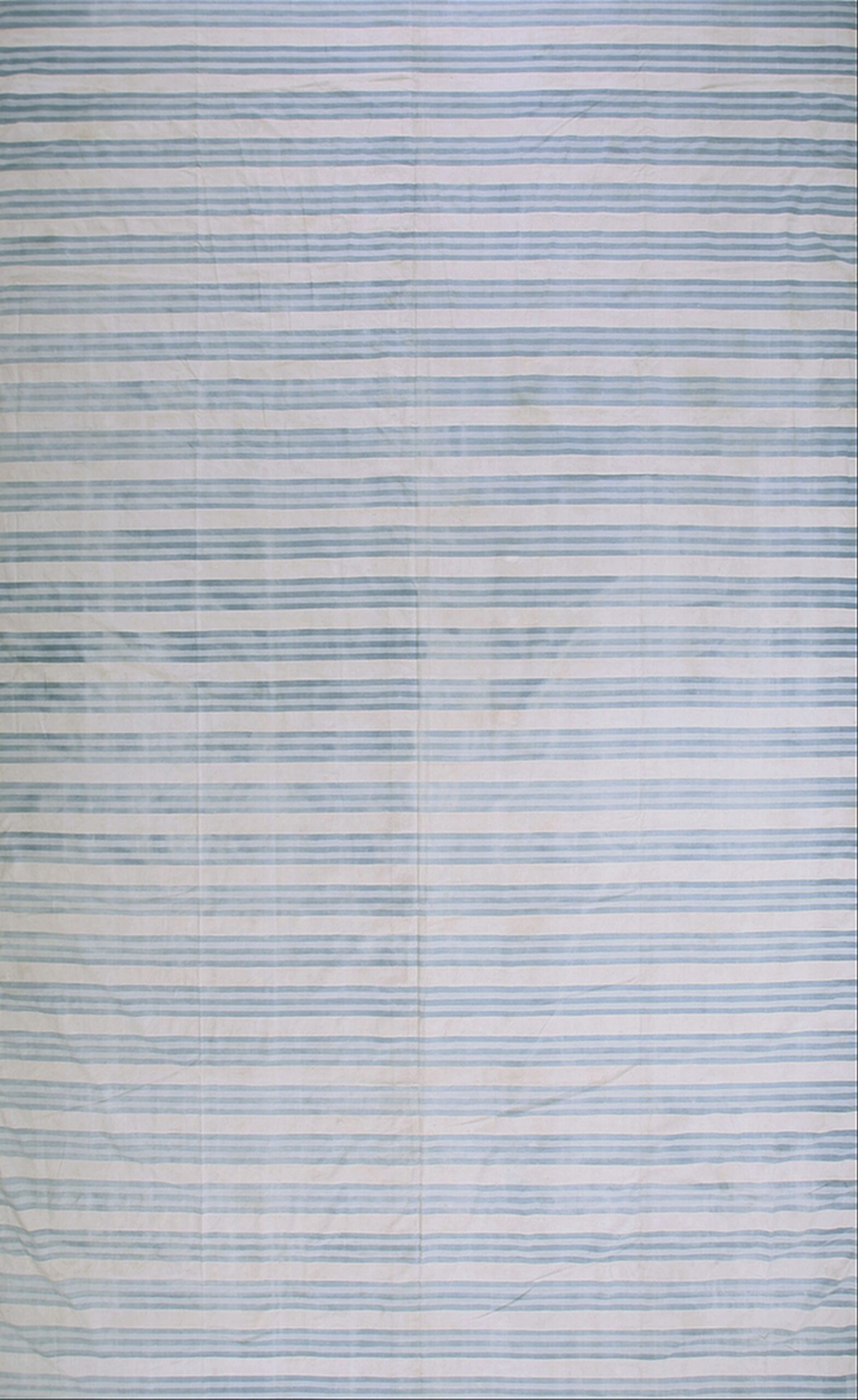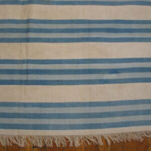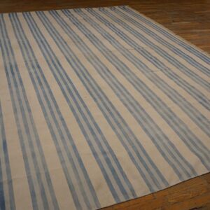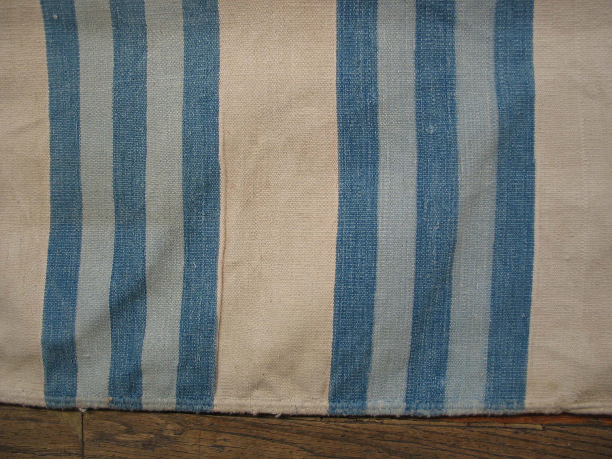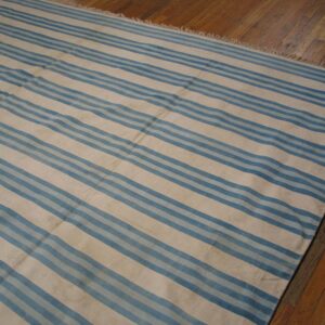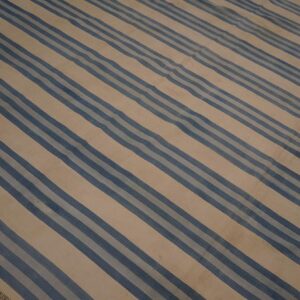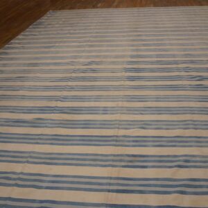 This large size antique cotton white and blue stripes flatweave Indian dhurrie rug is a timeless example of these decorative rugs from India, offering both functional versatility and understated decorative appeal. Woven using classic flatweave rug techniques, this carpet features a bold yet harmonious striped composition that balances simplicity with visual rhythm — making it suitable for a wide range of interior styles.