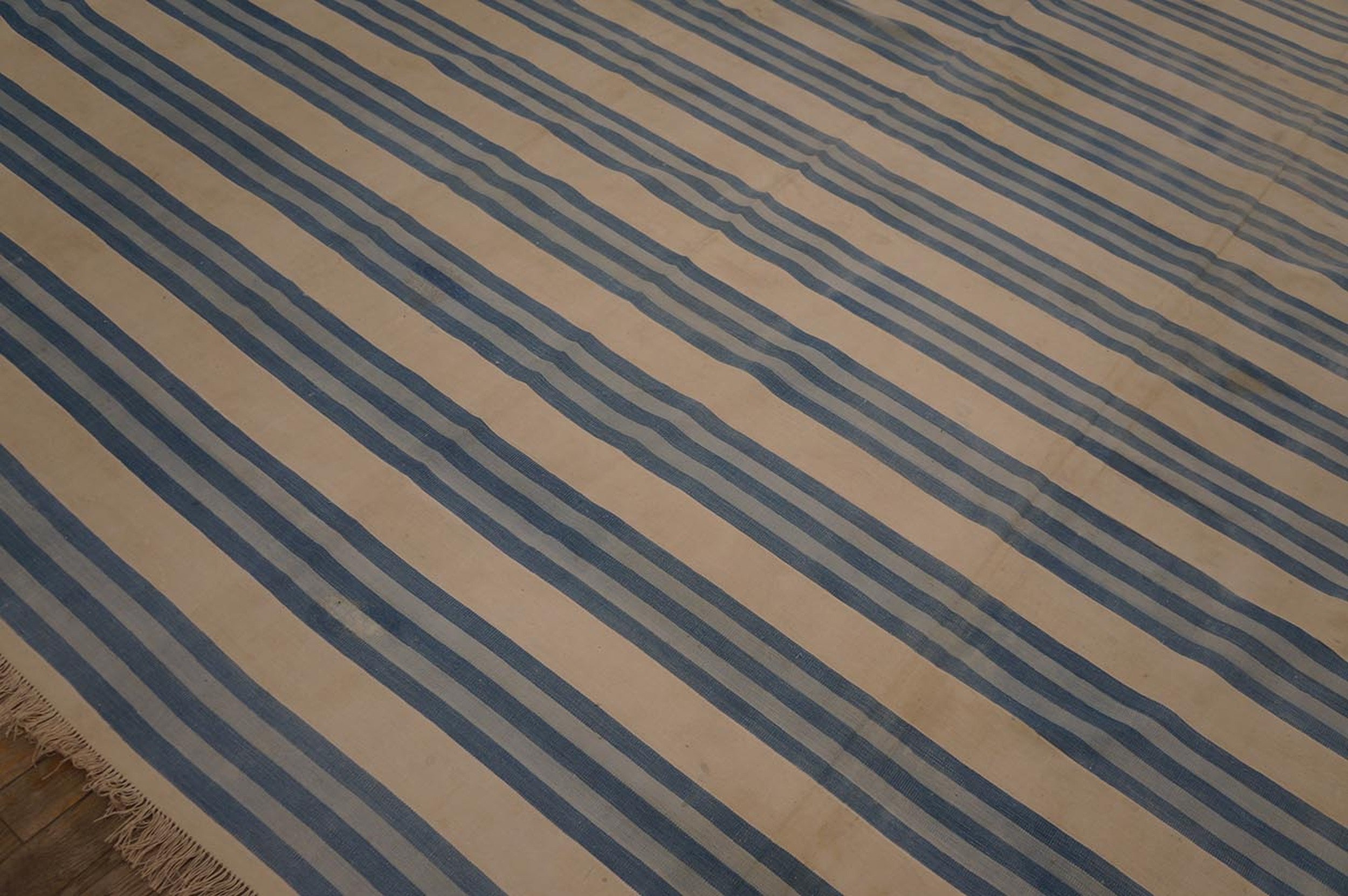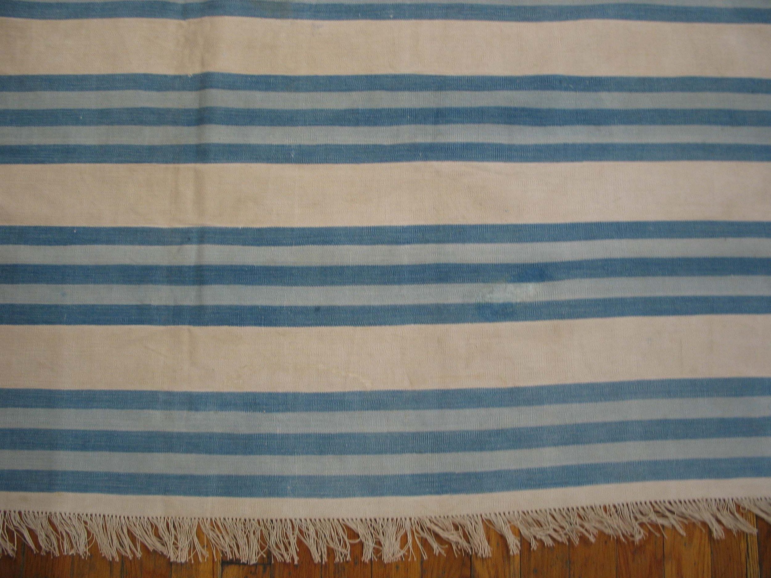 Large Size Antique Cotton White and Blue Stripes Flatweave Indian Dhurrie Rug
