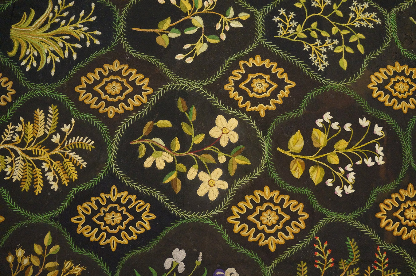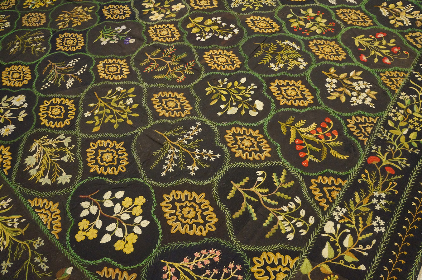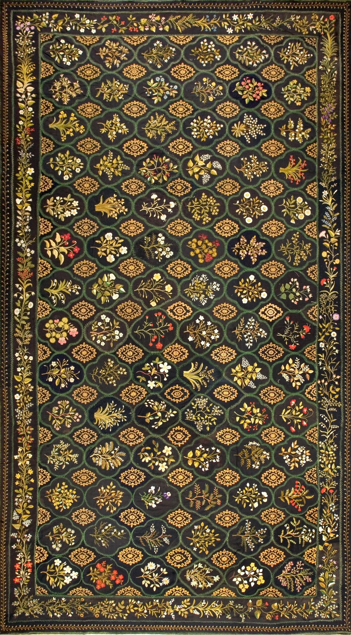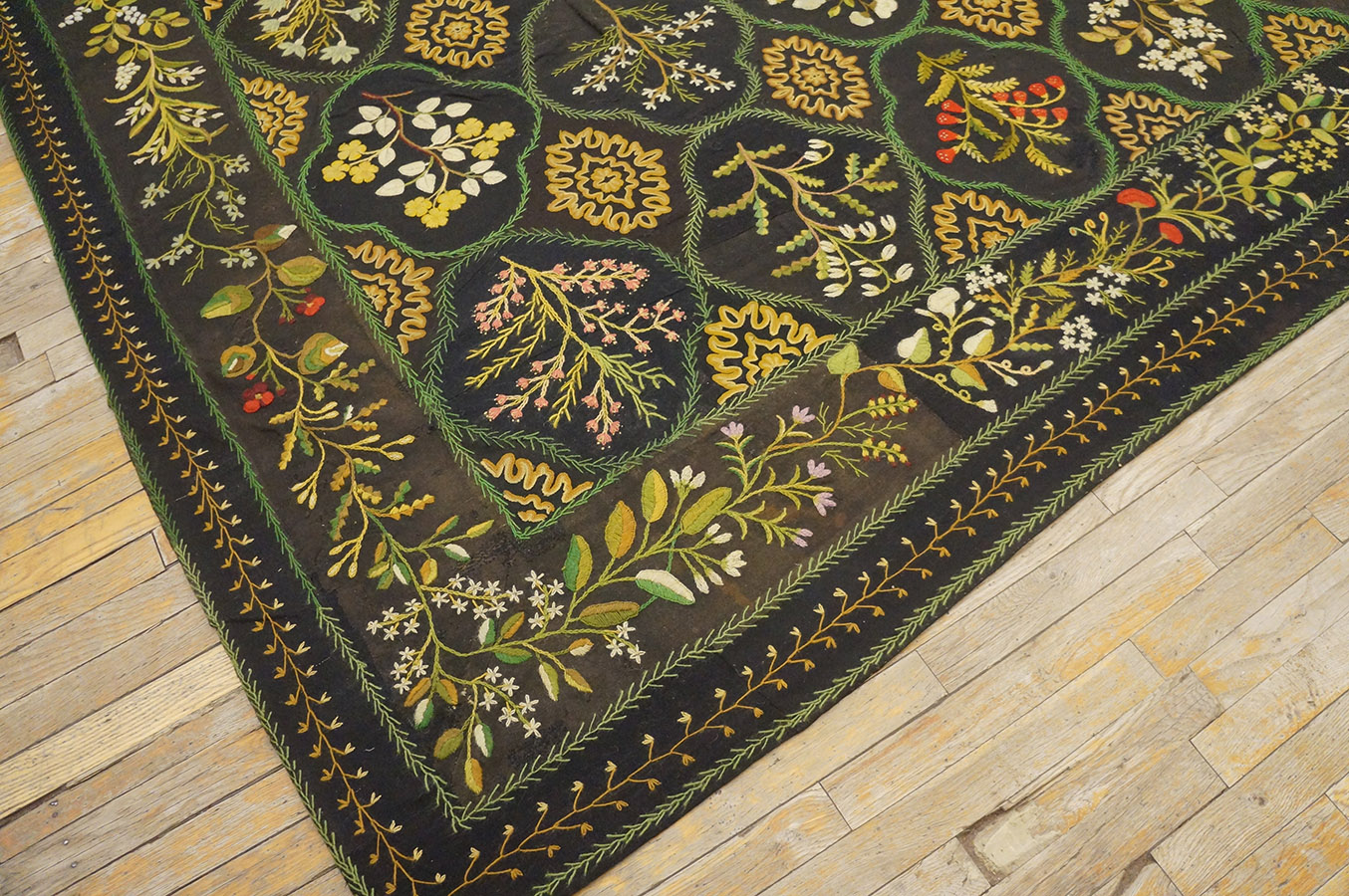 This nineteenth-century English carpet is a striking example of British textile sophistication, representing a departure from the lighter, more pastel palettes typically associated with European flat-weaves. In the hierarchy of antique needlepoint carpets, a large-size specimen with a dark, moody foundation is a rare find, highly sought after by modern designers for its ability to anchor a grand room with both historical gravity and a contemporary edge.