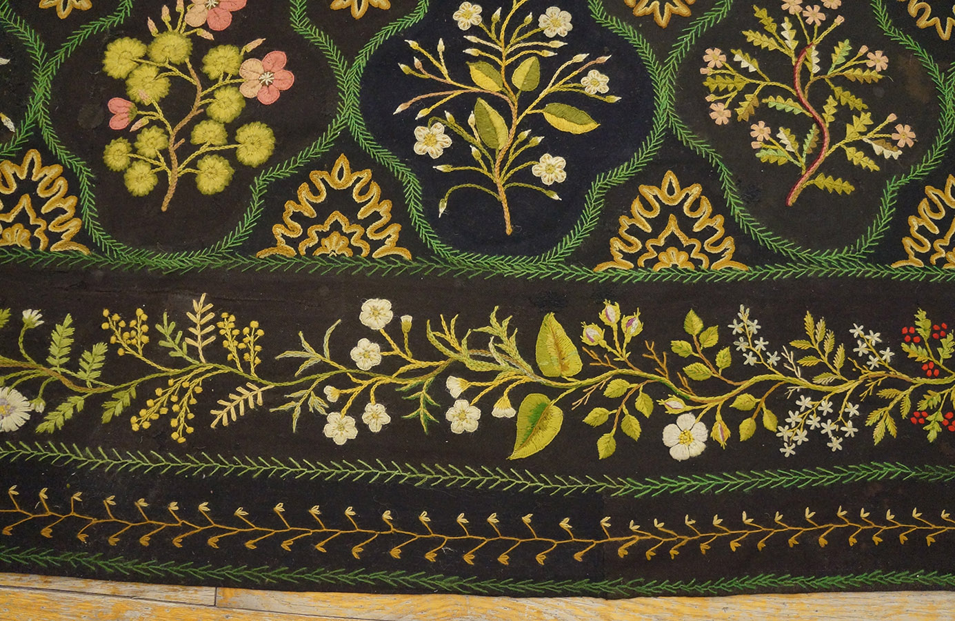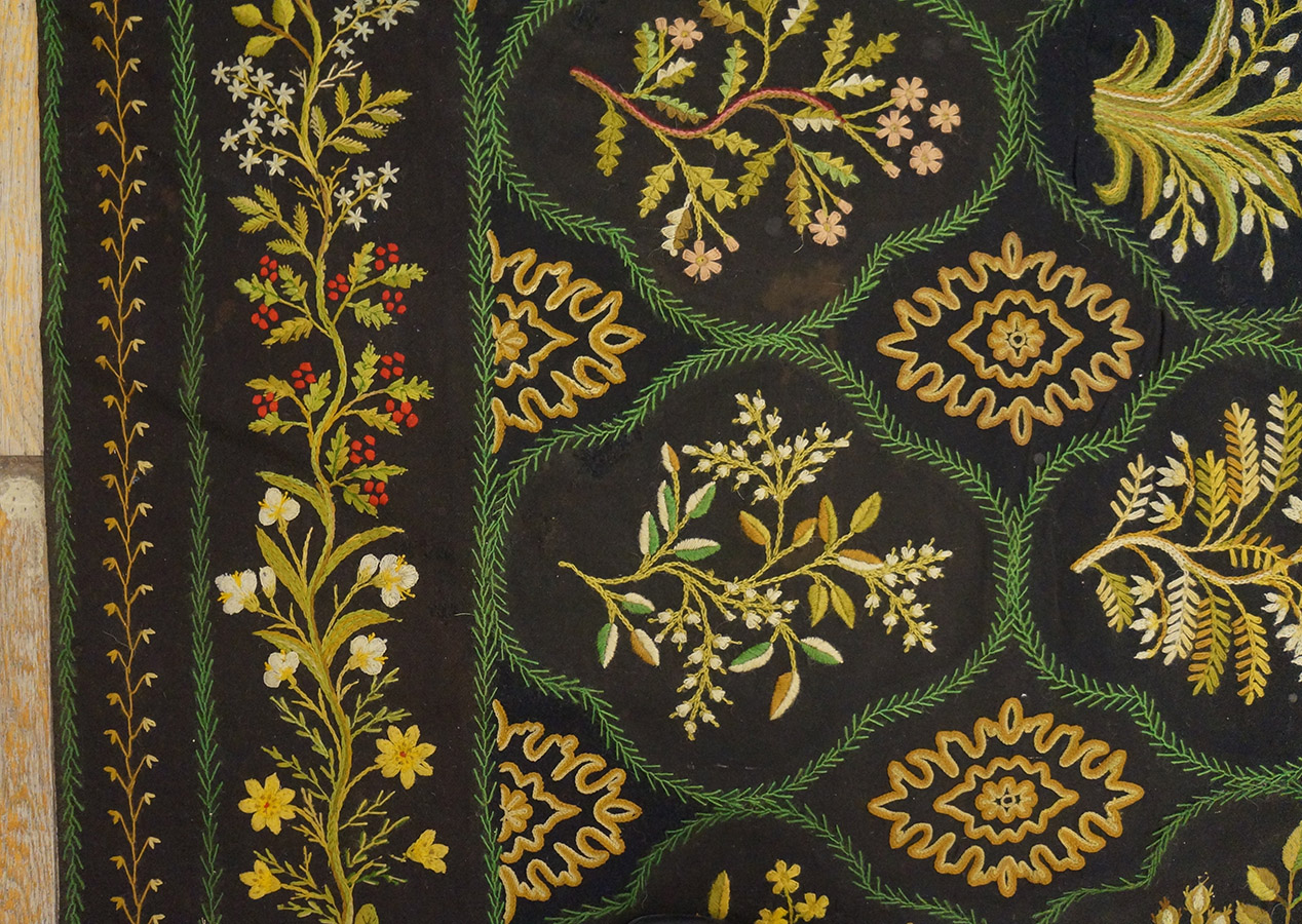 Technically, this antique carpet is prized for its refined flat-weave texture and substantial, “fabric-like” handle. The hand-stitched nature of the needlepoint creates a uniform surface that is both durable and remarkably elegant. One of the most significant advantages of this construction is its “low-profile” height, which allows for the easy placement of fine antique furniture without the instability of a high pile. The sheer labor involved in a large-scale needlework of this caliber represents thousands of hours of meticulous hand-work, a testament to the high domestic woven art of the 19th century.