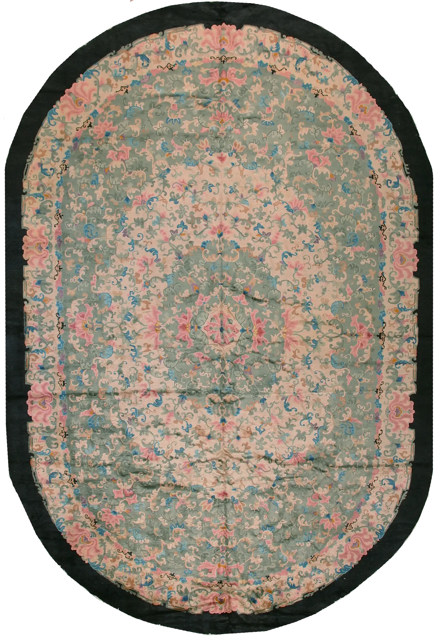 Antique Large Oval Peking Chinese Knotted Green Color Area Rug, Circa Date: 1930s. This exquisite example of early 20th-century weaving represents the height of the Peking production, known for its plush pile and sophisticated palette. As a genuine antique rug, it carries the distinct aesthetic of the period, blending traditional Chinese motifs with a Westernized Art Deco sensibility.