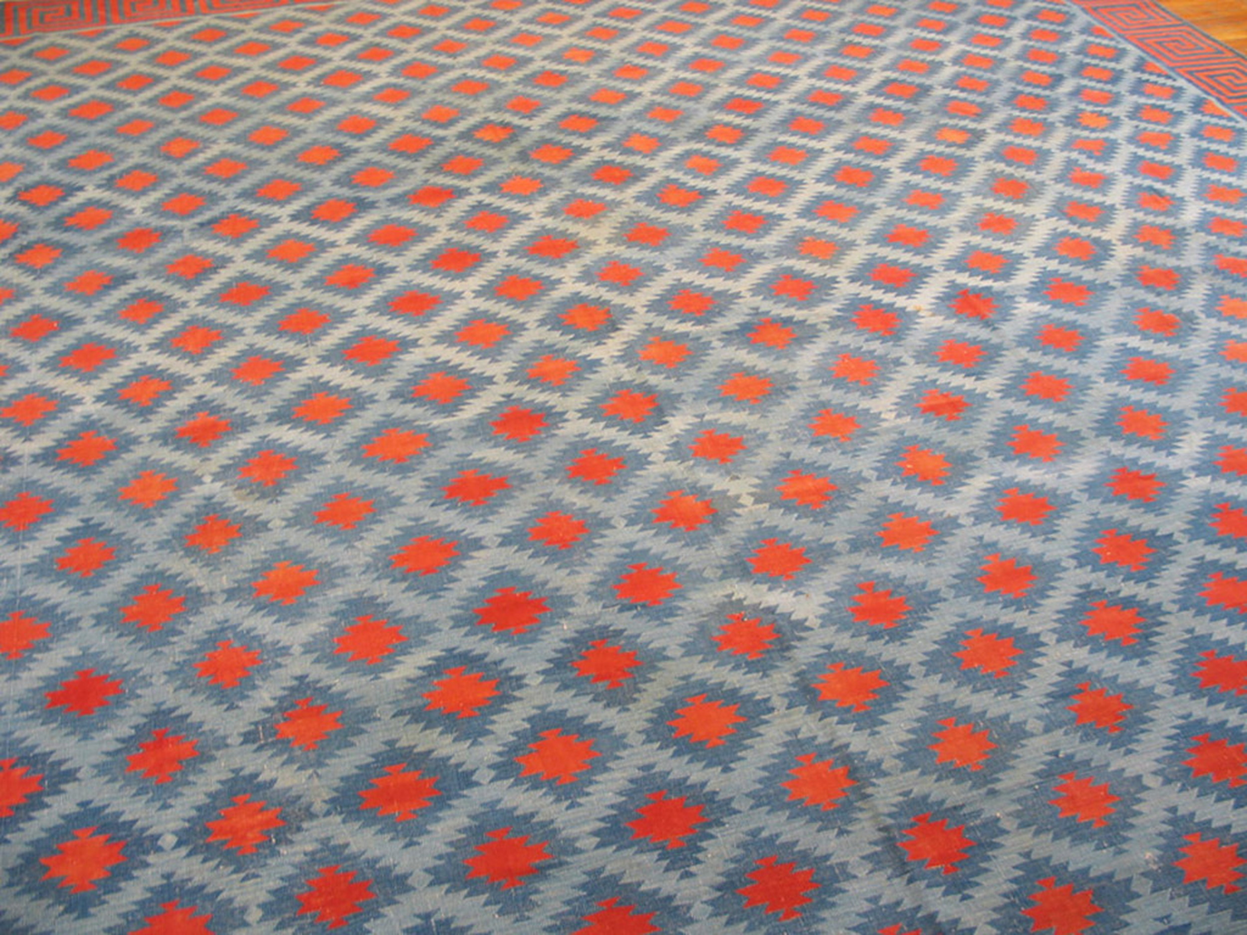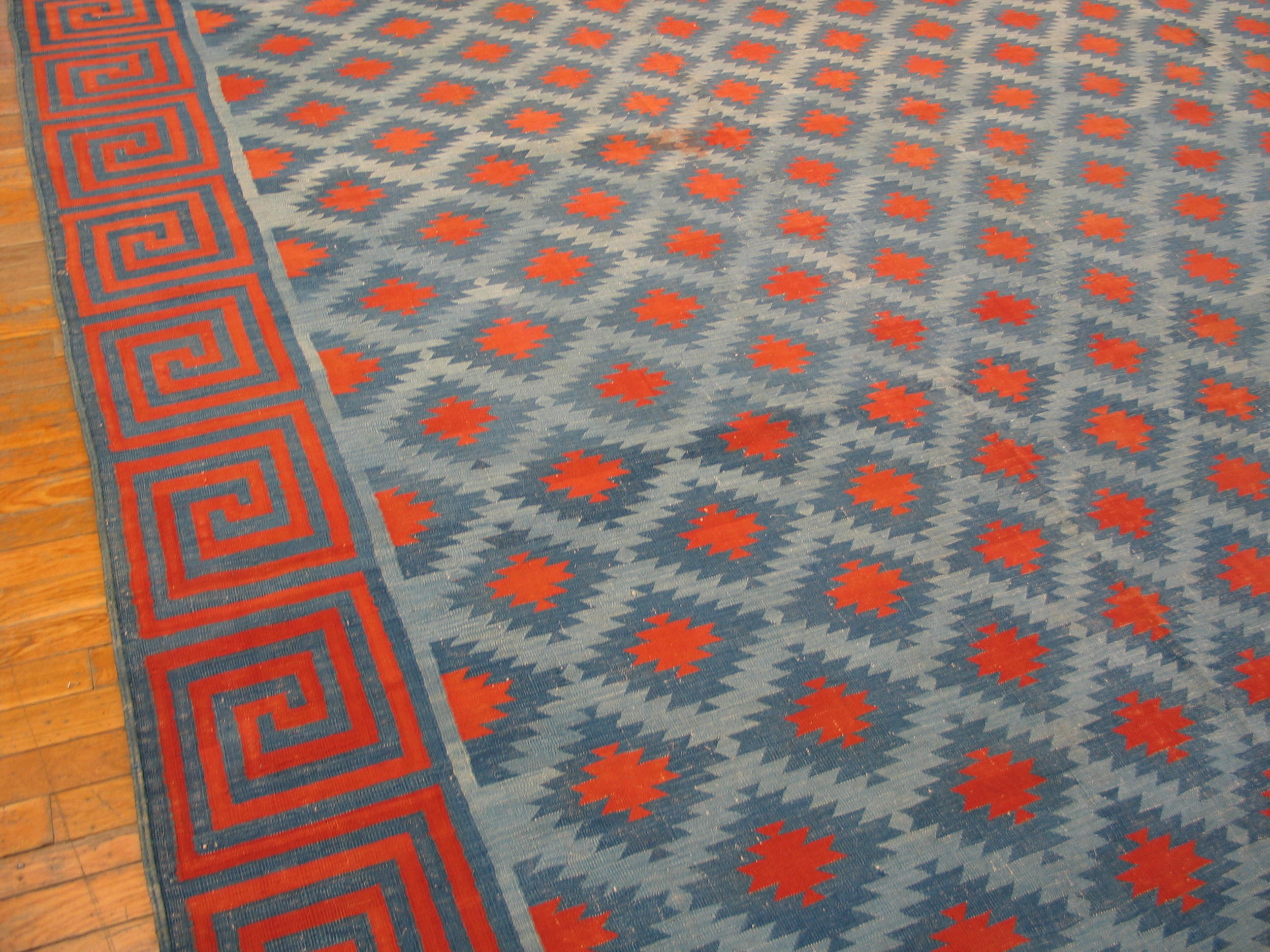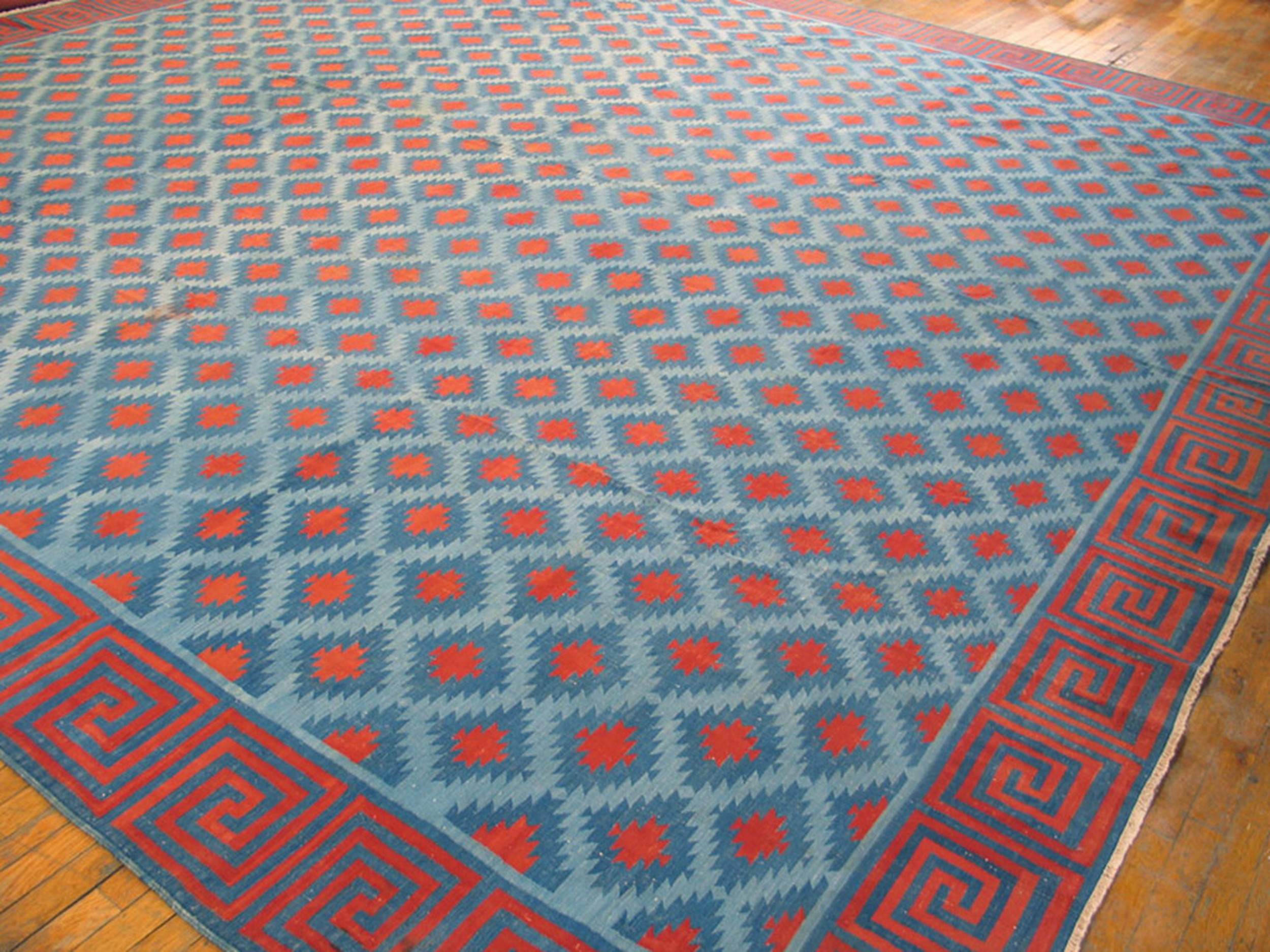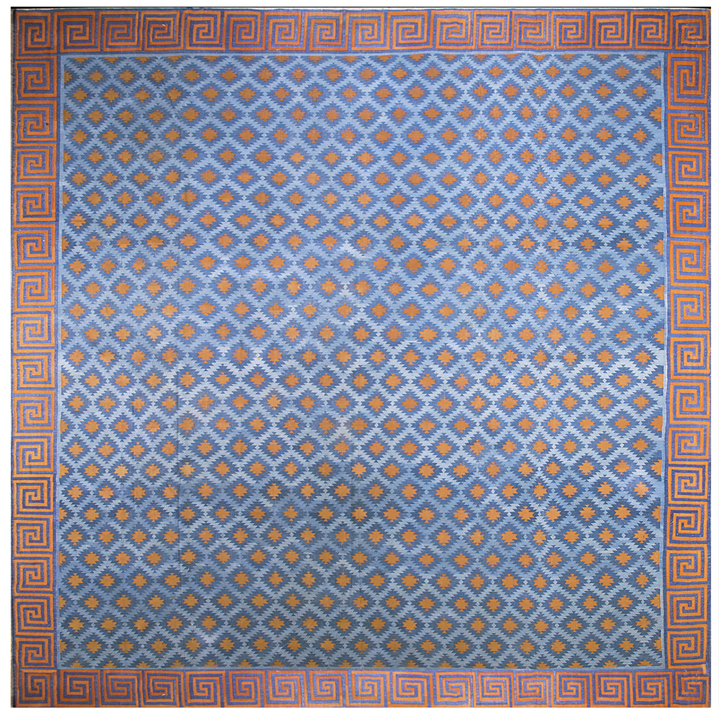Large Allover Geometric Blue 1930s Square Cotton Antique Flat Weave Rug, Circa Date: 1930s. This exceptional piece is a striking example of early 20th-century textile design, offering a bold, graphic statement rarely seen in traditional antique rugs. The flat weave construction highlights the precision of the geometric motifs, lending the piece a contemporary sensibility despite its age.