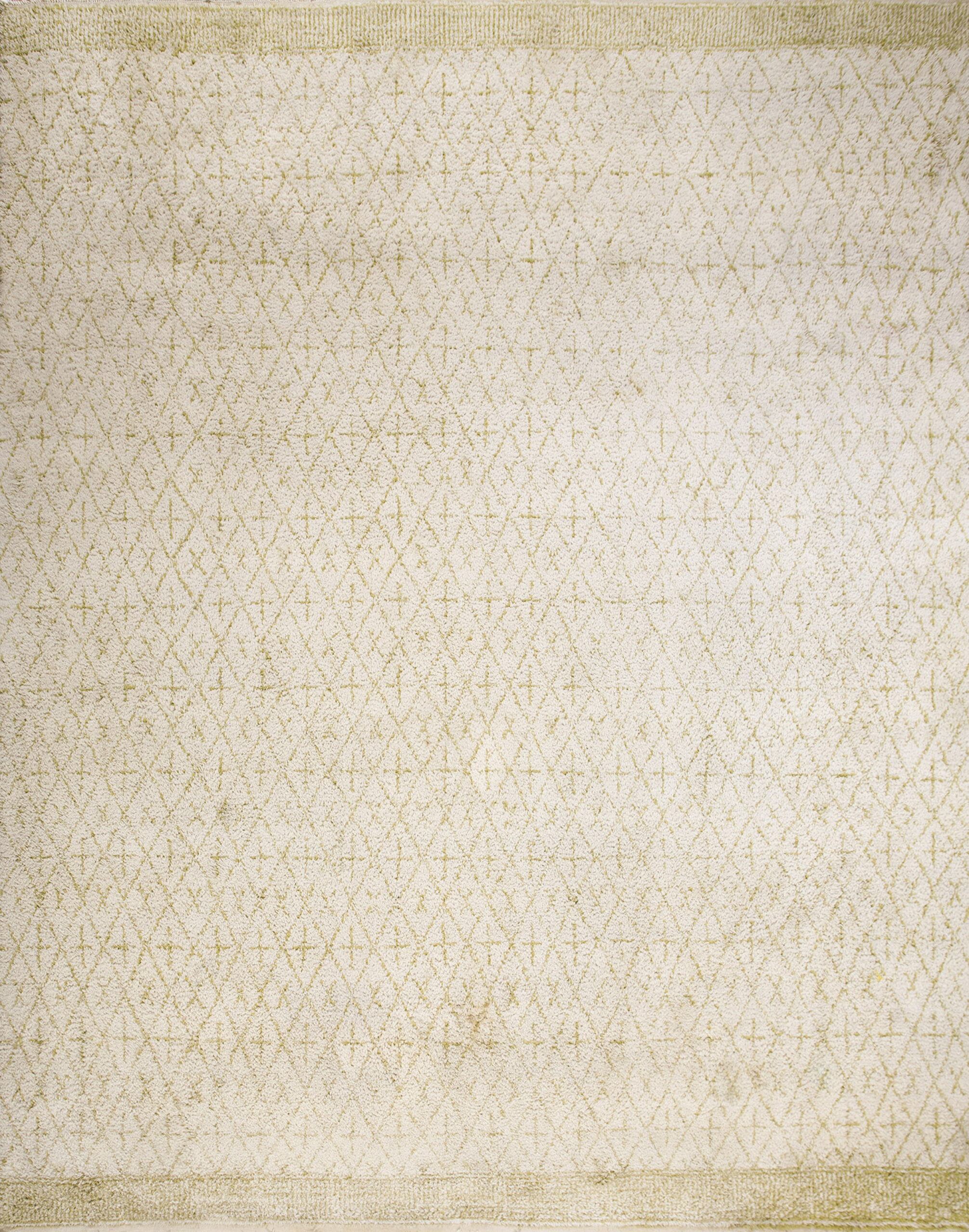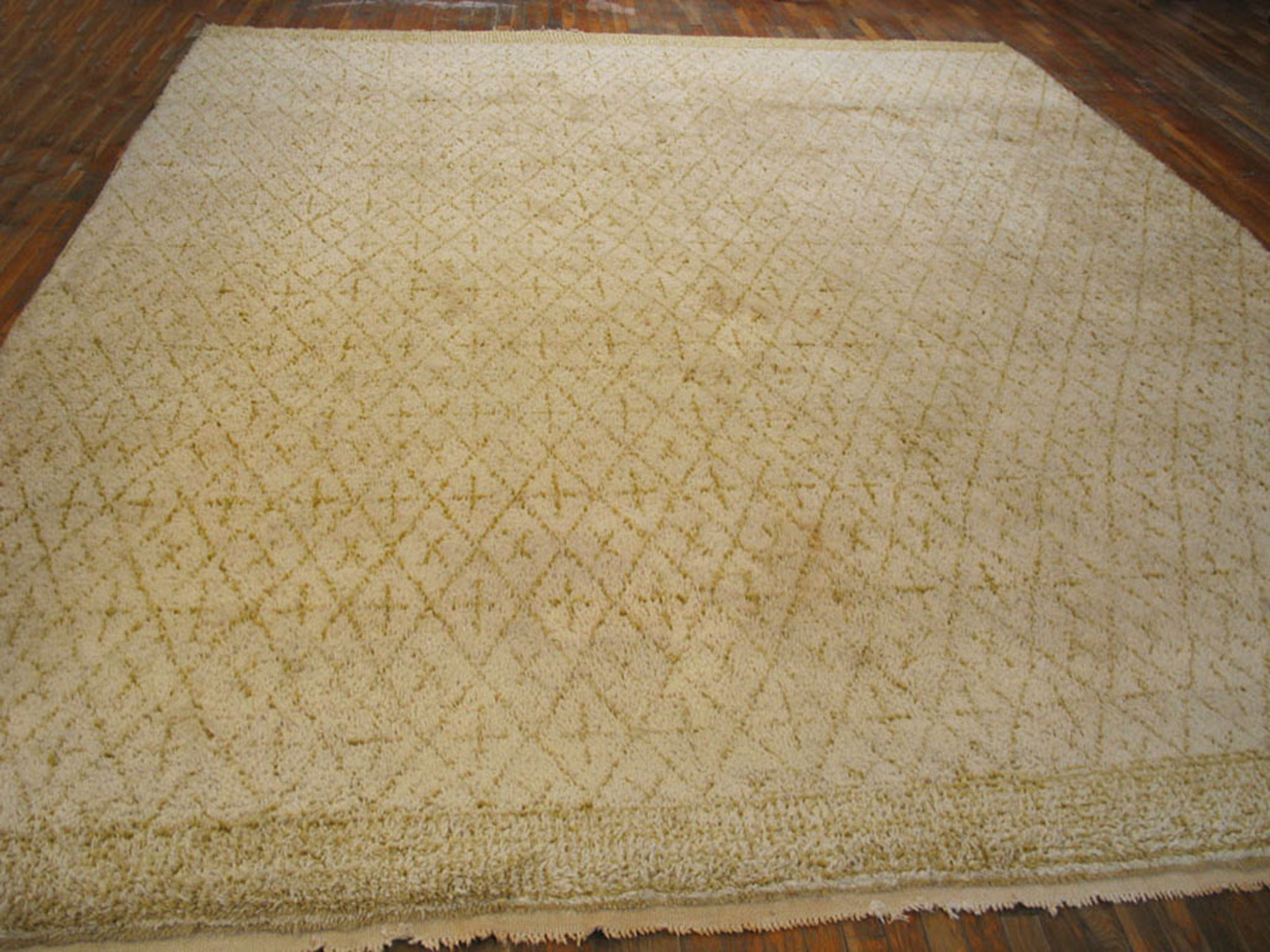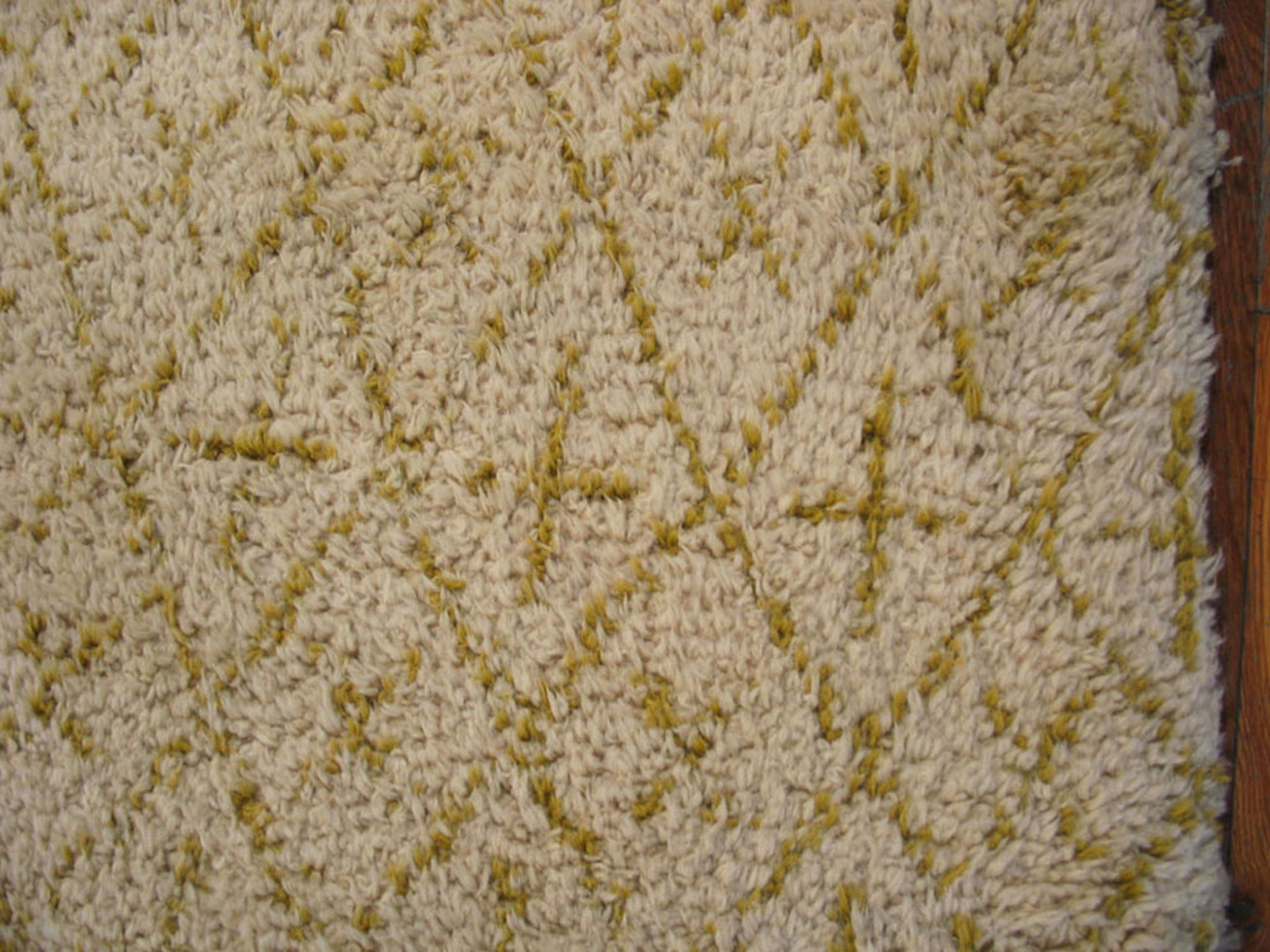Vintage Allover Geometric Wool Hand Knotted Pile Ivory Beige Cream White 1960s Berber Carpet, Circa Date: 1960s. This exceptional piece captures the refined aesthetic of mid-century design, representing the finest examples within our collection of vintage area rugs. Its deep, hand-knotted wool pile offers a luxurious texture, typical of the era’s focus on comfort and natural materiality.