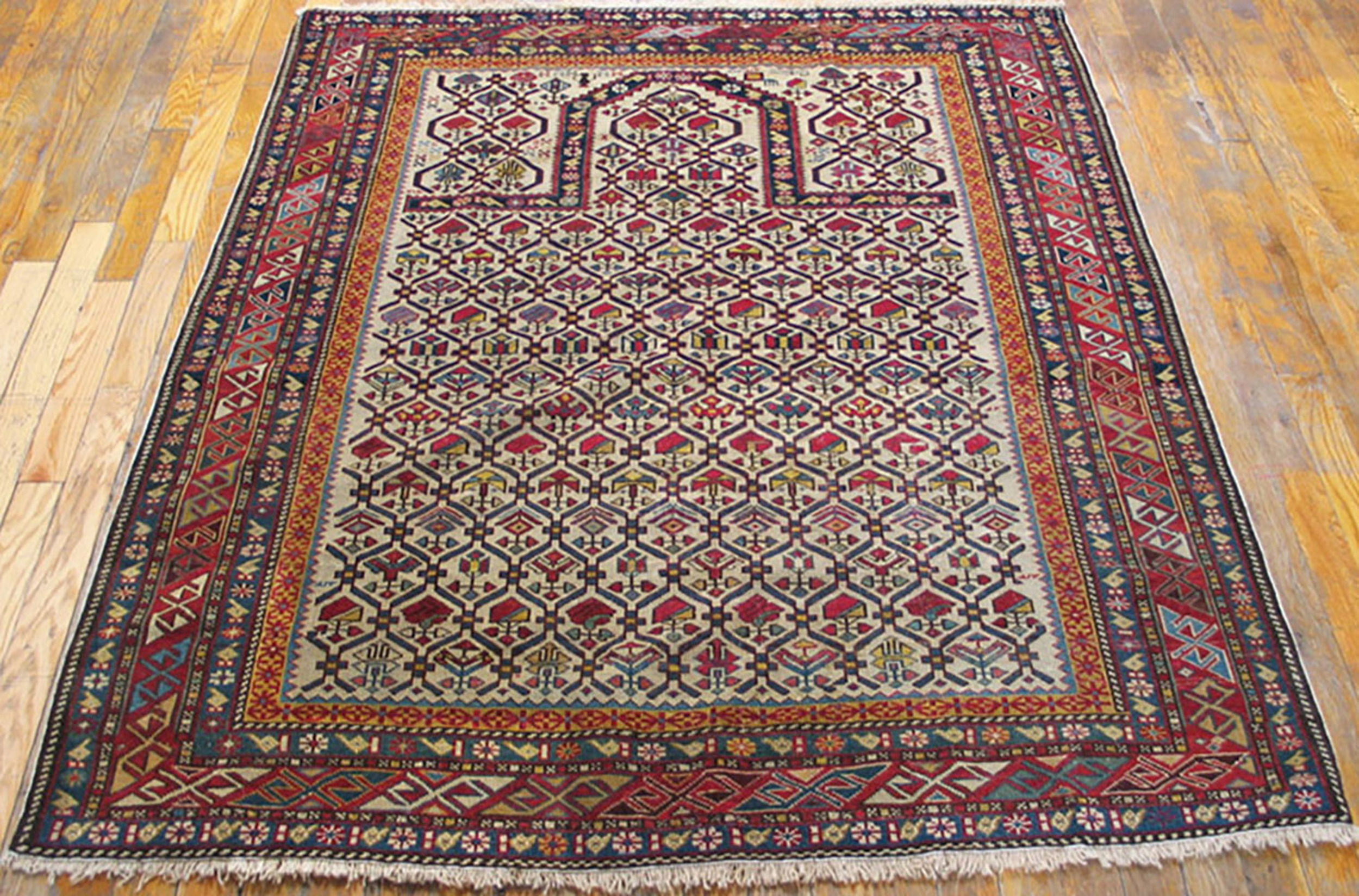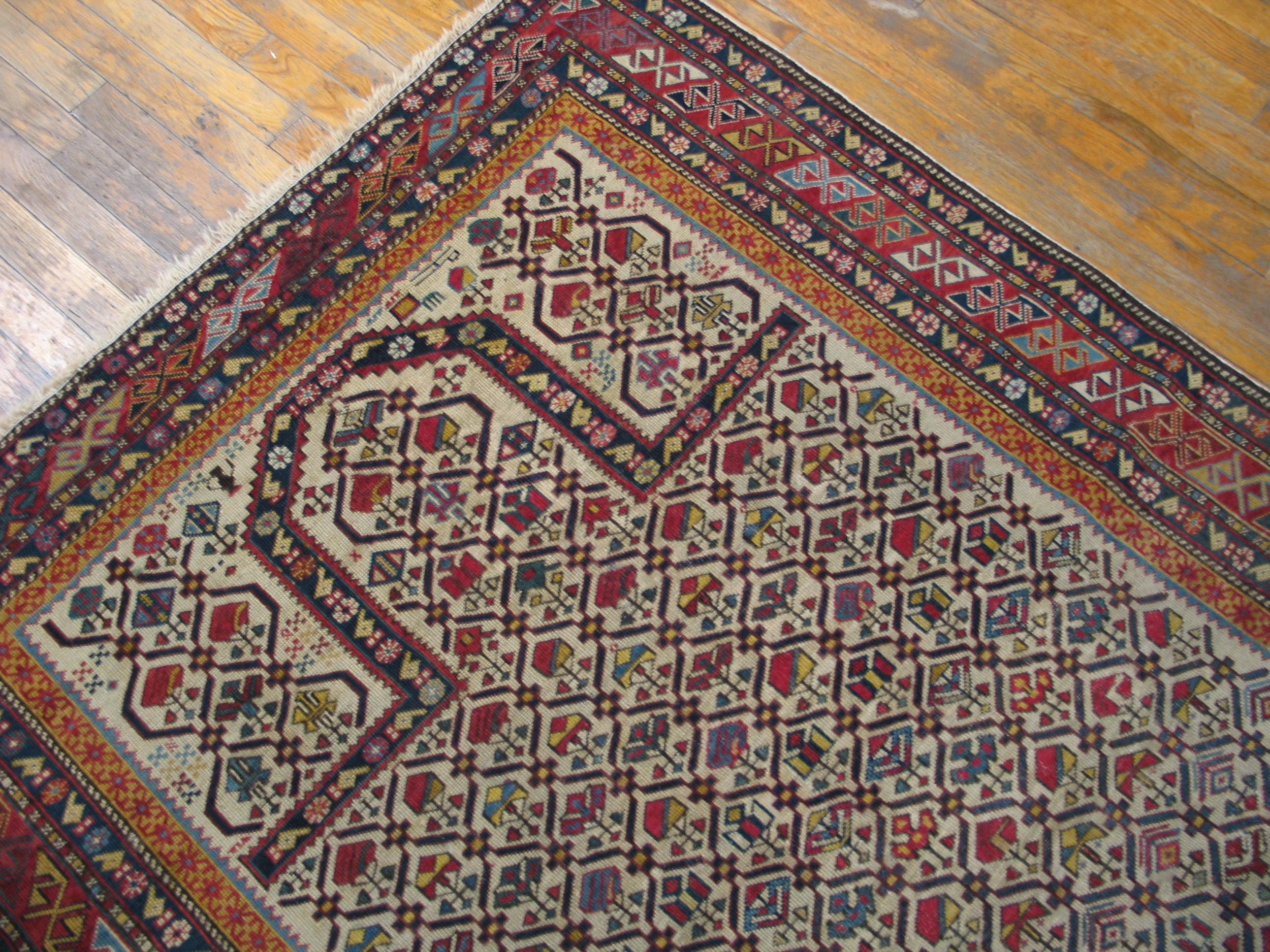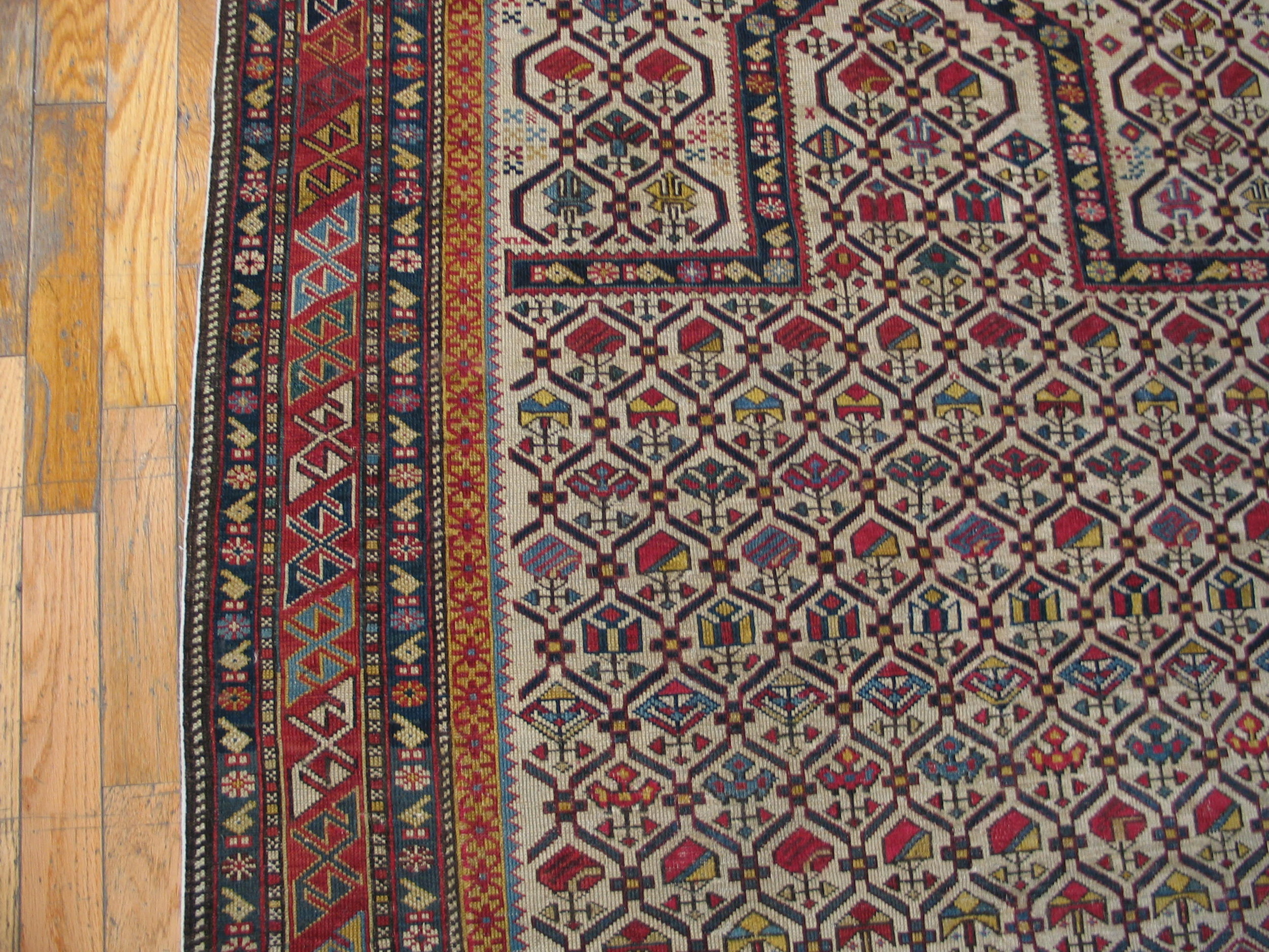 Antique Caucasian Caucasian Ivory 1880s Rug, Circa Date: 1880s. This exquisite example of 19th-century weaving showcases the rigorous geometric precision characteristic of the Caucasian tradition. The design, executed with remarkable clarity, utilizes a rich palette of natural dyes set against a luminous ivory ground.