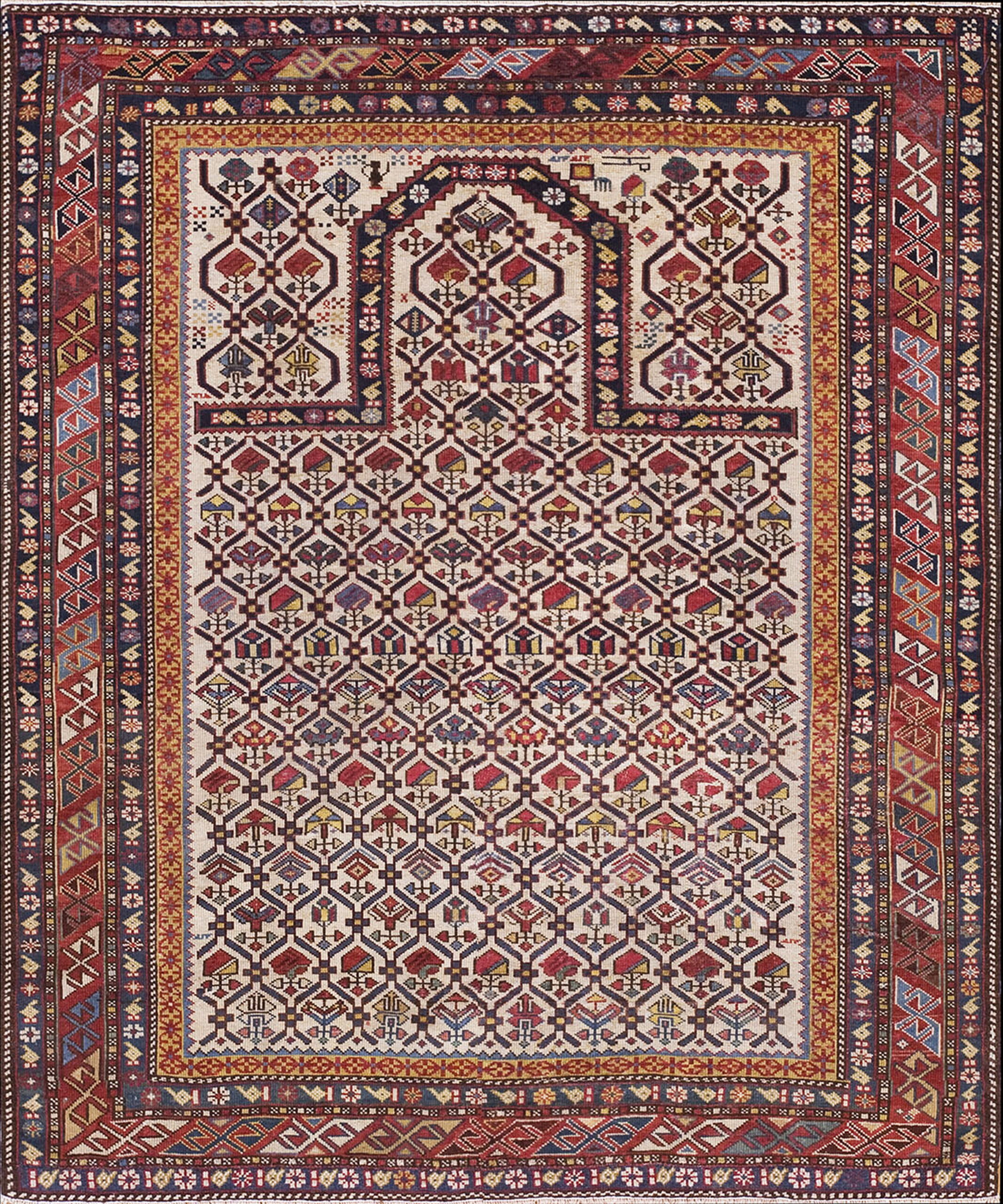The central field is dominated by a striking ivory background, which provides a brilliant contrast to the saturated madder reds, deep indigo, and vibrant saffron accents used in the intricate motifs. This careful use of color highlights the complexity of the lattice structure and the weaver’s mastery of the dye process.