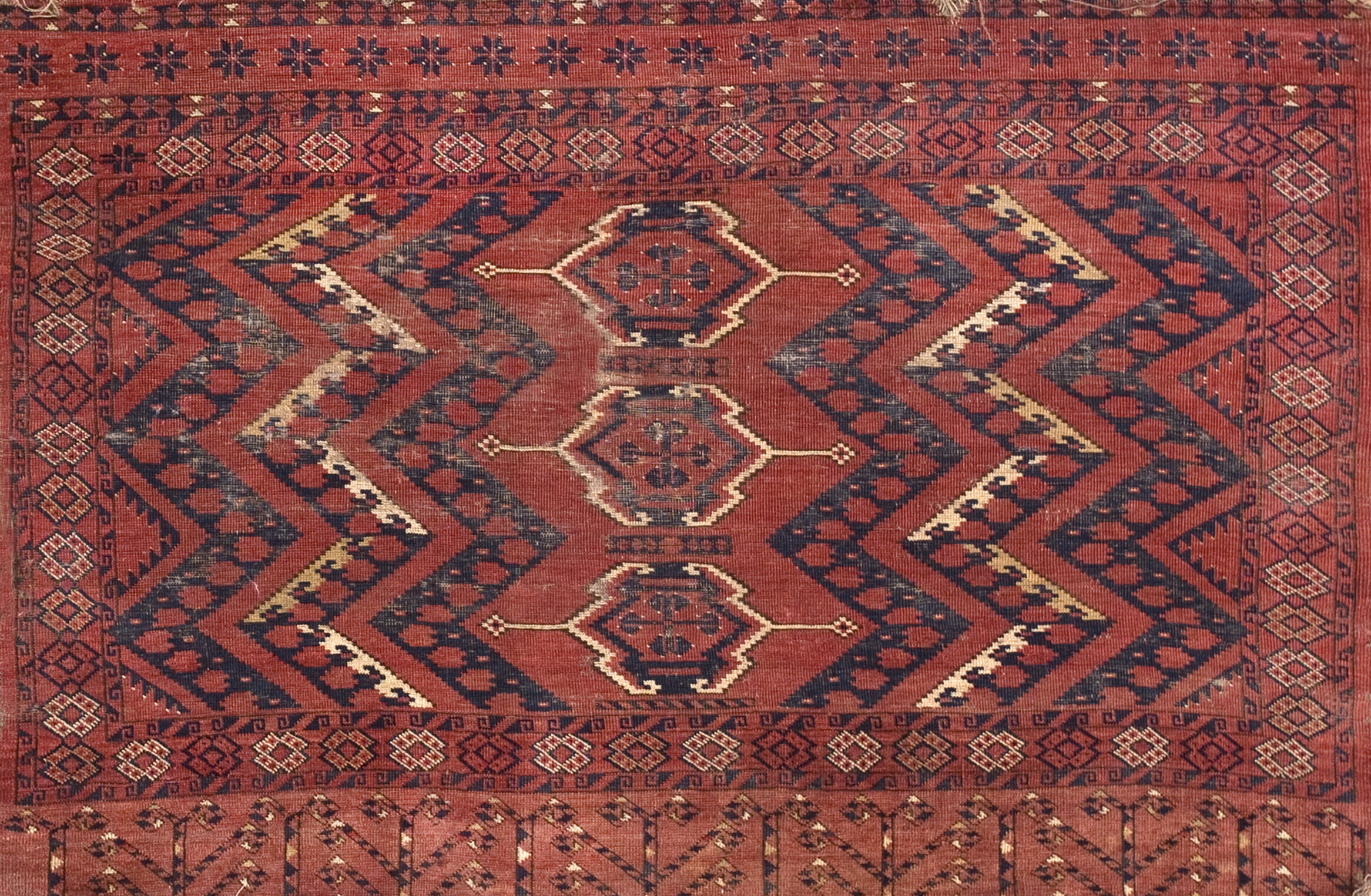 The field is anchored by a series of bold, serrated medallions arranged in a dynamic, repeating allover pattern. These large-scale motifs are interspersed with smaller, intricate geometric elements, creating visual depth and movement typical of weavings intended for daily nomadic life.