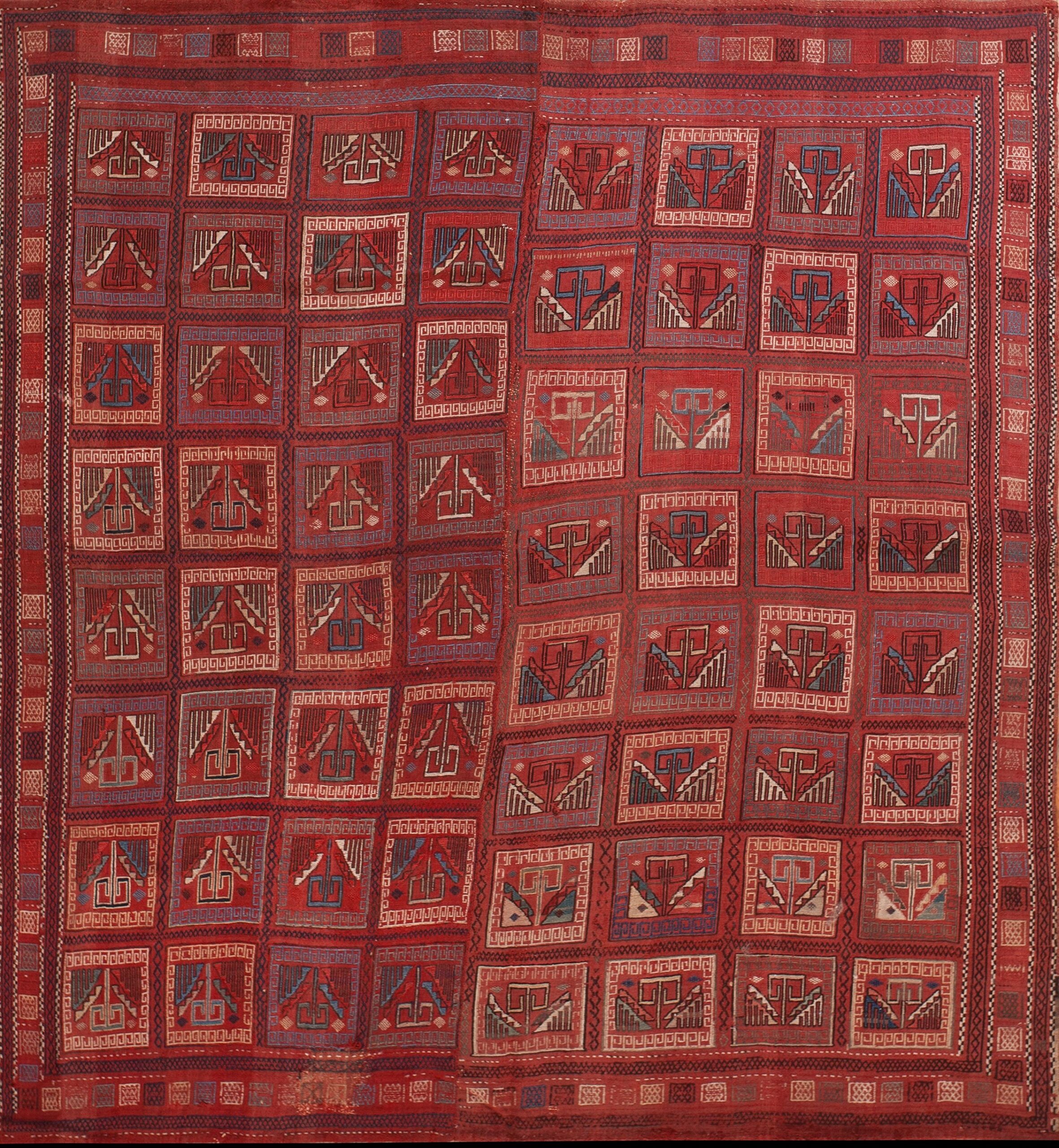 This late nineteenth-century Caucasian flat woven Verneh kilim rug is a masterpiece of nomadic tribal art, representing one of the most technically demanding and symbolically rich traditions of the South Caucasus. Unlike standard slit-weave antique kilims, the Verneh (or Varni) is a specialized “brocaded” flat-weave, often associated with the Karabagh or Shusha regions, prized for its structural density and its role as a dowry piece for tribal elites.