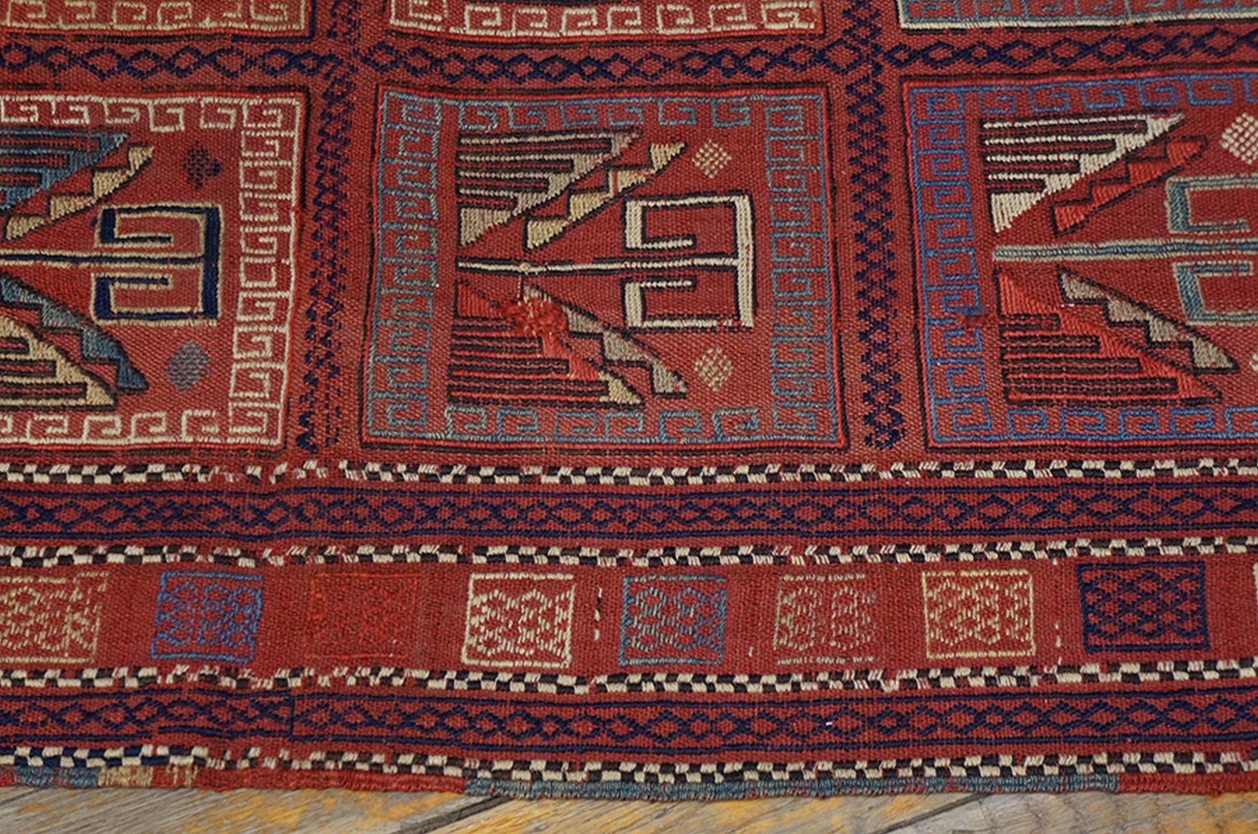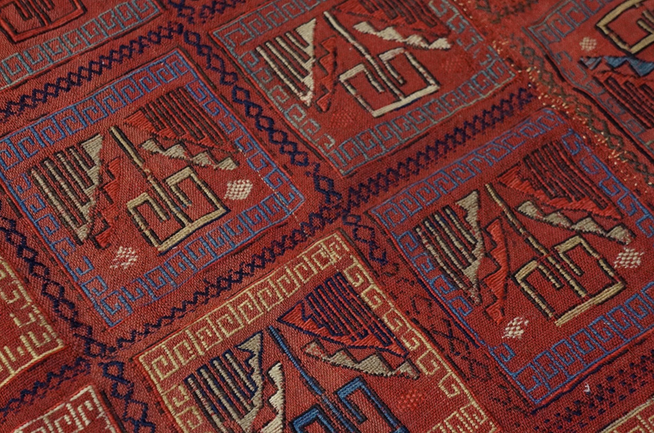 Technically, the Verneh is distinguished by its extra-thread wrapping (soumak) technique. While the base is a flat-weave, the decorative motifs are “brocaded” onto the surface, creating a slightly raised, embroidered texture that gives the square shape area rug a substantial, “meaty” handle. This technique makes the antique tribal area rug significantly heavier and more durable than a standard kilim, allowing it to lay perfectly flat on the floor with a “leathery” drape. The wool used is high-altitude, hand-spun yarn, rich in natural lanolin, which provides a matte, organic luster.