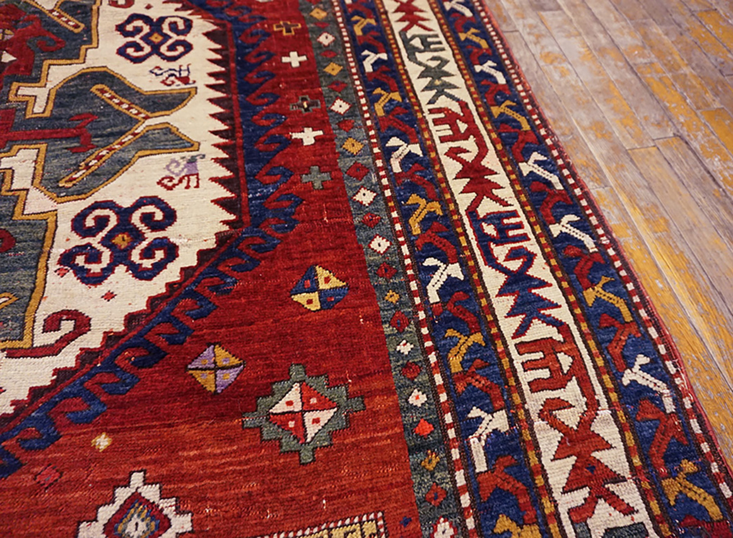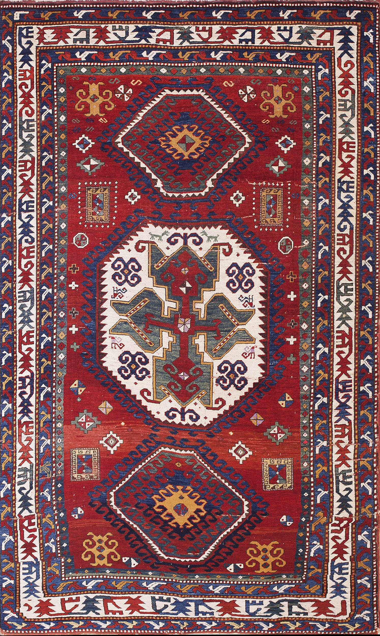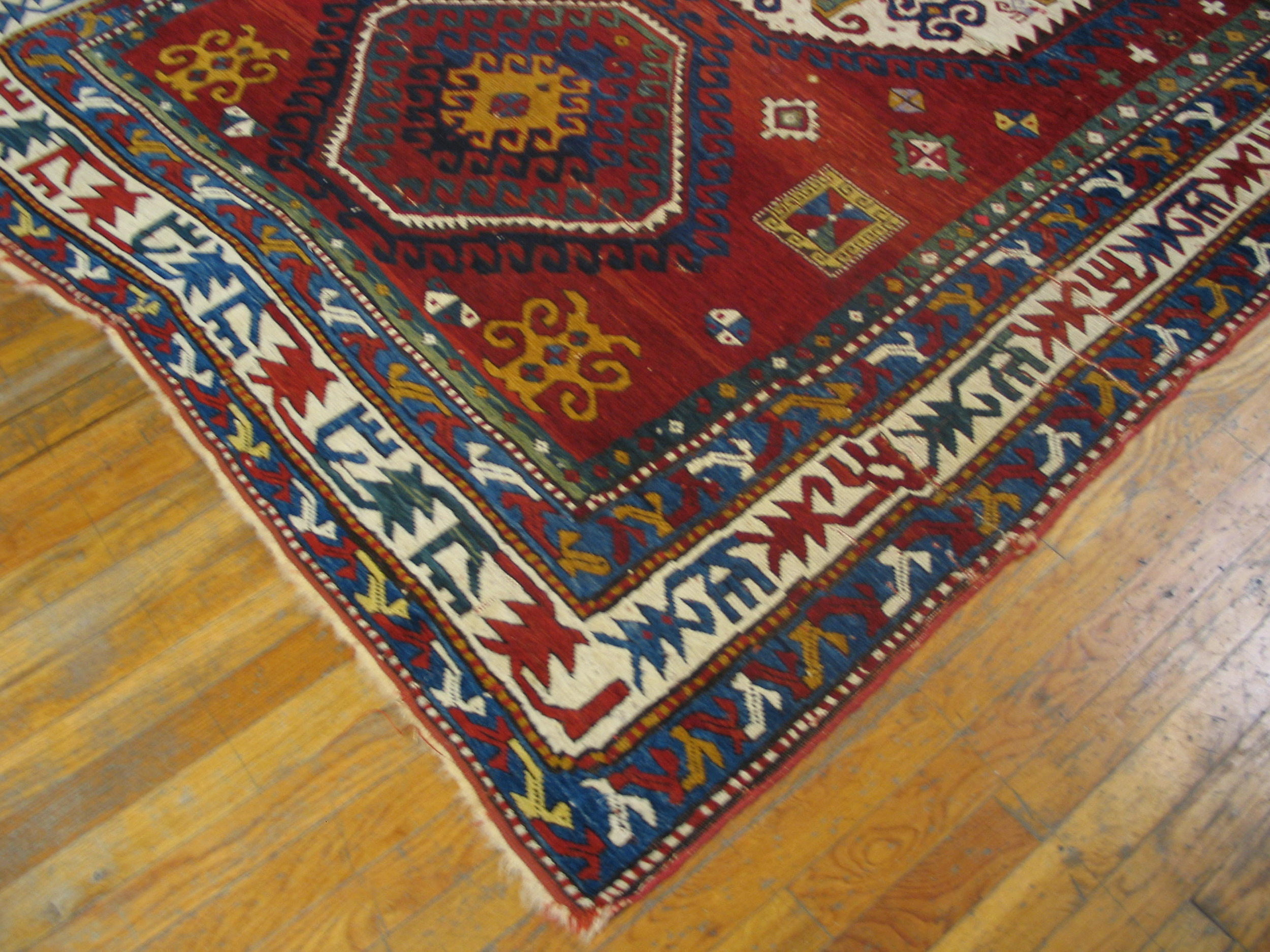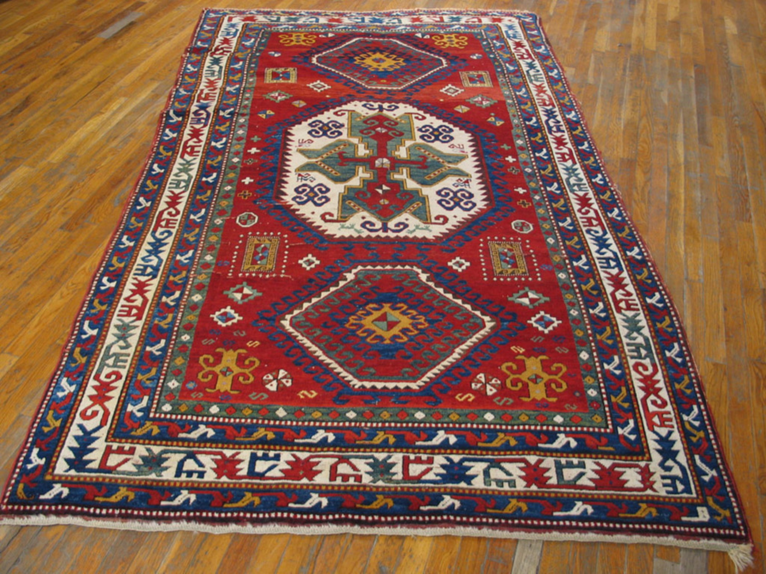 Tribal Antique Geometric Medallion Wool Hand Knotted Pile Caucasian Lori Pambak Rug, Circa Date: 1880s. This exceptional late 19th-century piece exemplifies the robust artistry characteristic of antique rugs from the Caucasus region. Its dense wool pile and saturated, naturally dyed palette speak to its enduring quality and tribal origin.