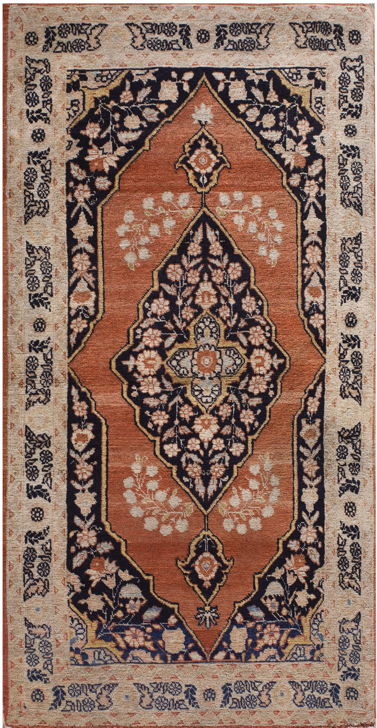 The highly stylized central medallion features dense, midnight blue and black fields, intricately detailed with pale gold and cream accents. This complex structure is defined by classic Persian floral rugs motifs, including delicate vine work and blooming palmettes, which contrast sharply against the deep ground colors.