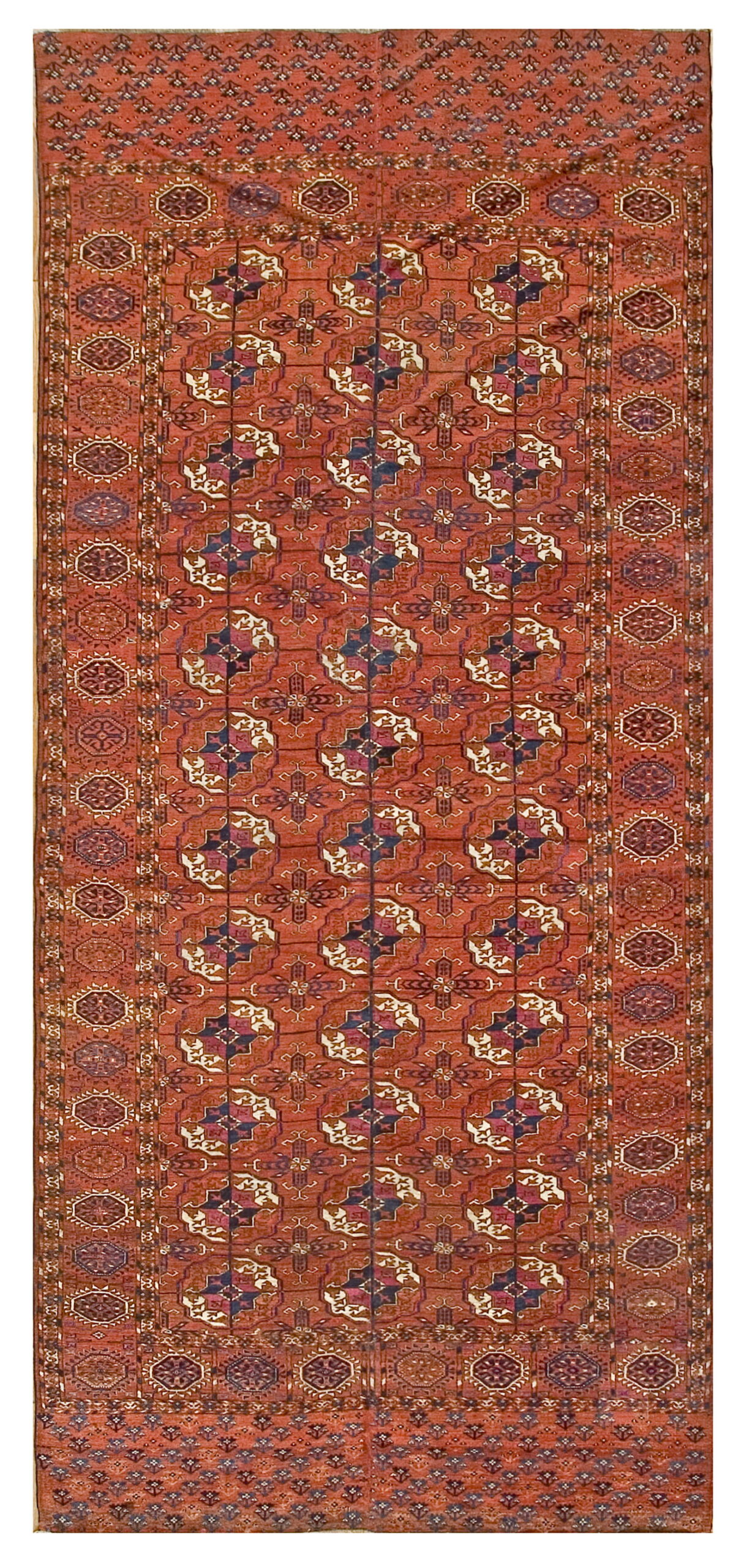 The field is dominated by a rich, saturated tone, a deep terracotta or rust that borders on salmon coral pink color rugs, achieved through masterful natural dyeing techniques. The repetitive main carpet design features the iconic Tekke *gul*—a complex, quartered octagonal medallion—executed in indigo, ivory, and deep crimson accents. This dense, mesmerizing structure is typical of the finest antique rugs produced by these Central Asian artisans.
