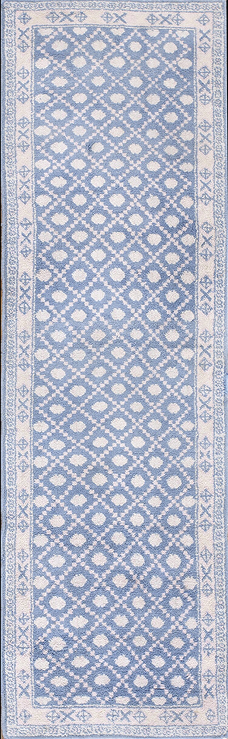 The color palette is composed of a soft, faded denim blue ground juxtaposed with crisp ivory and cream detailing. This high-contrast pairing ensures the geometric motifs remain sharp and visually compelling, lending a fresh, almost modern sensibility to a rug created nearly a century ago.