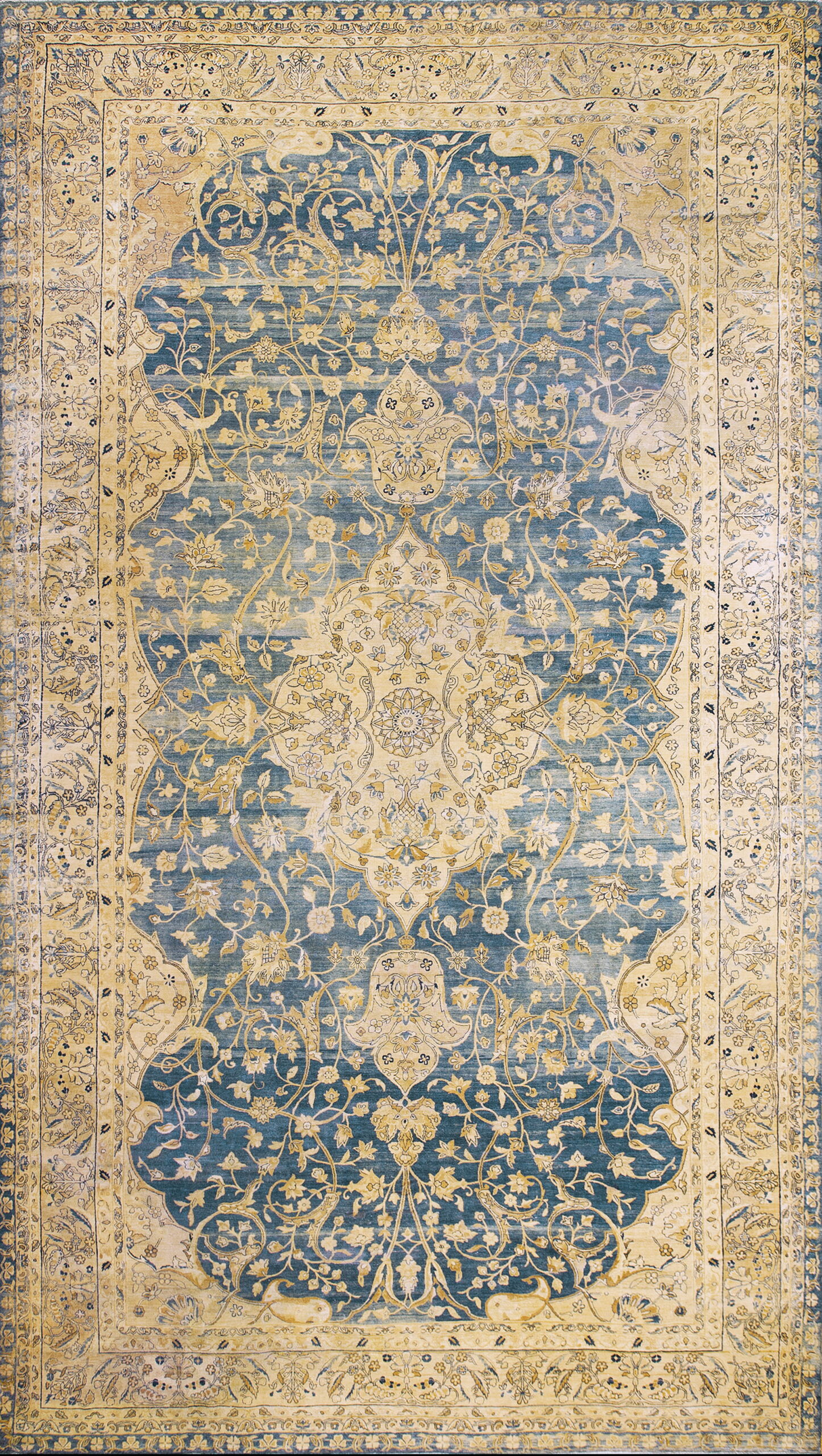 The palette is dominated by a striking central medallion and corresponding spandrels set against a deep, variegated blue color field. This saturated tone contrasts beautifully with the soft ivory and gold detailing of the intricate vine work and palmettes. The quality of the dye work and the complexity of the pattern reflect the enduring artistic heritage of its Iranian / Persian origin.