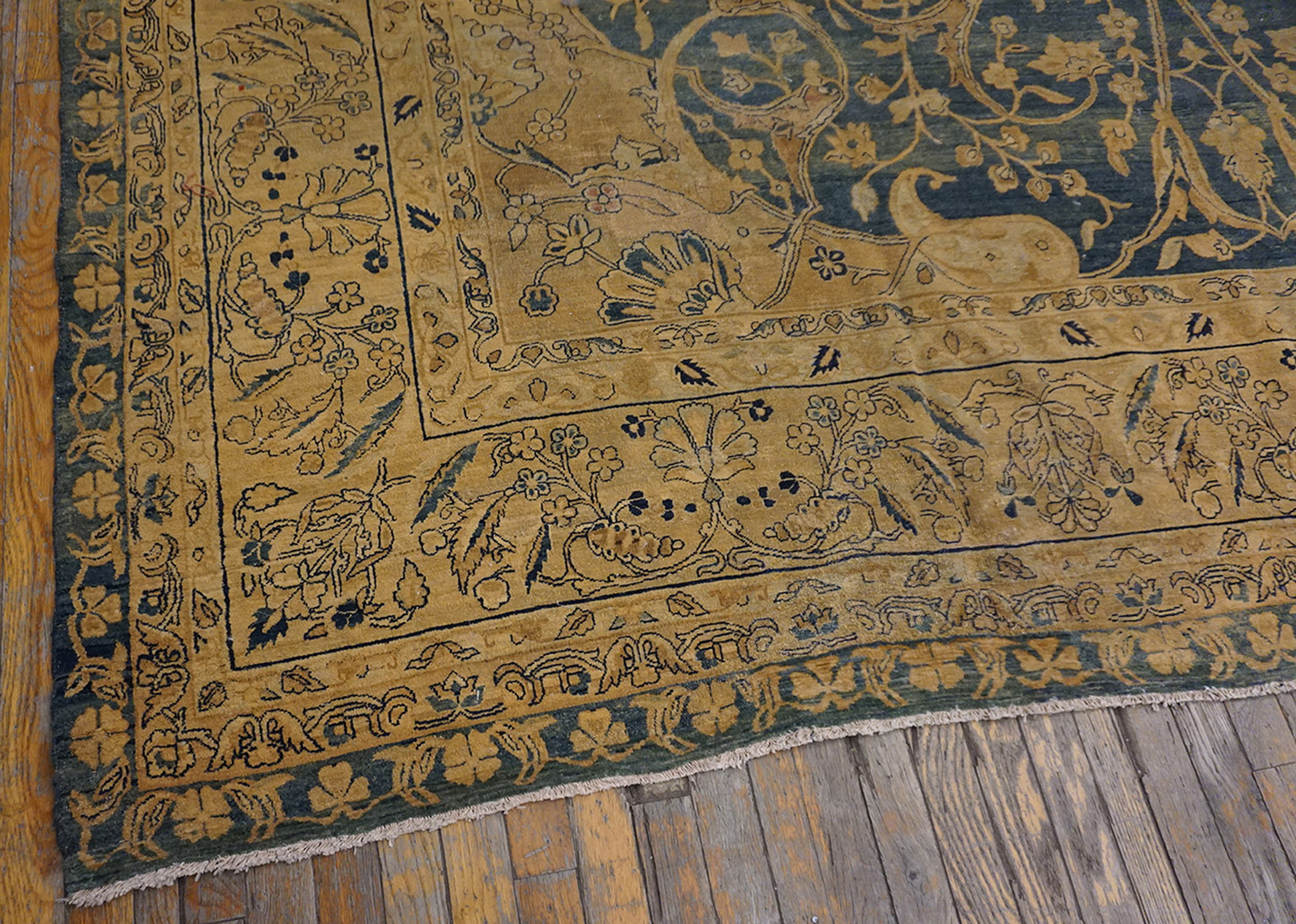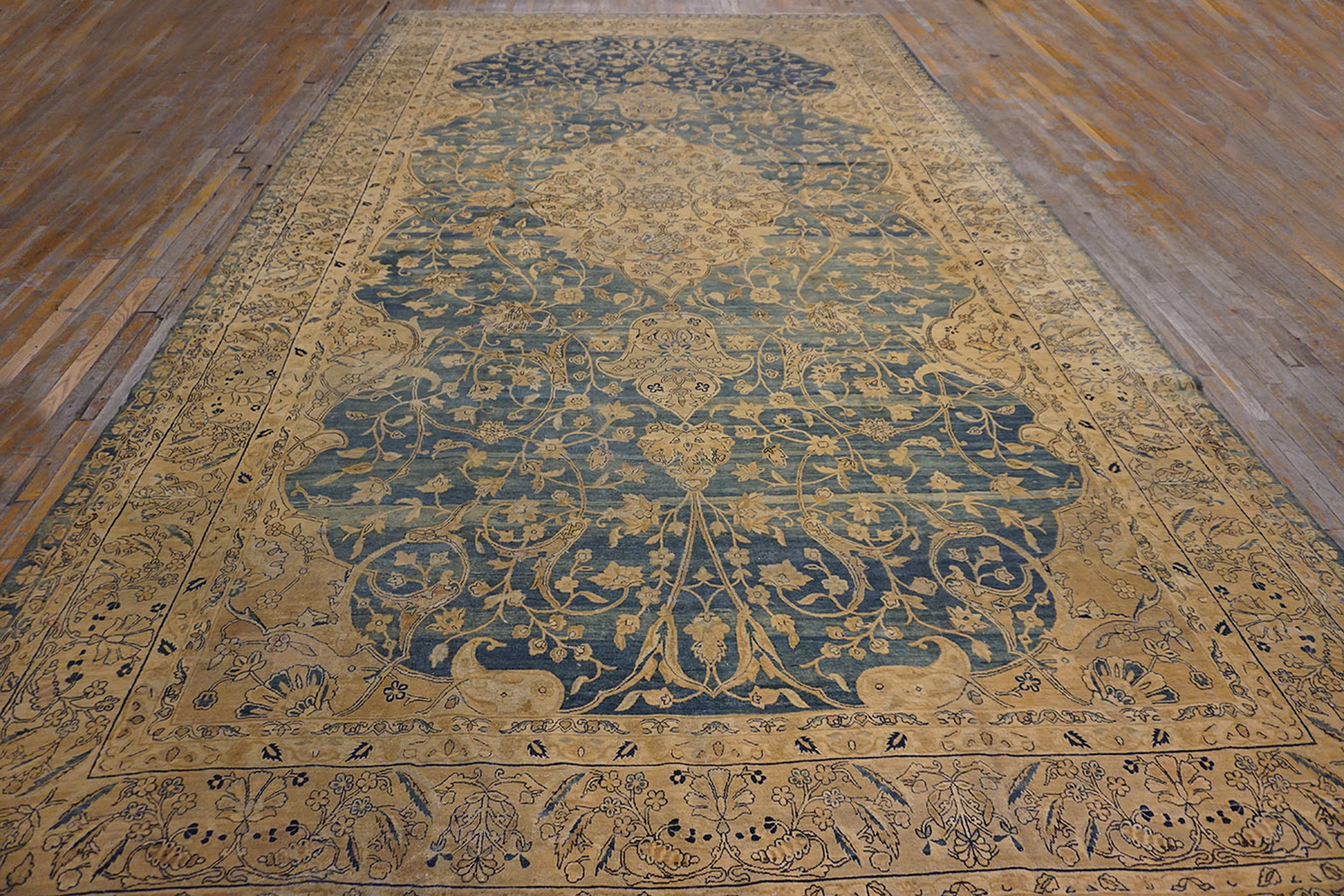 Antique Kerman Large Room Size Wool Blue Rug, Country of Origin: Iran / Persia, Circa Date: 1920s. This exceptional example of kerman rugs presents a sophisticated design characteristic of early 20th-century weaving. The wool pile is finely knotted, showcasing the high technical skill for which the region is renowned, and retains a remarkable softness despite its age.