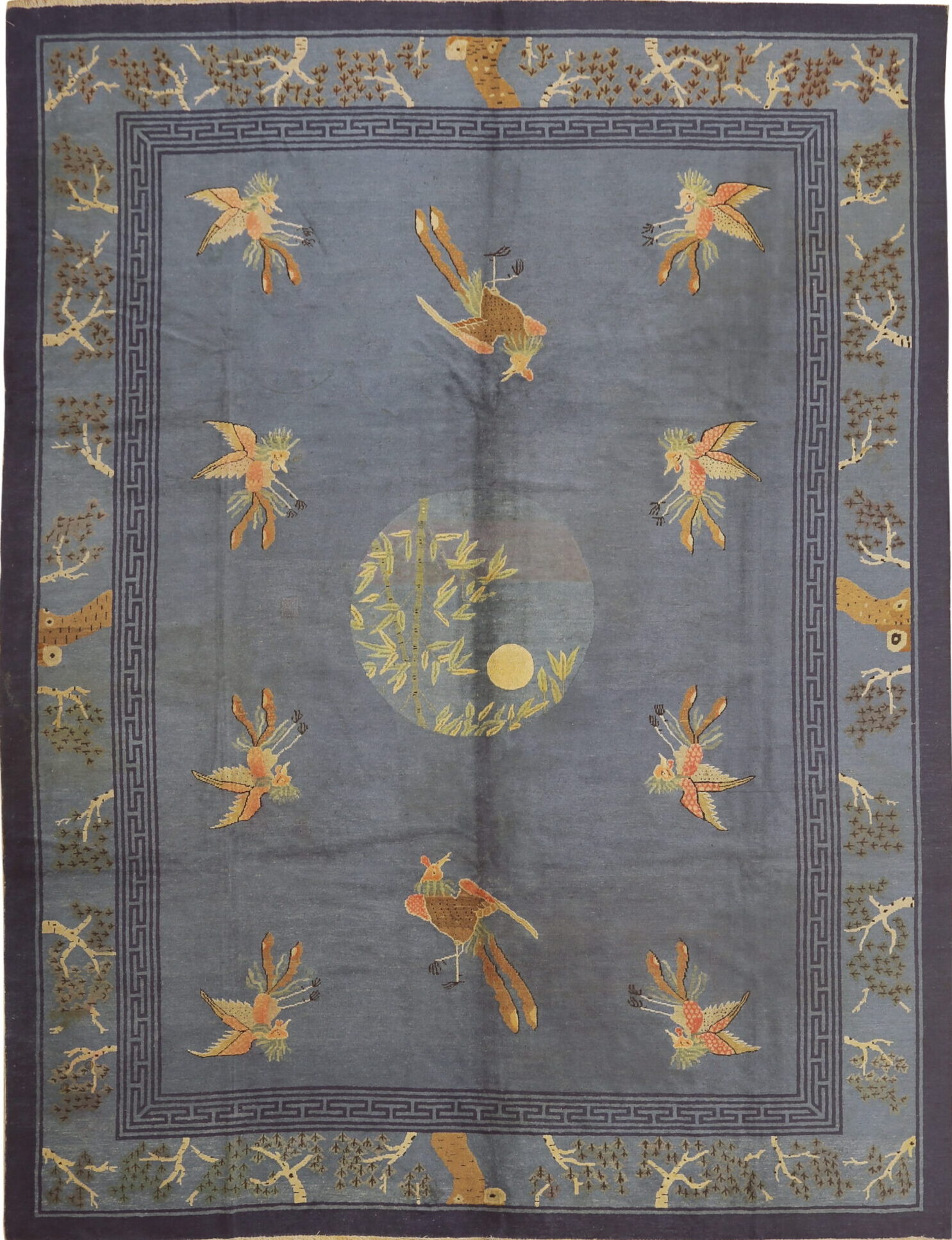 The design eschews the dense patterning of Western carpets, favoring an open, ethereal composition featuring stylized mythical fowl that appear to float across the field. These naturalistic elements, along with the central circular medallion, align this piece with traditional floral rugs and nature-inspired Chinese iconography.