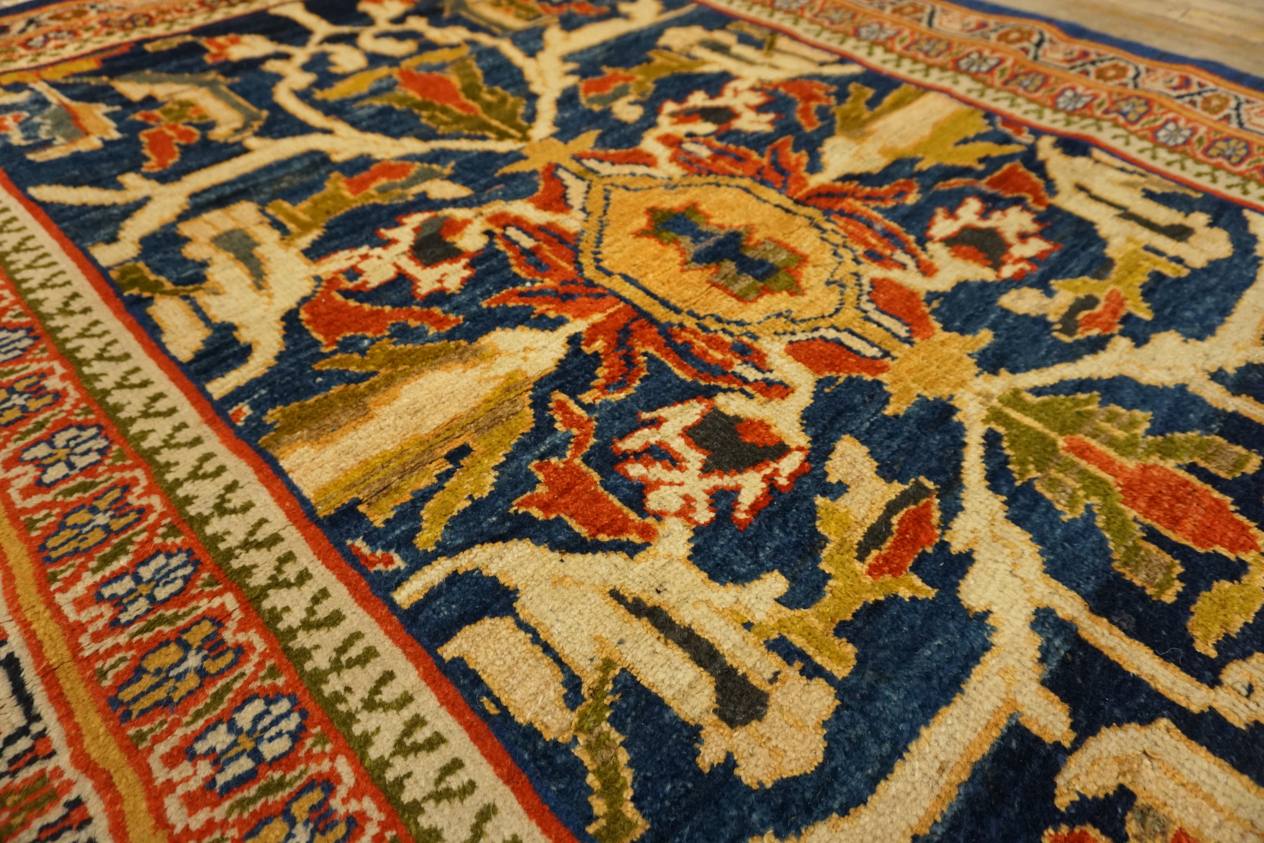 The deep indigo field provides a striking canvas for the highly articulated design, a hallmark of the finest blue color rugs. Large, stylized palmettes and delicate scrolling vines in ivory, ochre, and madder red traverse the central axis. This dramatic contrast ensures the piece retains visual impact even when viewed along the length of a corridor.