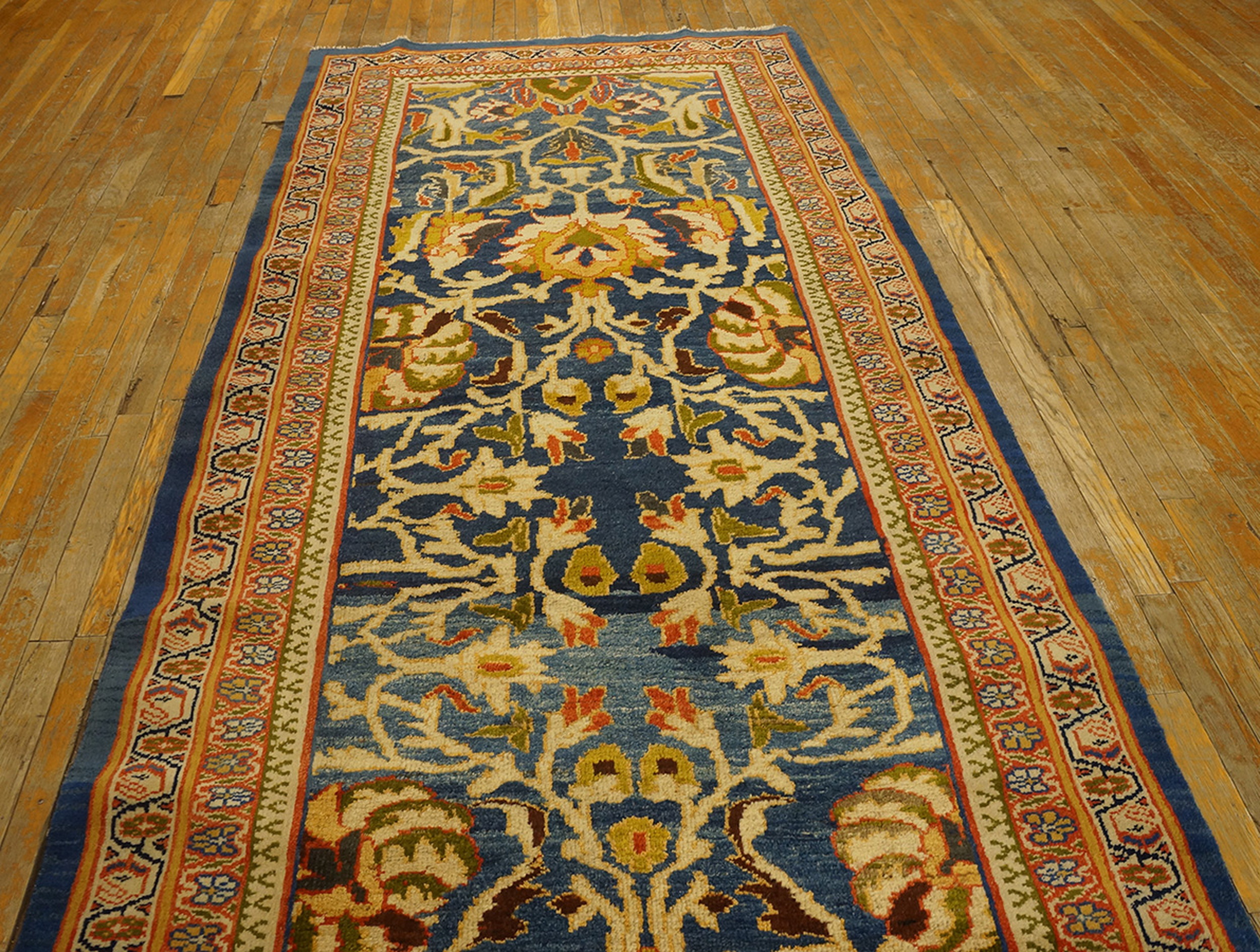 Antique Sultanabad Hallway Runner Wool Blue Rug, Country of Origin: Iran / Persia, Circa Date: 1880s. This magnificent example of 19th-century weaving showcases the grand scale and sophisticated palette characteristic of Sultanabad rugs. Woven during a period of artistic revival, this piece exemplifies the finest traditions of Iranian / Persian rugs, designed to complement the expansive interiors of the Victorian and Edwardian eras.