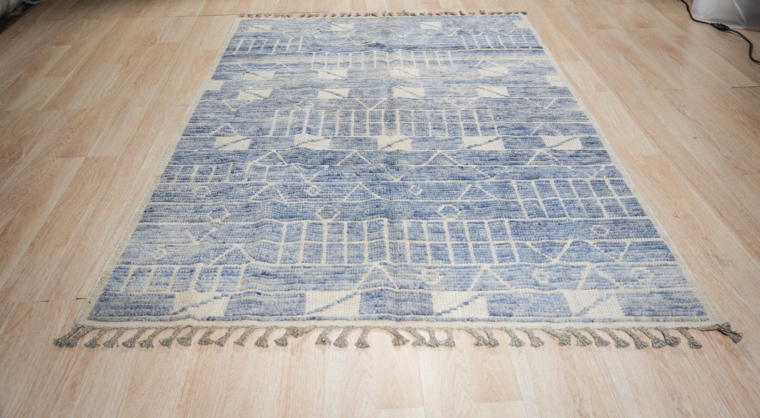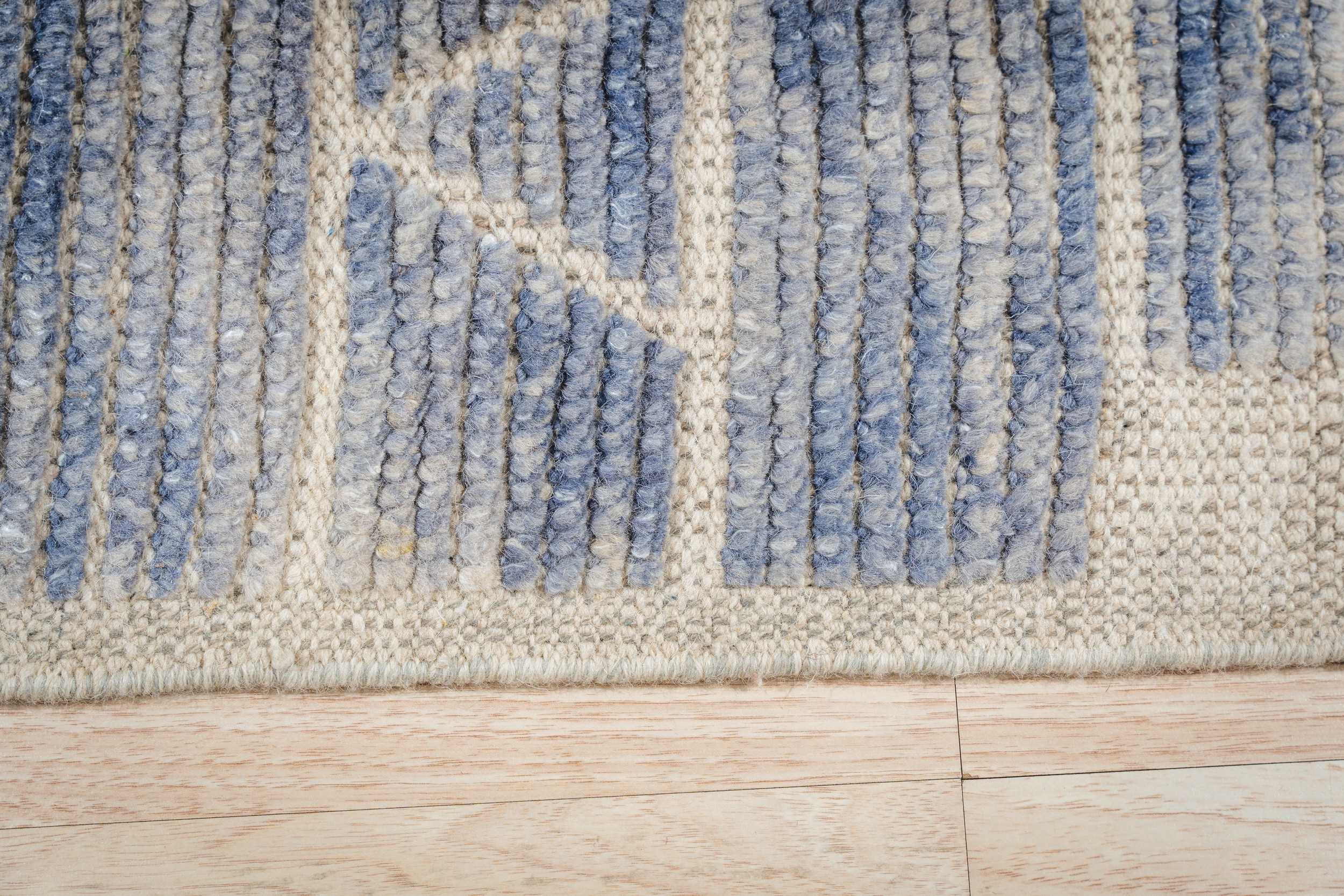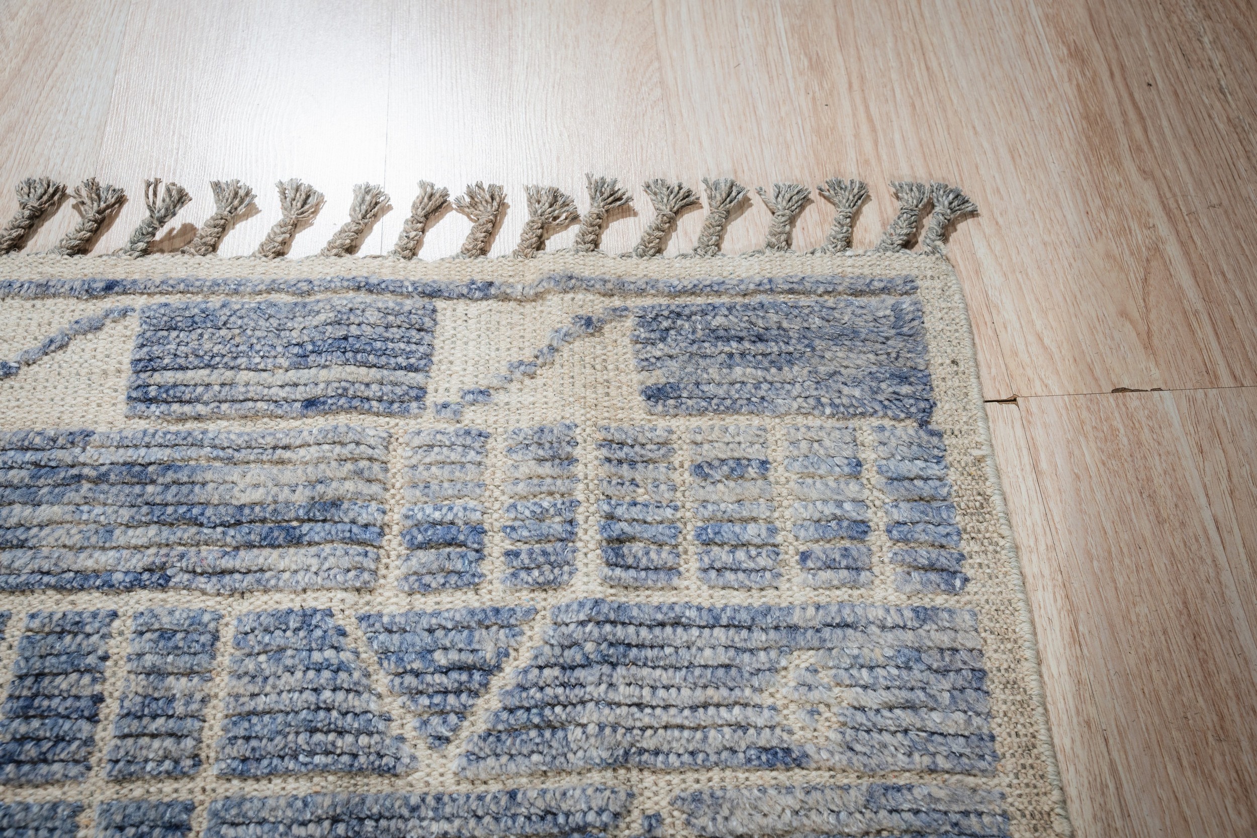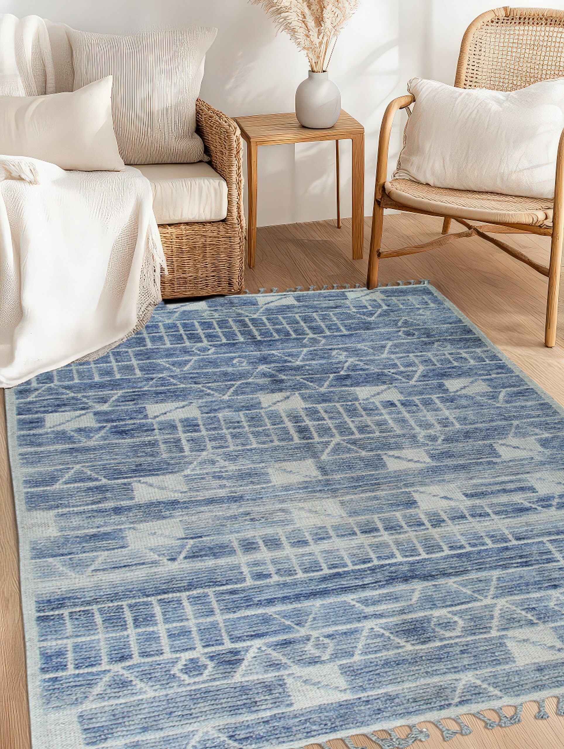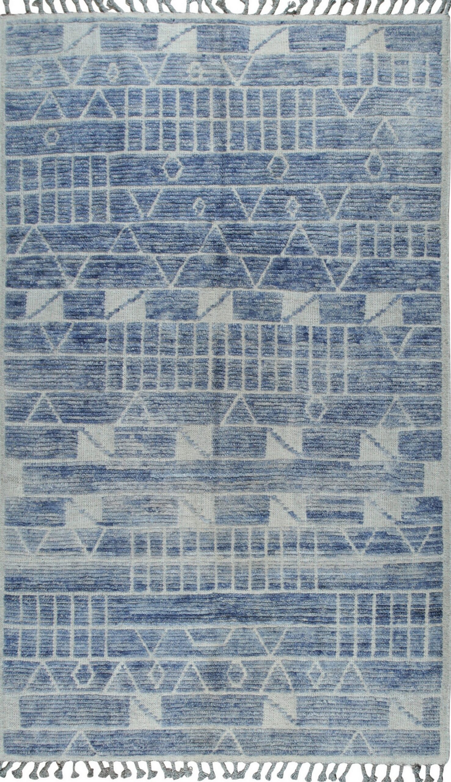 Elegant Marrakech Blue Hand-Knotted Wool Berber Carpet, Country of Origin: Pakistan. This stunning piece is crafted from high-quality, hand-knotted wool, offering a plush texture and exceptional durability. Its design is decidedly modern, representing the finest in new area rugs that blend tribal inspiration with minimalist geometry.