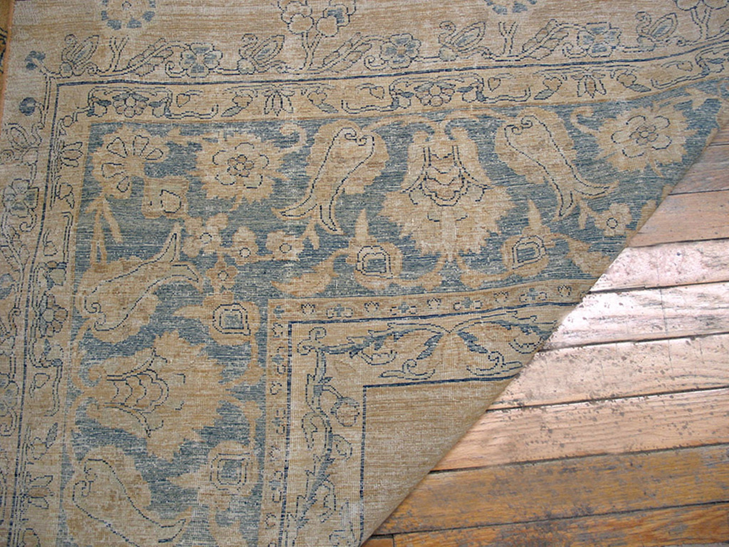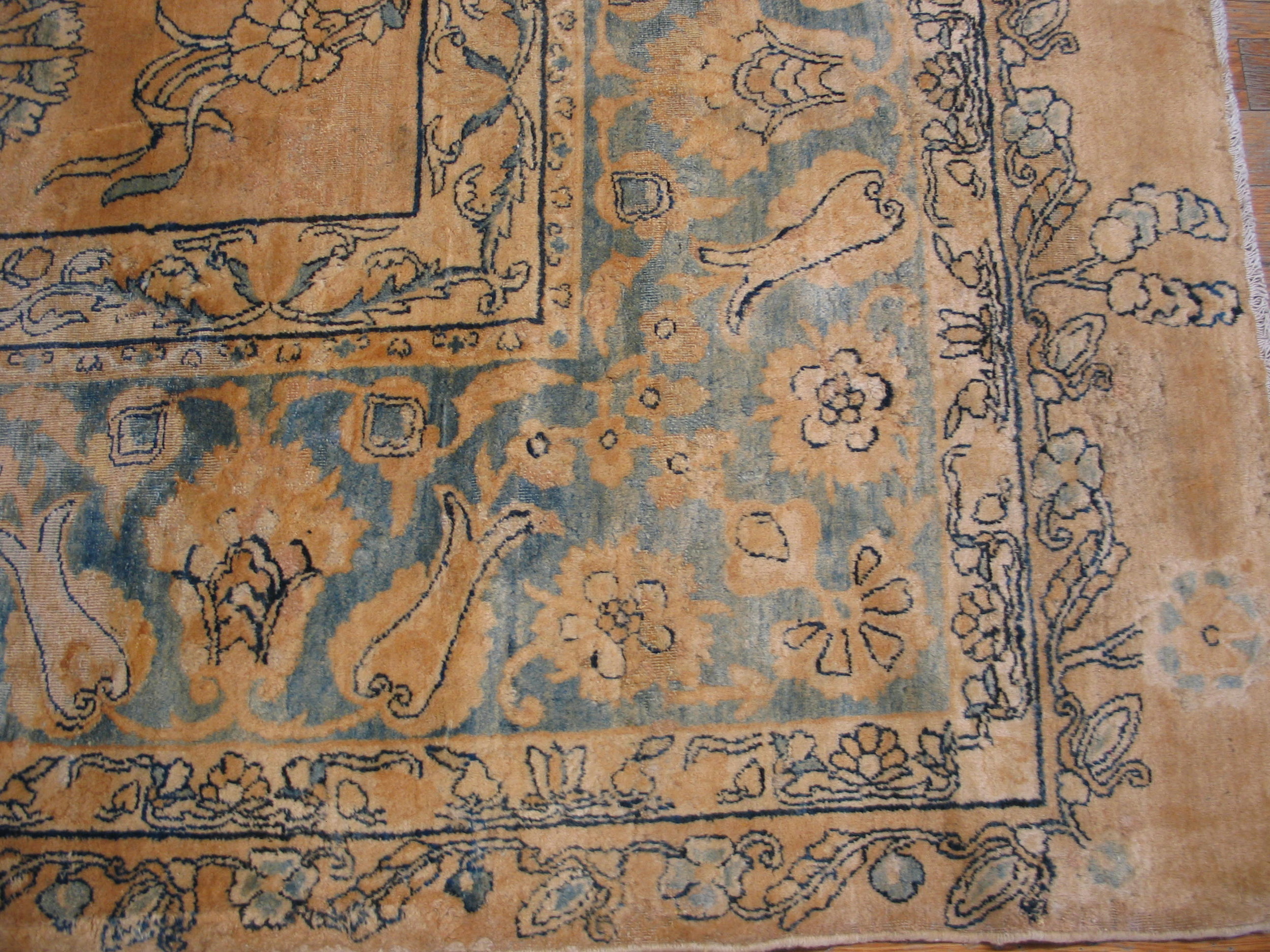 The palette is remarkably restrained and sophisticated. A soft, luminous field color—described as coral, though faded to a warm, sun-kissed beige—provides a gentle backdrop for the delicate tracery. The secondary color, a deep indigo and powder blue, defines the border and the intricate repeating floral elements, creating a striking contrast that elevates this piece above typical coral color rugs.