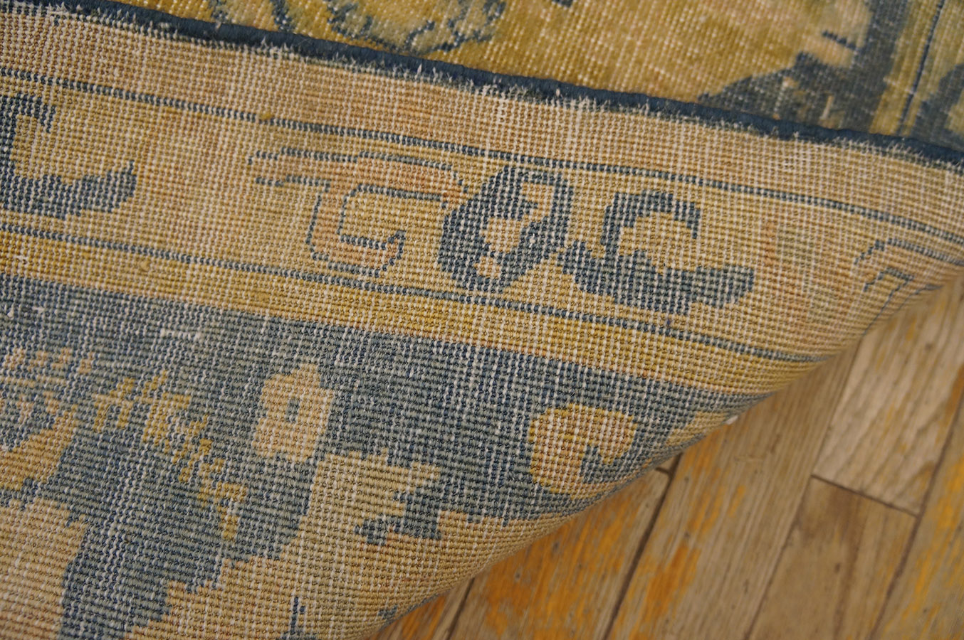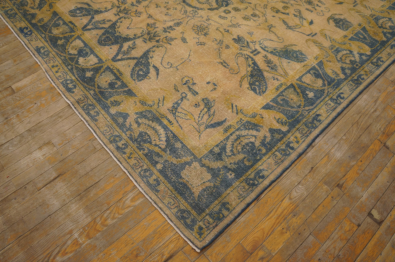 The primary color story is defined by the luminous, aged patina of the ground, which reads as a distressed gold or rich ivory beige color. This intentional fading and abrash enhances the rug’s antique character, allowing the deep, saturated blues of the border and main elements to appear almost ghosted, lending the entire composition a soft, ethereal quality.