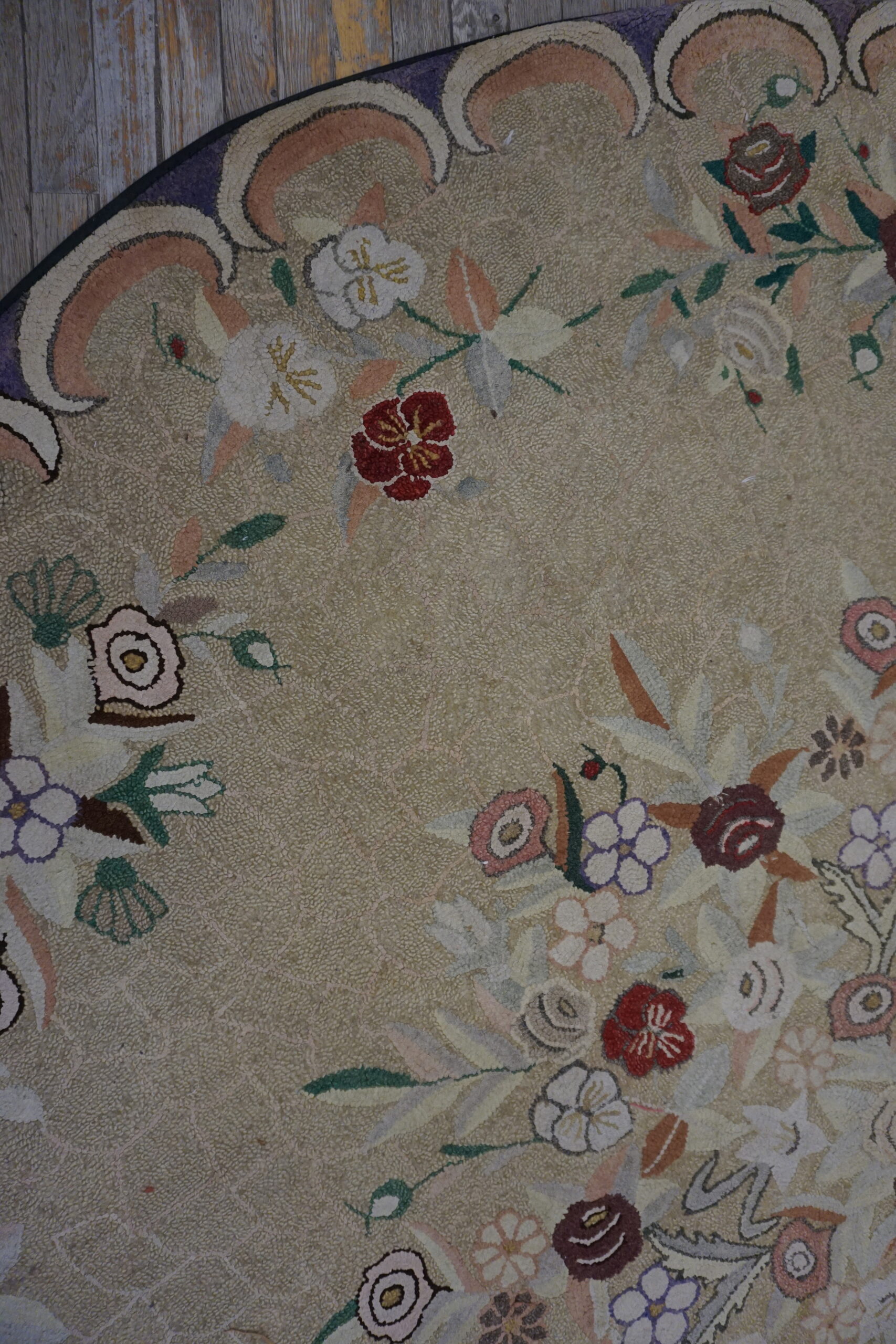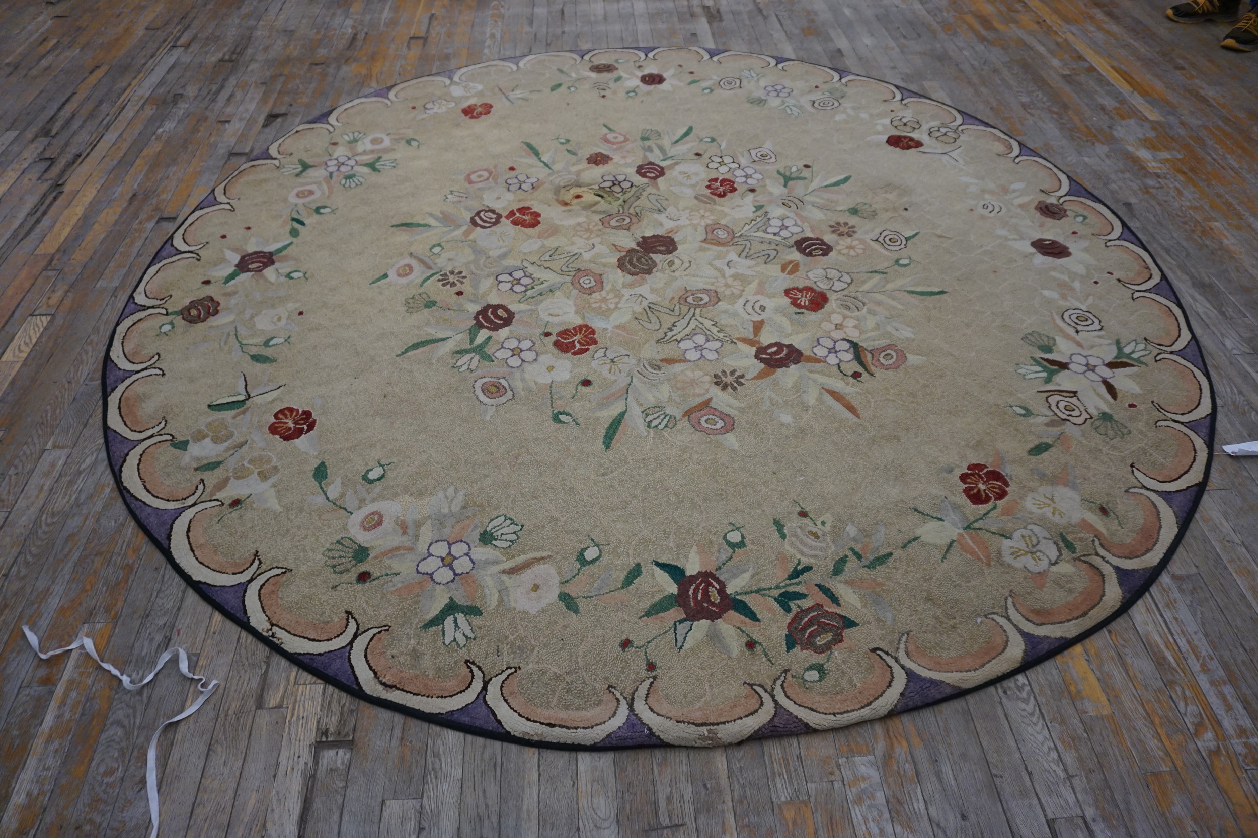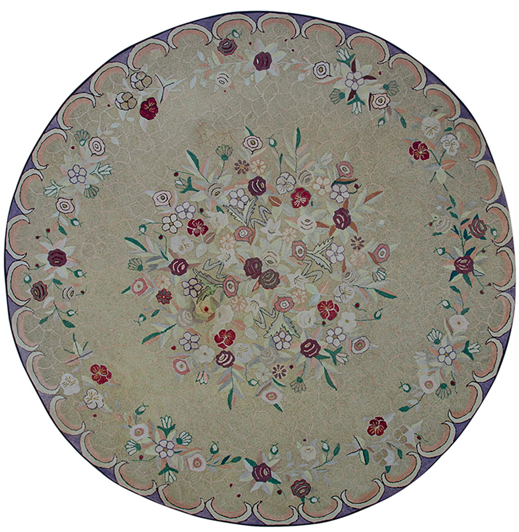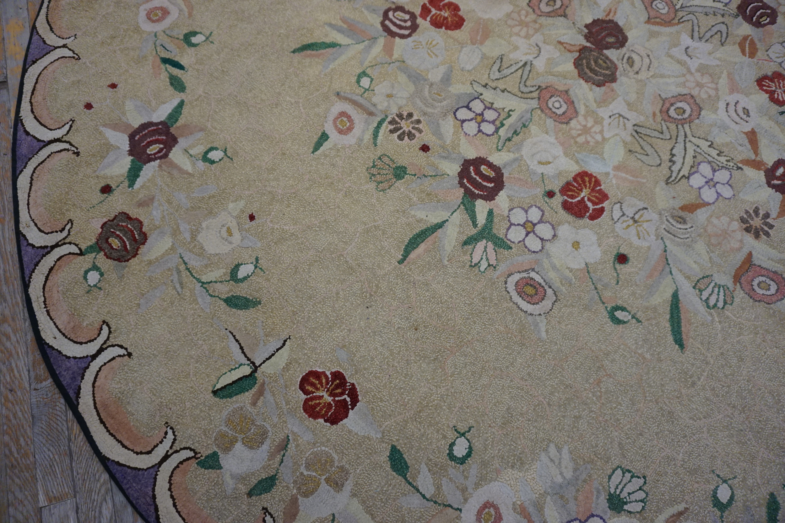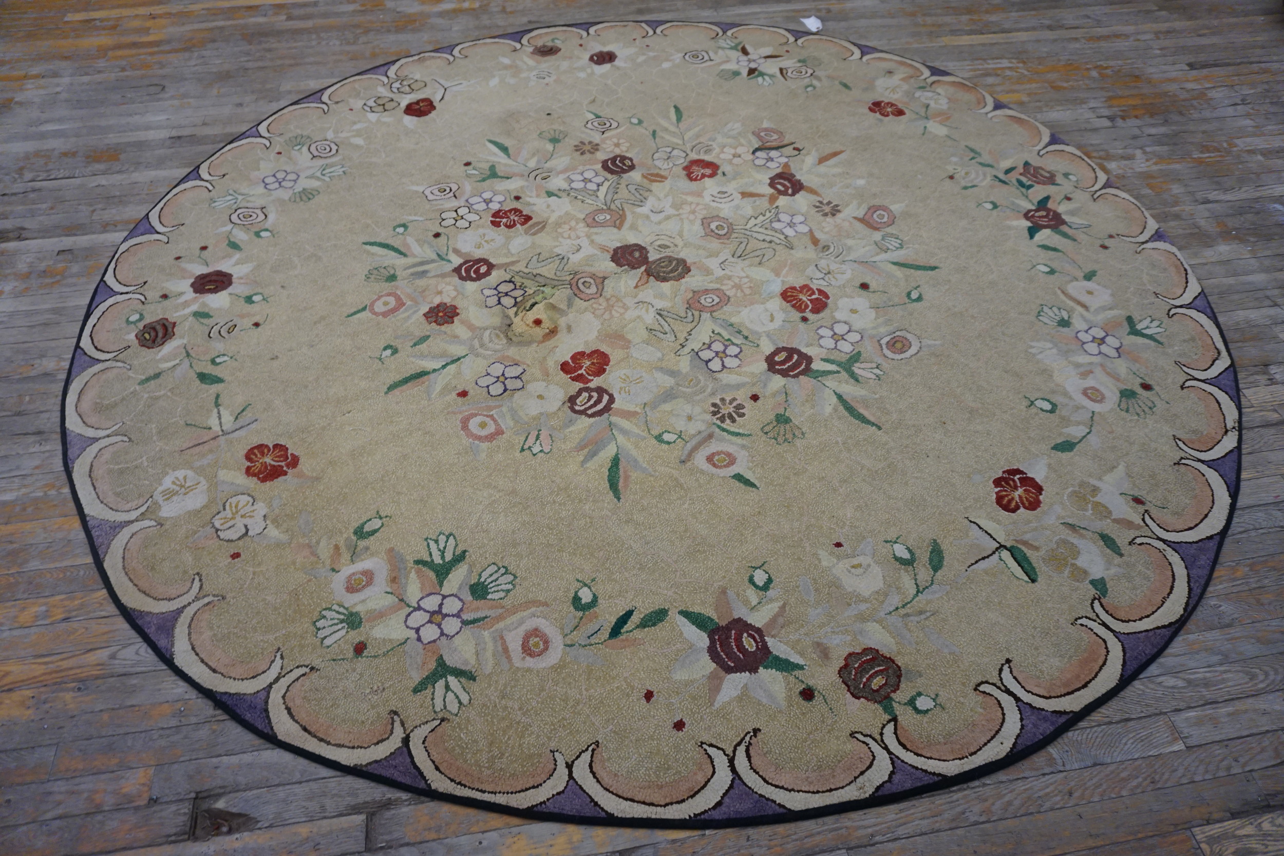 What distinguishes this piece is its perfectly circular format, a highly unusual presentation for a hooked textile of this age and scale, suggesting it may have been commissioned for a specific formal space. While not strictly a traditional room size rug, its diameter commands attention, functioning as a singular artistic statement rather than a typical floor covering.
