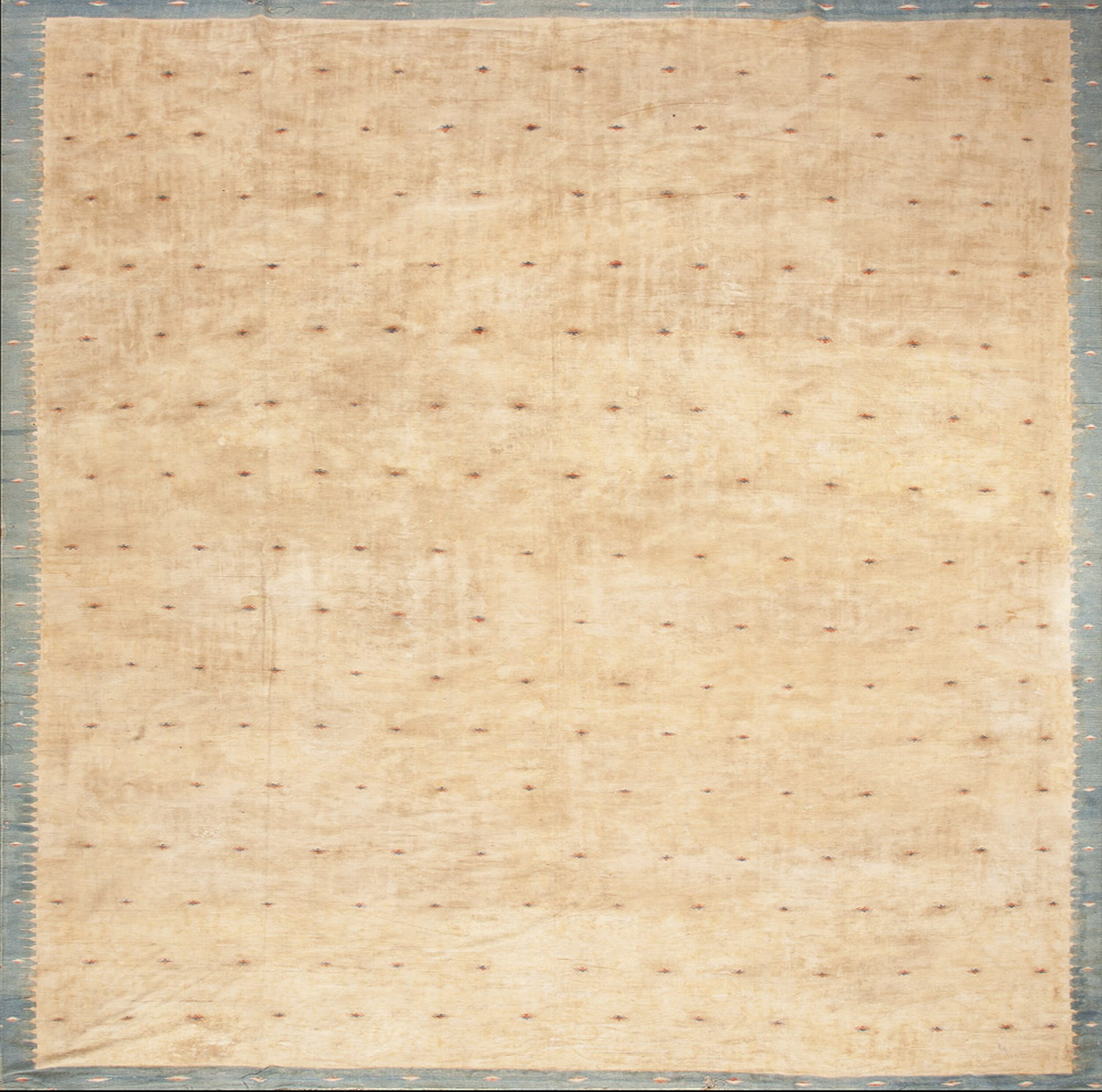 The expansive field is dominated by a gentle, sun-bleached hue, placing it firmly within the category of ivory and beige color rugs. Against this subtly variegated ground, small, stylized diamond motifs—rendered in muted red and blue—are scattered uniformly. This restrained use of color highlights the textile’s impressive scale and its ability to harmonize with diverse interior palettes.