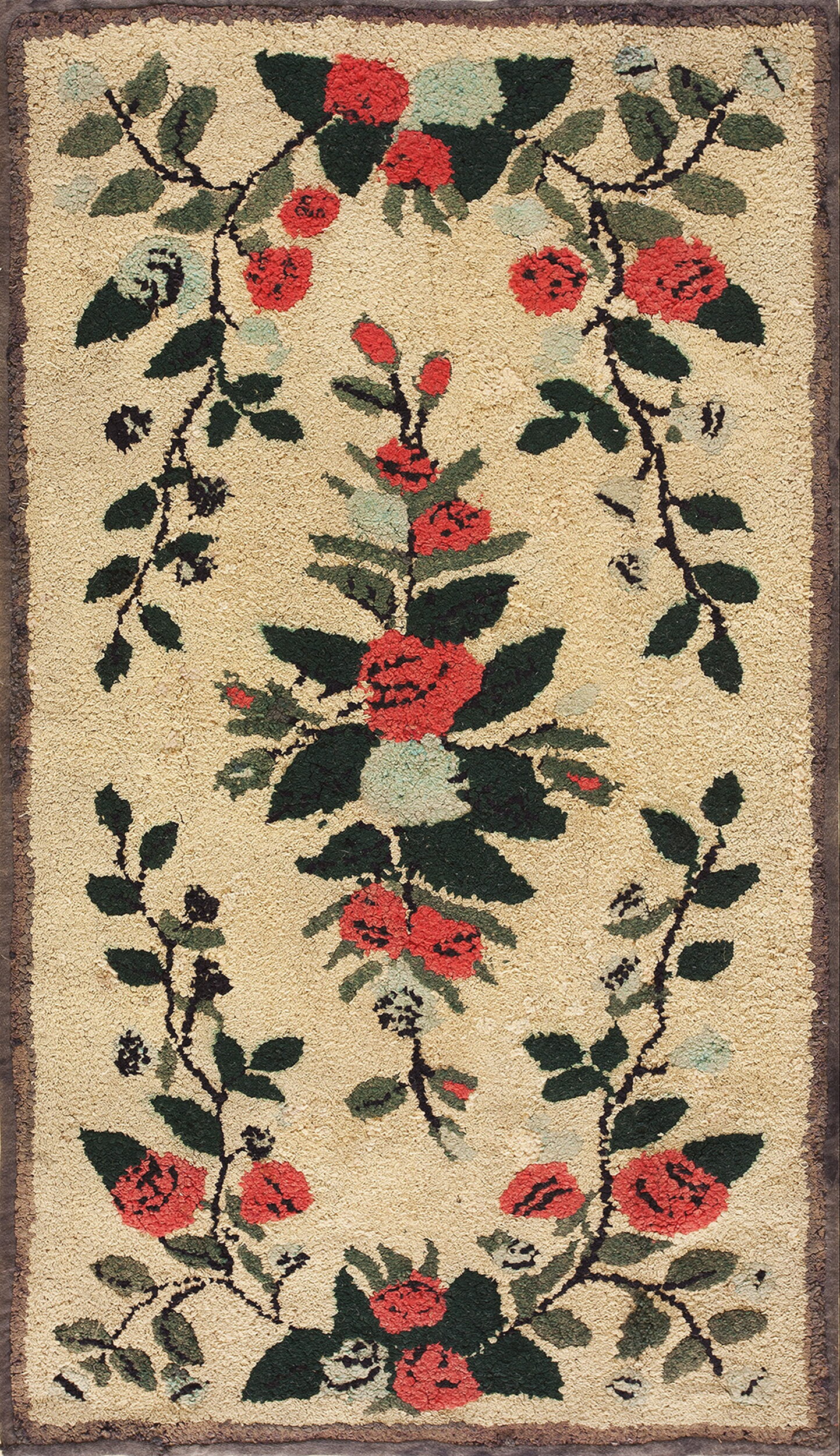 The design is dominated by vibrant floral rugs motifs, featuring deep coral roses and rich green foliage set against a softly textured cream ground. The composition is highly symmetrical, utilizing elegant, curving vines that frame a dense central bouquet, lending a formal balance to the otherwise informal medium.