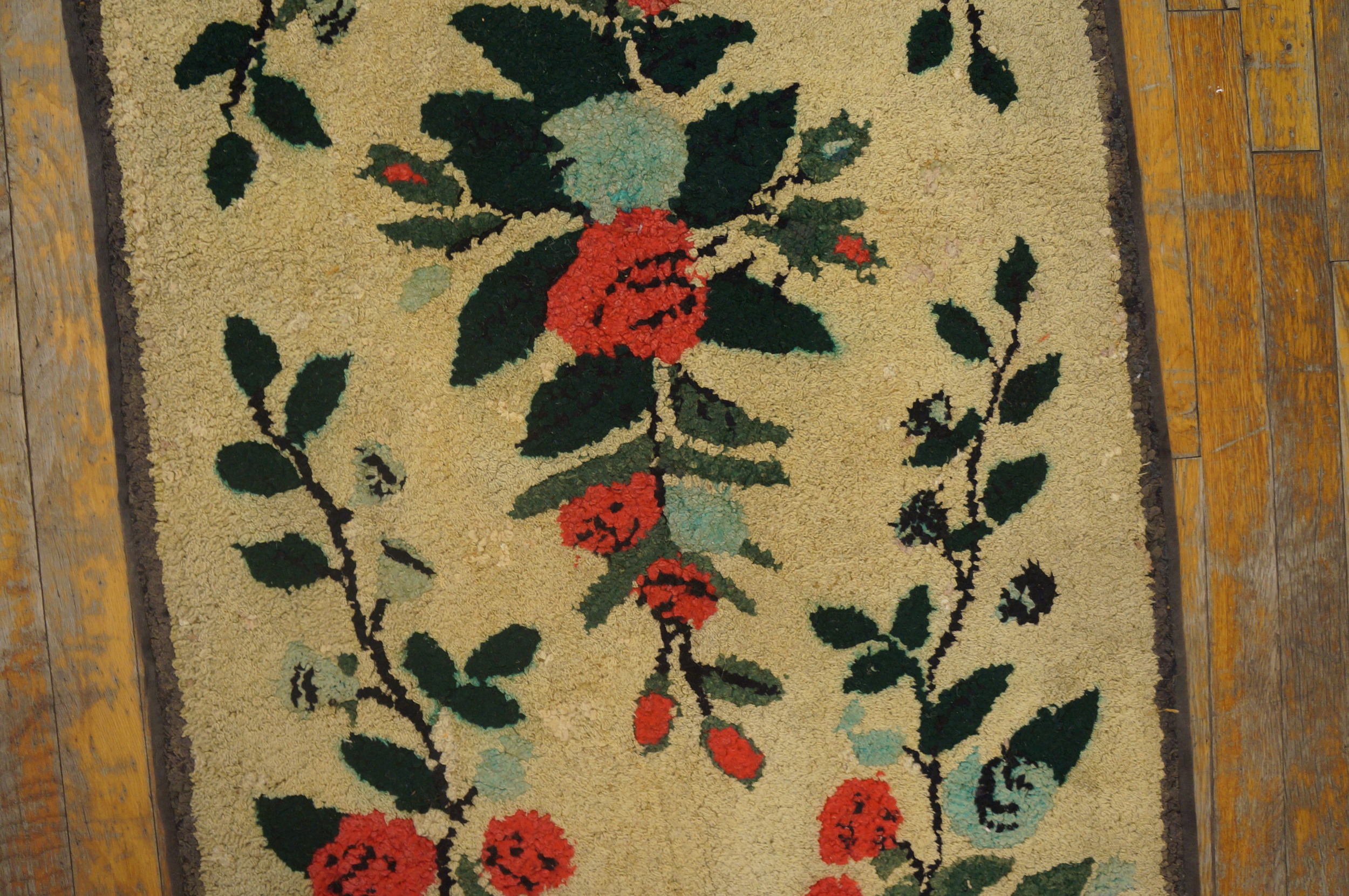 Antique American Hooked Rug American 1940s, Country of Origin: American USA Rugs, Circa Date: 1940s. This charming piece represents the enduring folk artistry prevalent in American USA Rugs during the mid-20th century. The hooked technique gives the surface a delightful, tactile texture, emphasizing its handmade, domestic origins and rustic appeal.