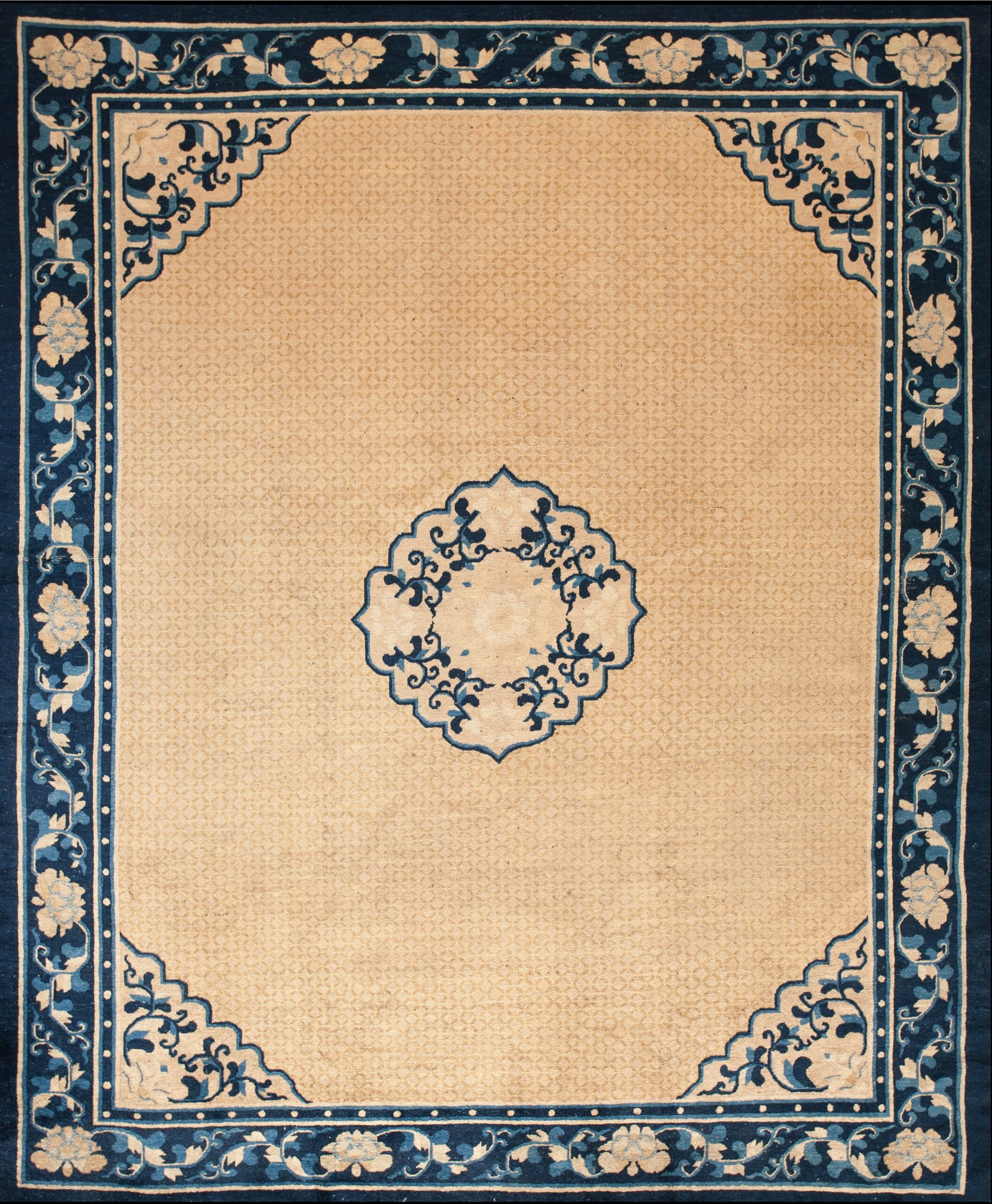 Woven in the remote region of Ningxia, this carpet exhibits the robust, high-quality wool and careful knotting characteristic of imperial-commissioned pieces. Its generous proportions classify it as a true room size piece, ideal for anchoring a sophisticated drawing-room or library. The natural dyes have mellowed beautifully over 170 years, lending the surface a soft, luminous patina that only genuine age can impart.