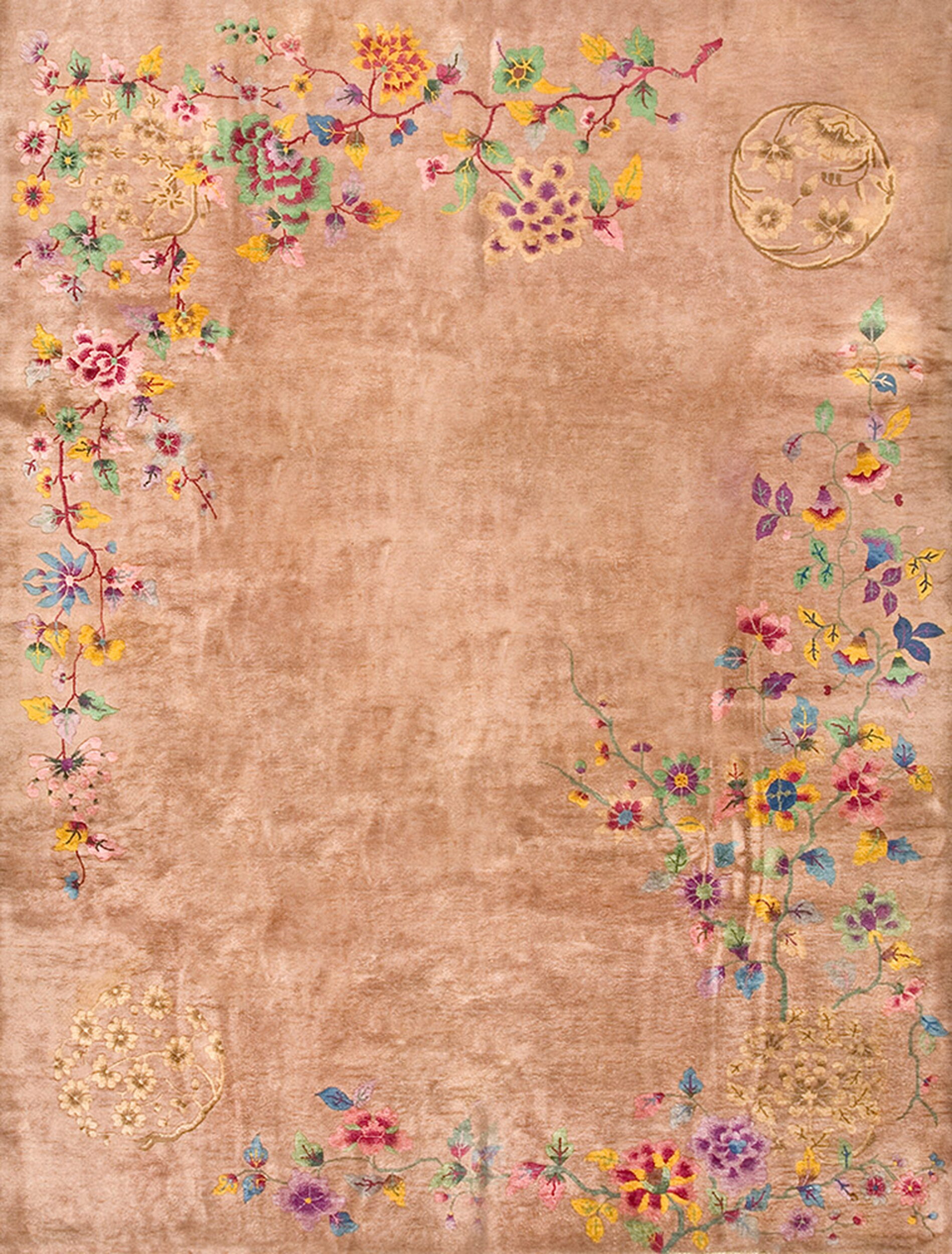 Antique Chinese – Art Deco Chinese Coral 1930s Rug, Circa Date: 1930s. This exceptional piece exemplifies the height of 1930s Chinese Art Deco production, merging traditional Eastern aesthetics with the bold, modern sensibilities of the West. It is a stunning example among our collection of antique rugs, showcasing the shift toward open fields and vibrant, painterly borders characteristic of the era.